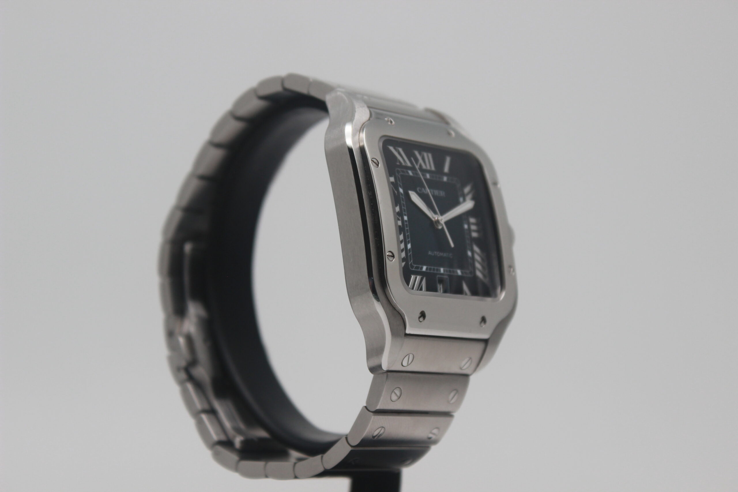 Cartier Santos De Cartier “Blue Dial” WSSA0030, steel case 39.8 x 40 mm, blue dial with Roman numerals, steel bezel, steel bracelet with steel folding clasp. Includes leather strap. Complete with original Cartier box.