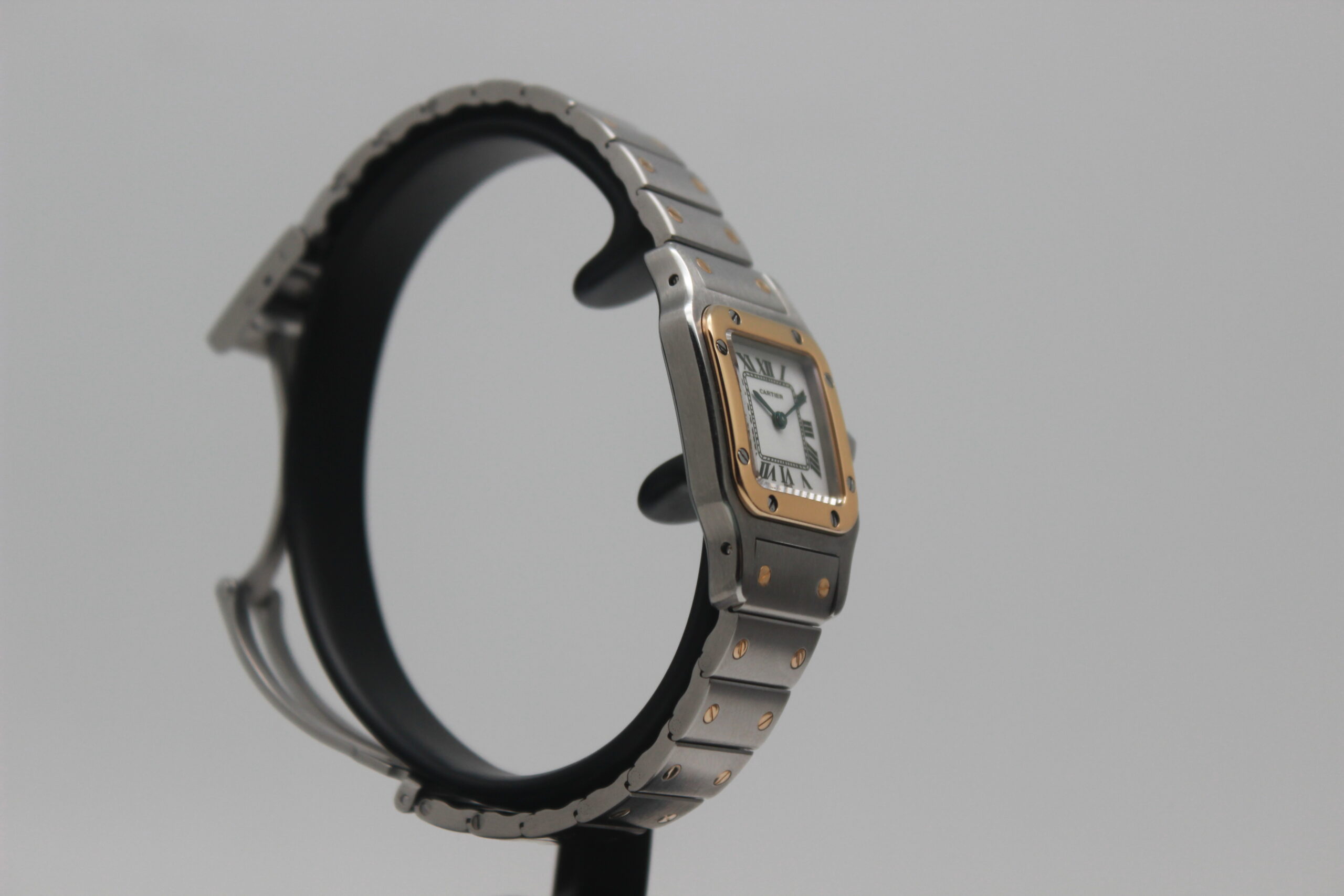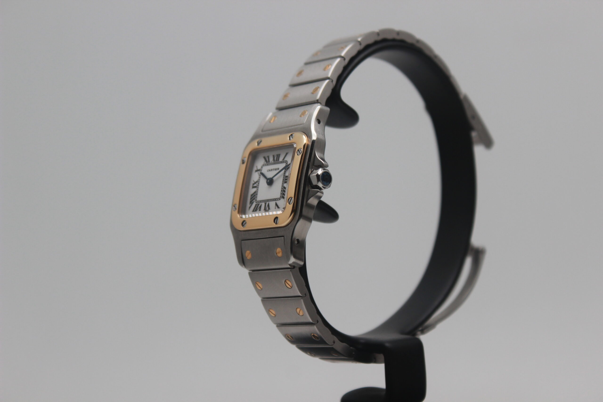Cartier Santos Galbée 166930, 24 x 35 mm steel and gold case, white dial with Roman numerals, yellow gold bezel, steel and gold strap with déployante closure.