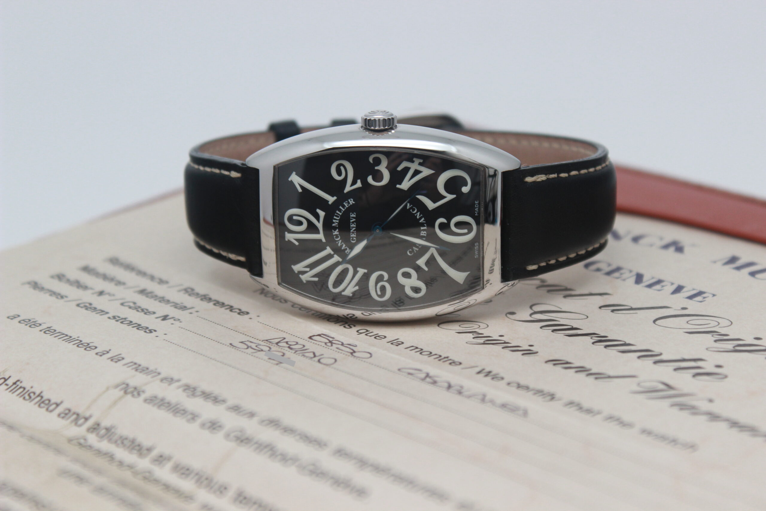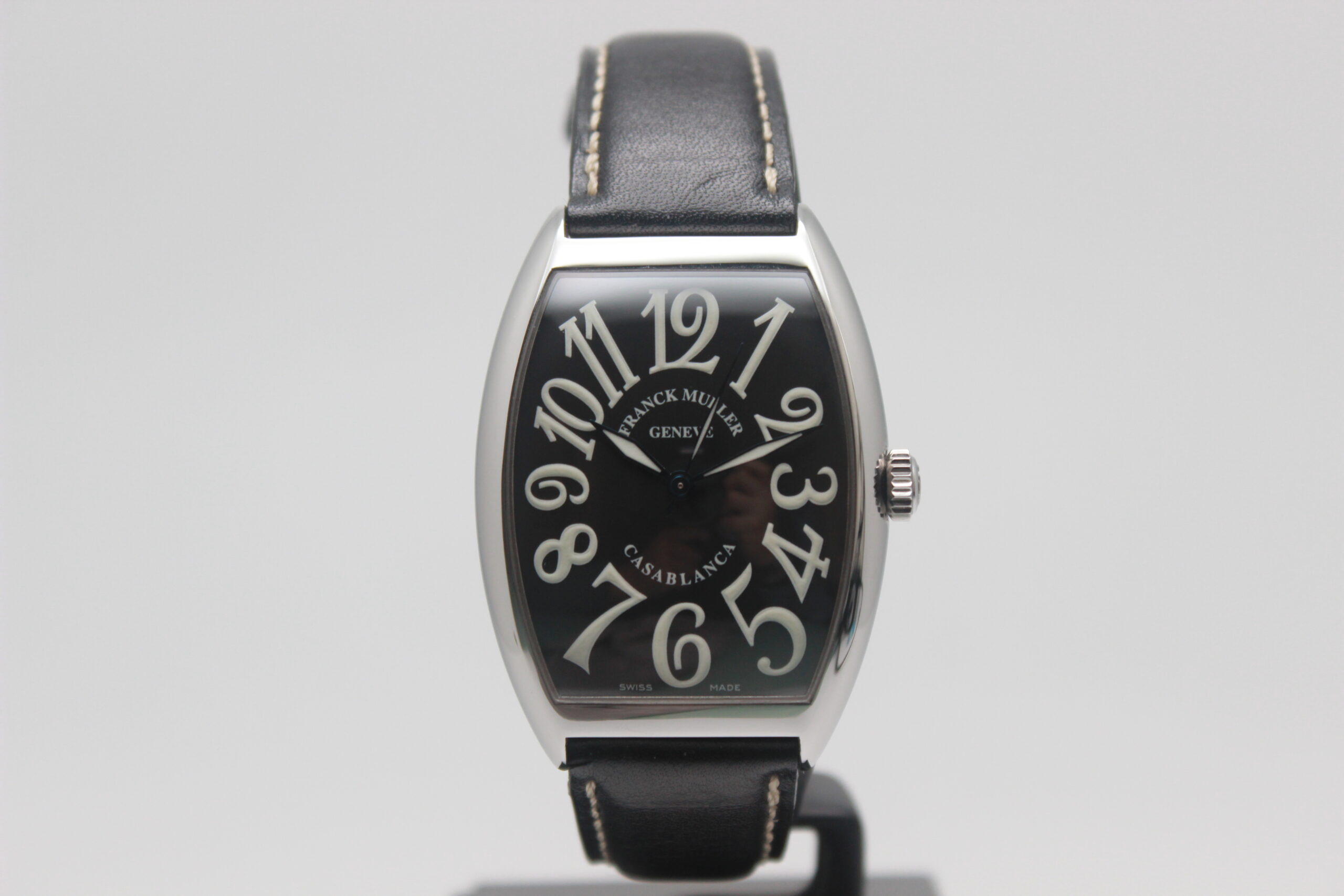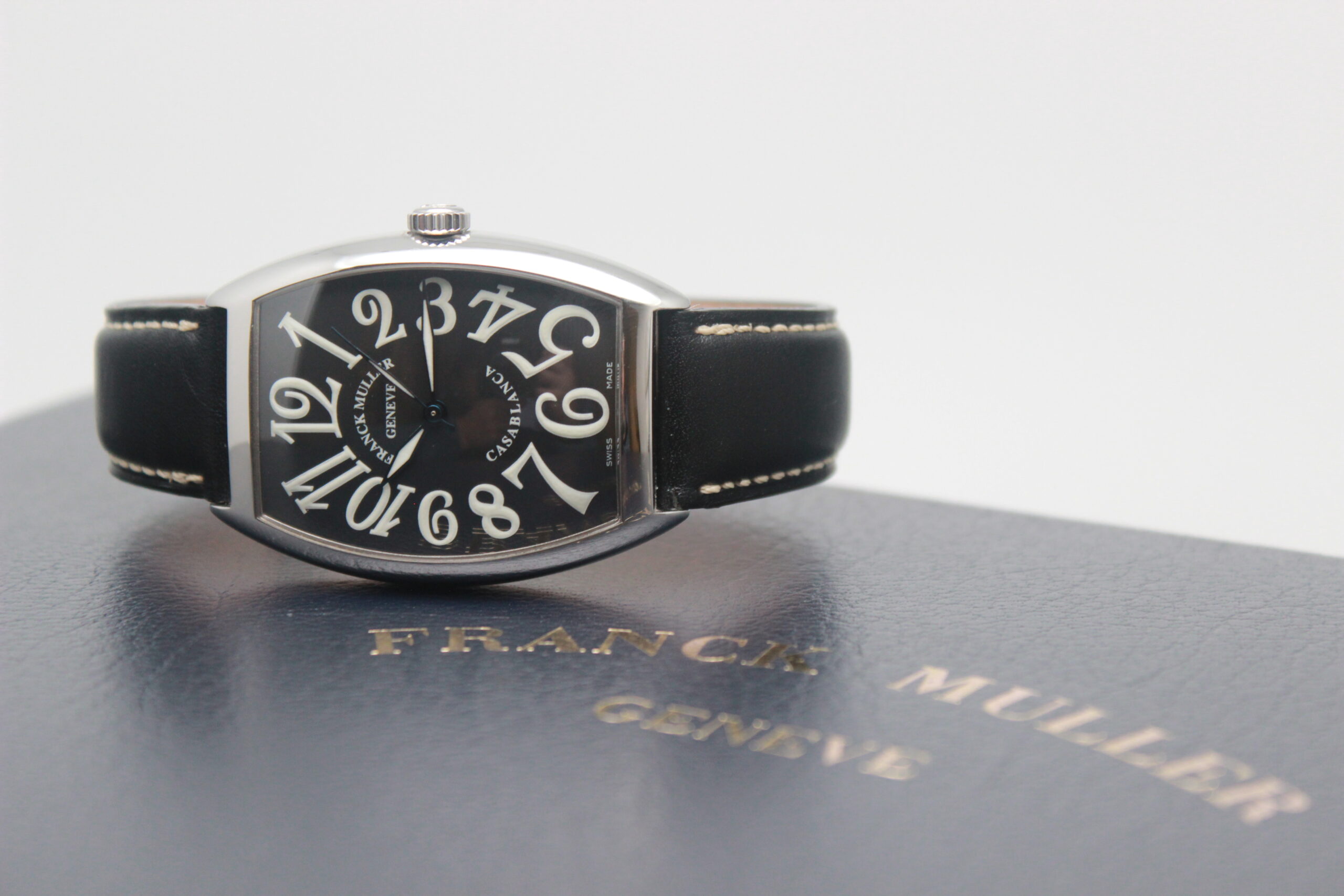 Frank Muller Casablanca 6850 Full Set 2012, 34 mm steel case, black dial with Arabic numerals, black leather strap with steel pin closure. Accompanied by original box and warranty Frank Muller.