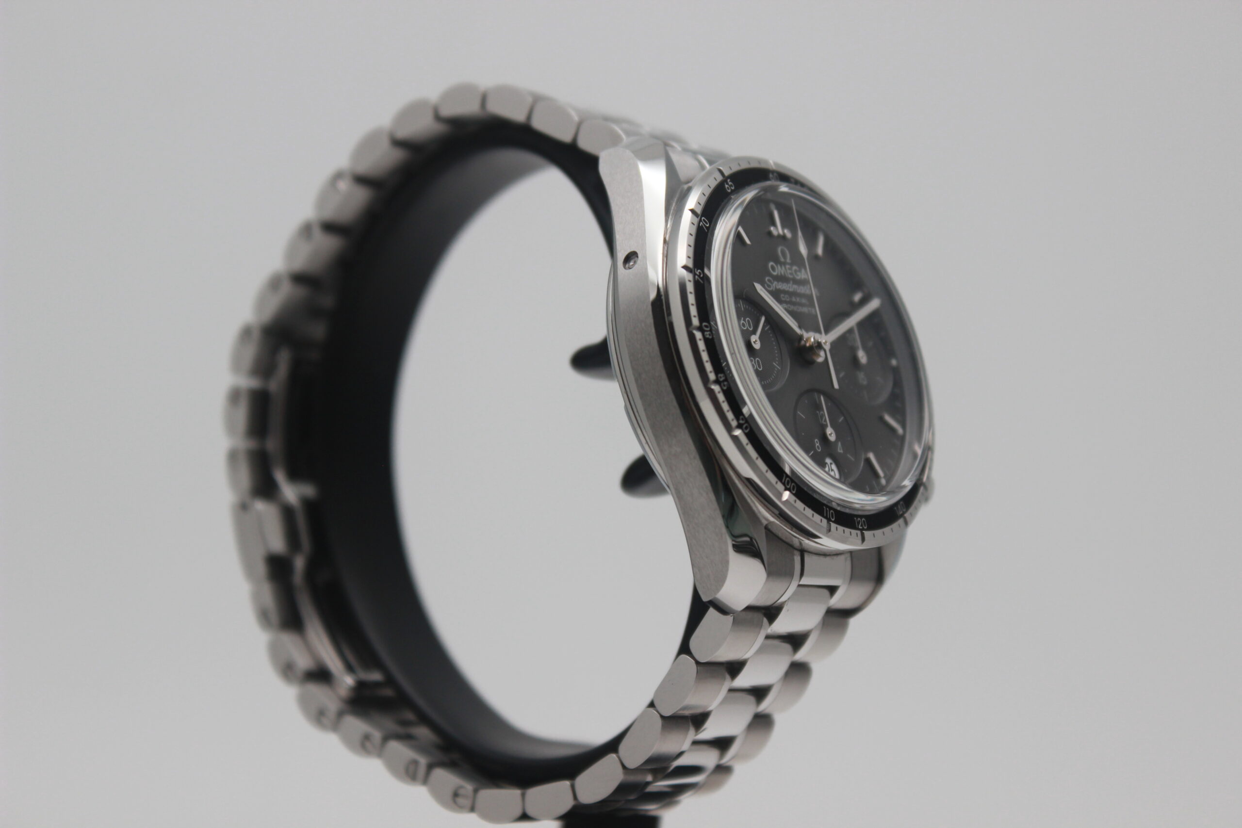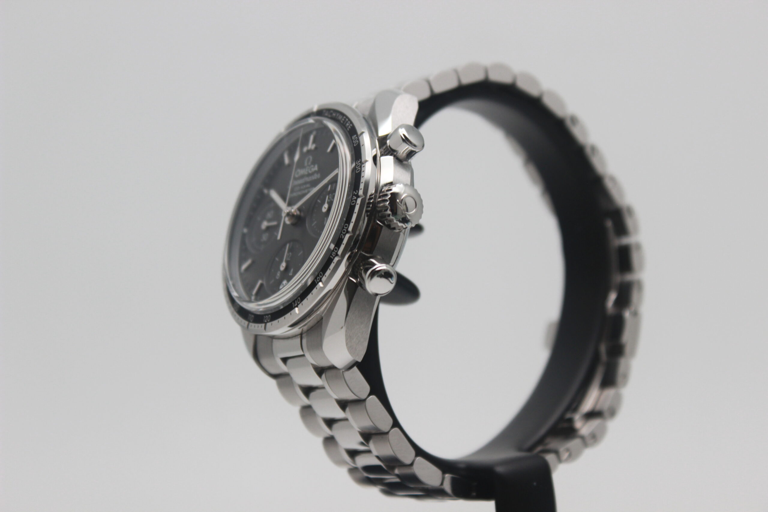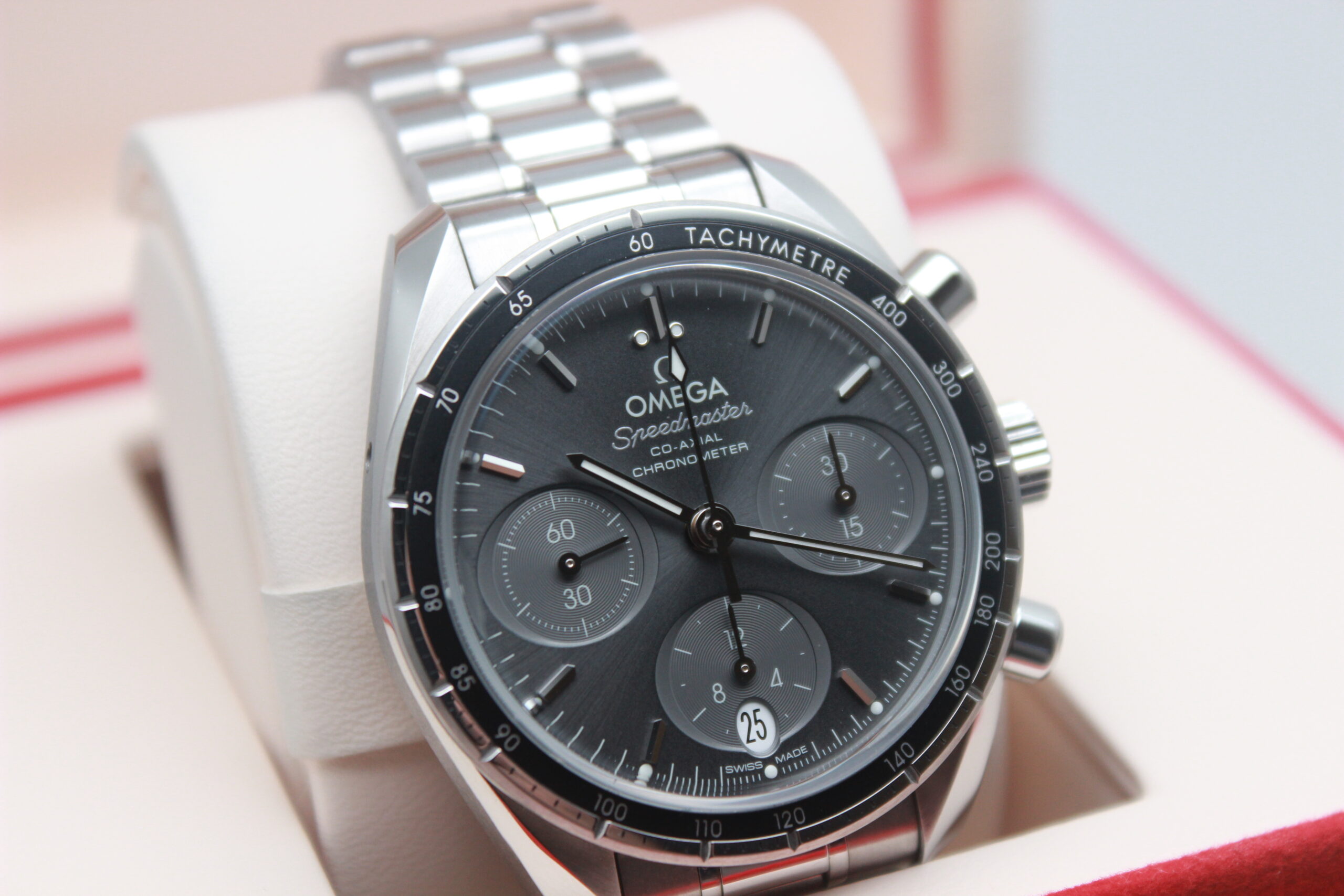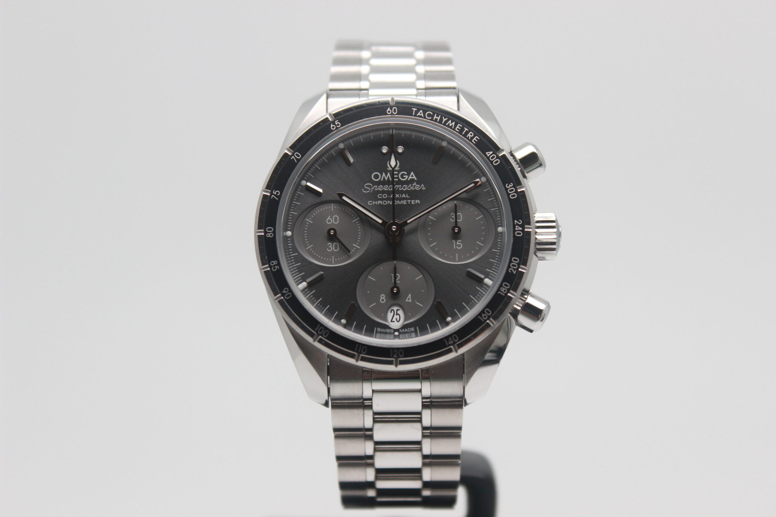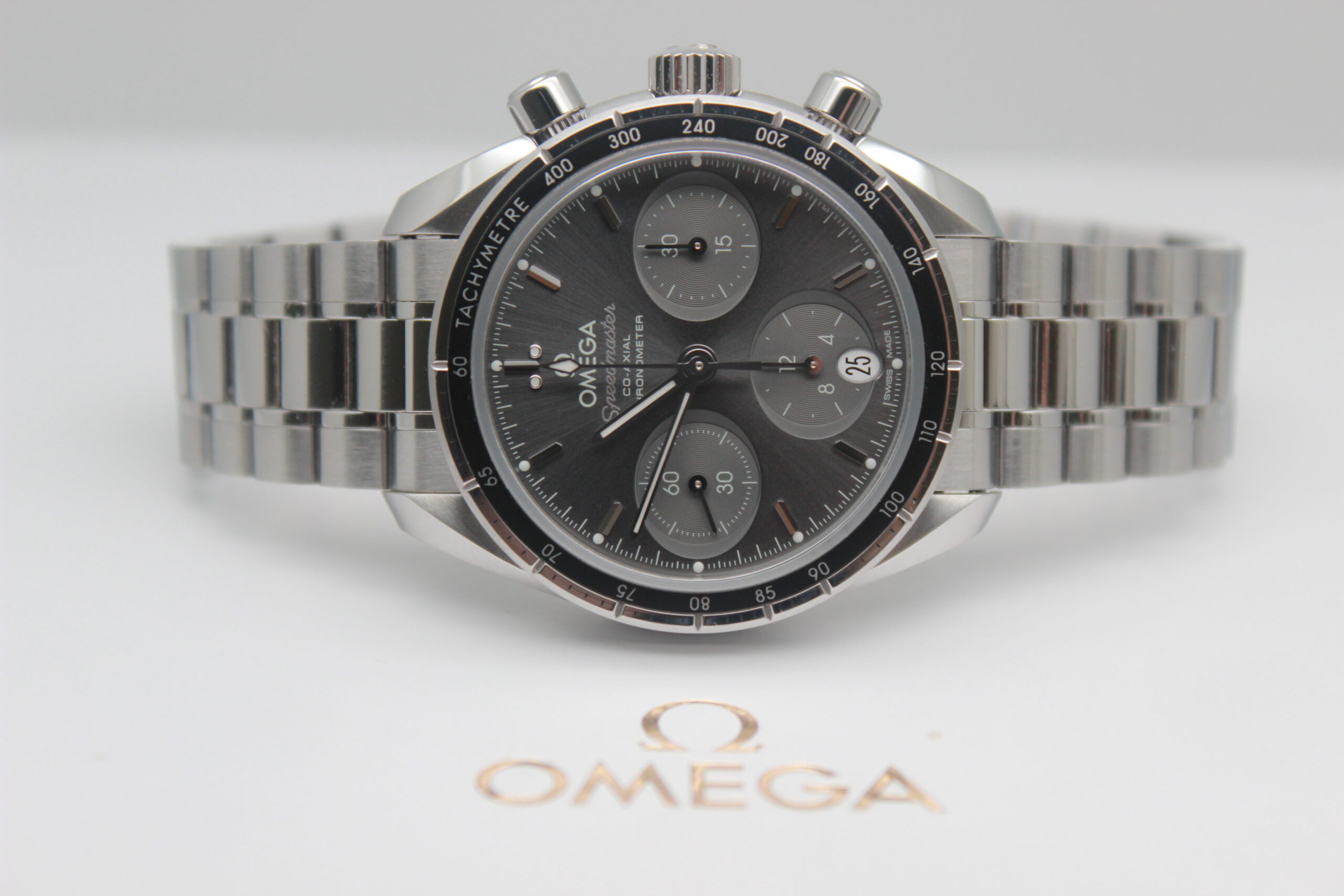 Omega Speedmaster Co-axial Chronograph 38 324.30.38.50.06.001 Full Set 2026 NEW, 38 mm steel case, gray dial, steel bezel with black aluminum insert, polished and satin-finished steel bracelet with steel folding clasp. Comes with original Omega box and warranty card.