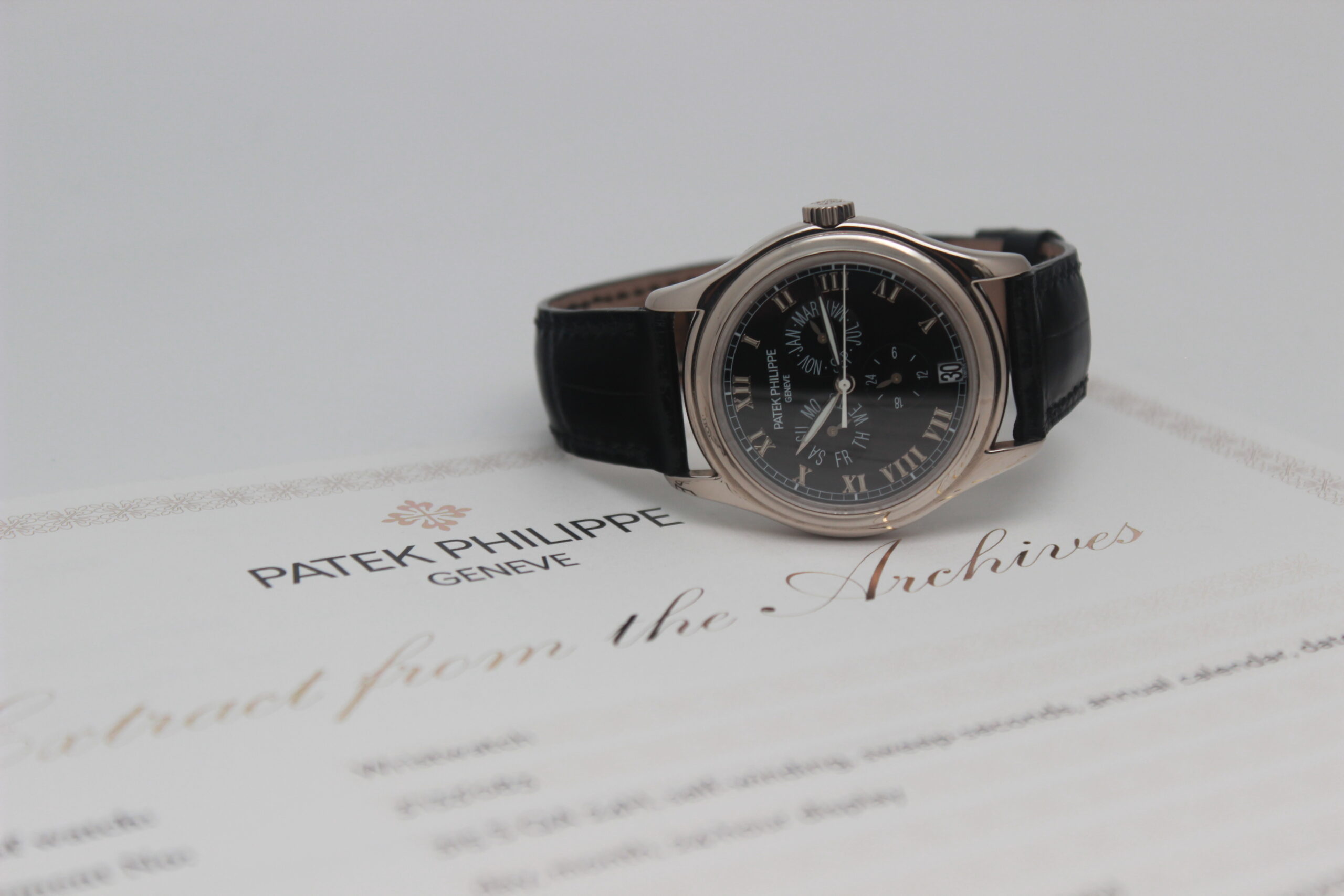 Patek Philippe Annual Calendar 5035G, 37mm white gold case, black dial with Roman numerals, white gold bezel, black leather strap with white gold pin closure. Accompanied by an extract from the Patek Philippe archives.
