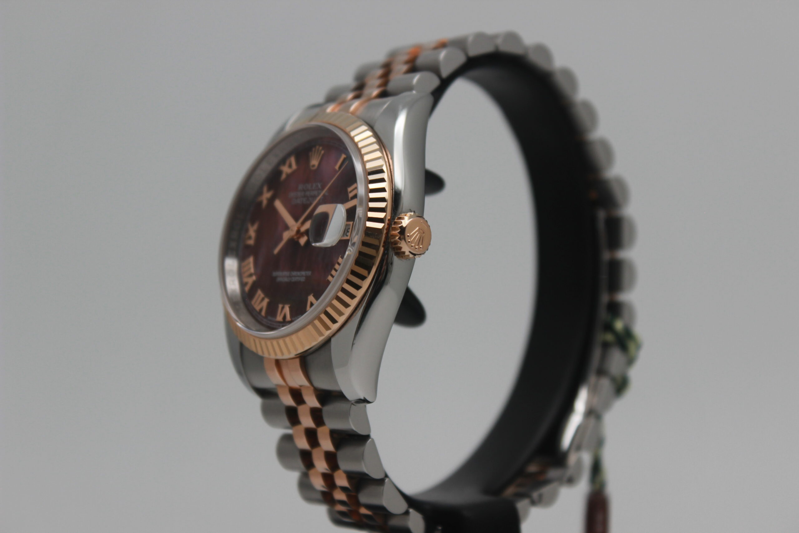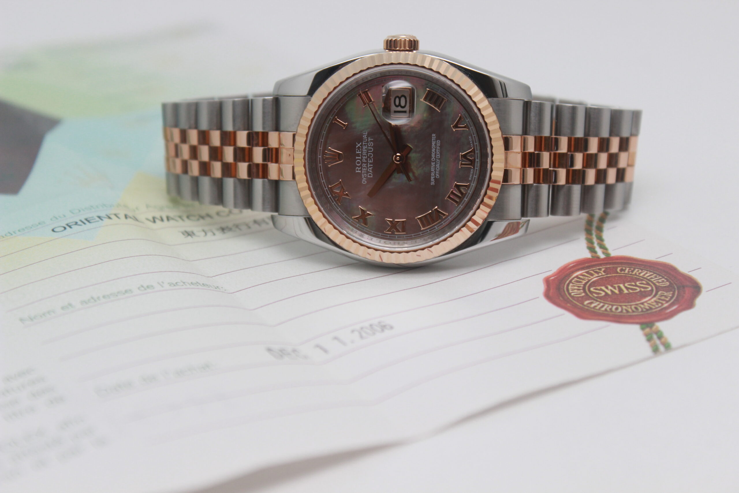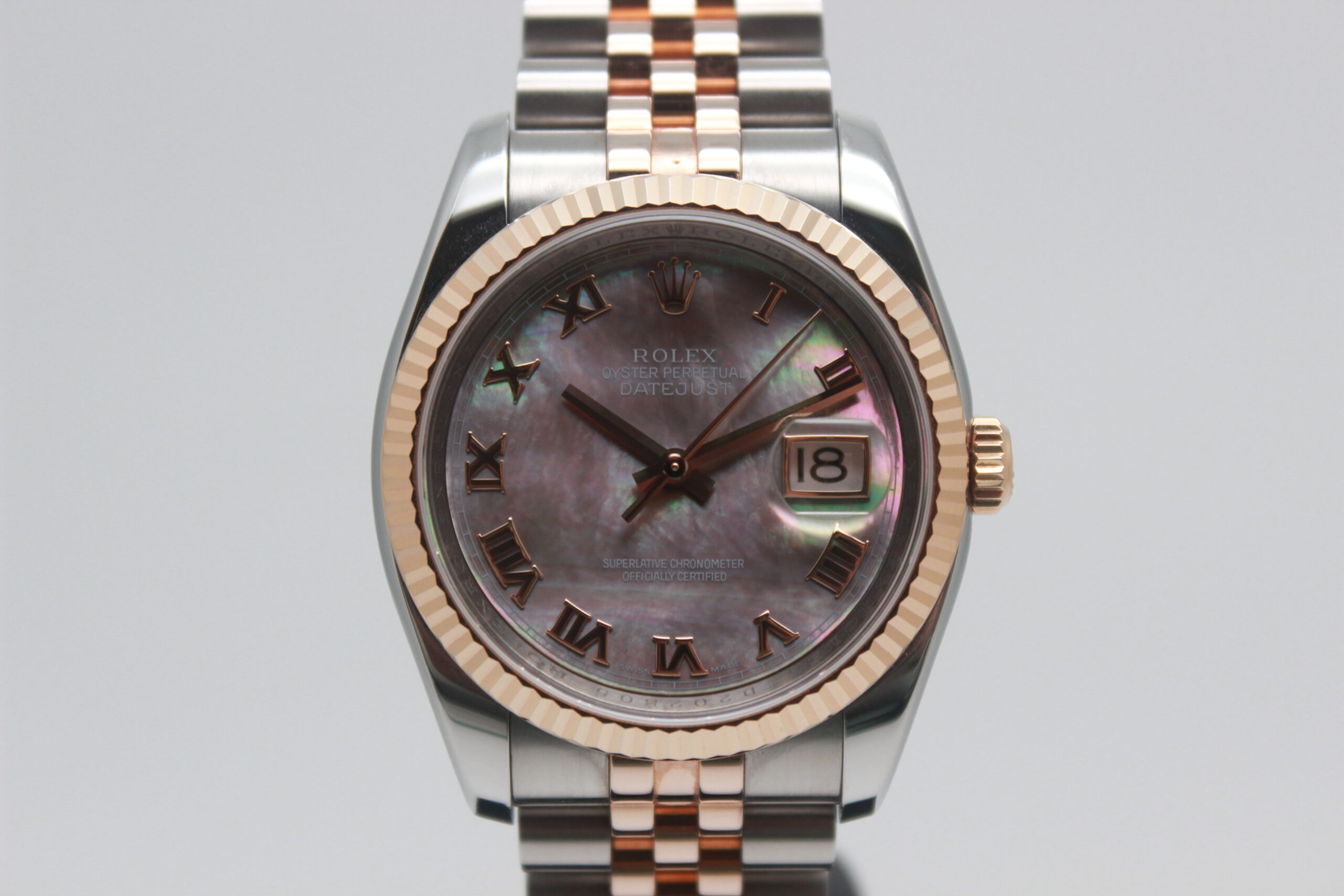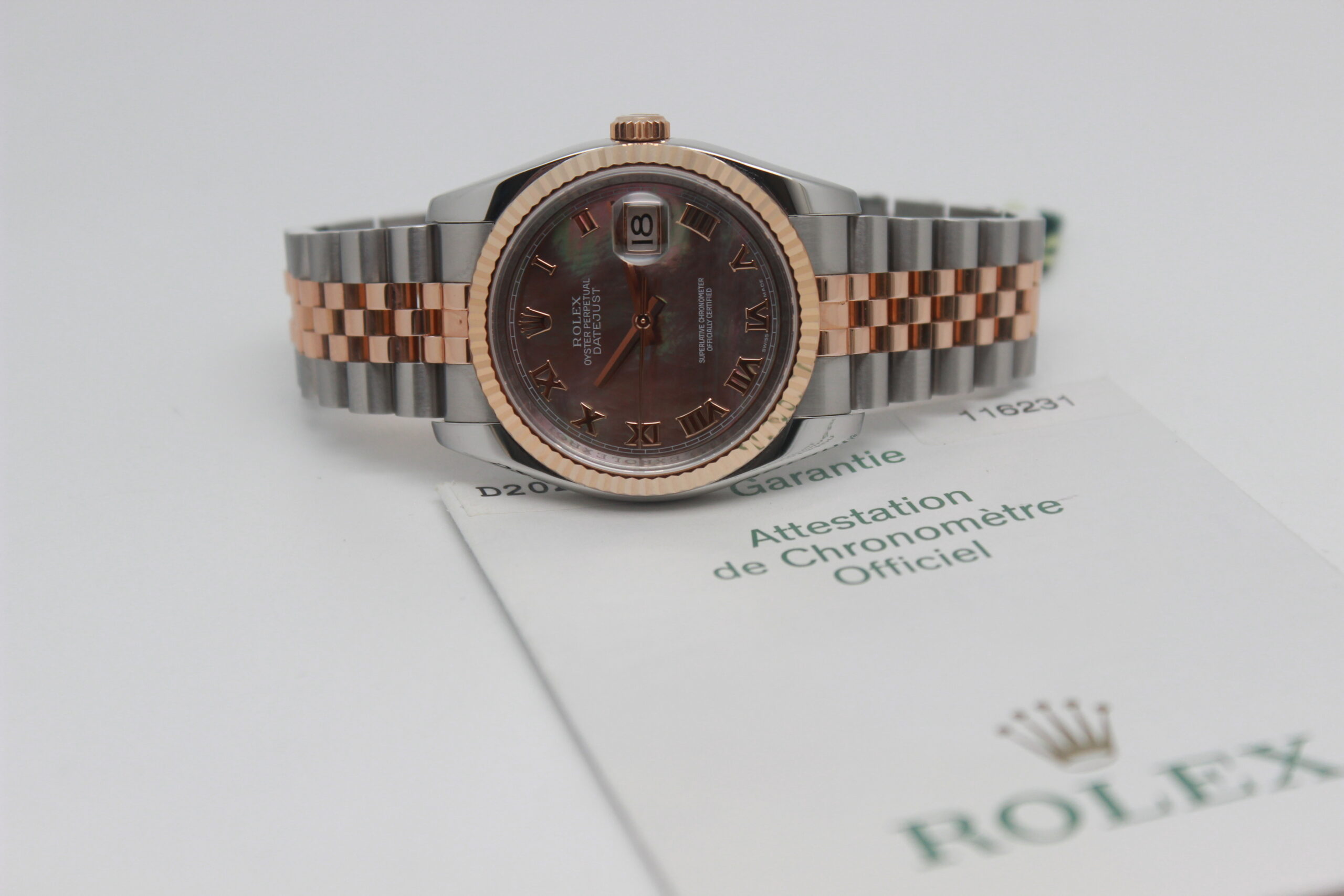 Rolex Datejust 36 116231 Full Set 2006, 36mm steel and gold case, mother-of-pearl dial with Roman numerals and date, rose gold knurled bezel, Jubilee bracelet in satin steel and polished rose gold with pop-up clasp. Equipped with original Rolex box and warranty.