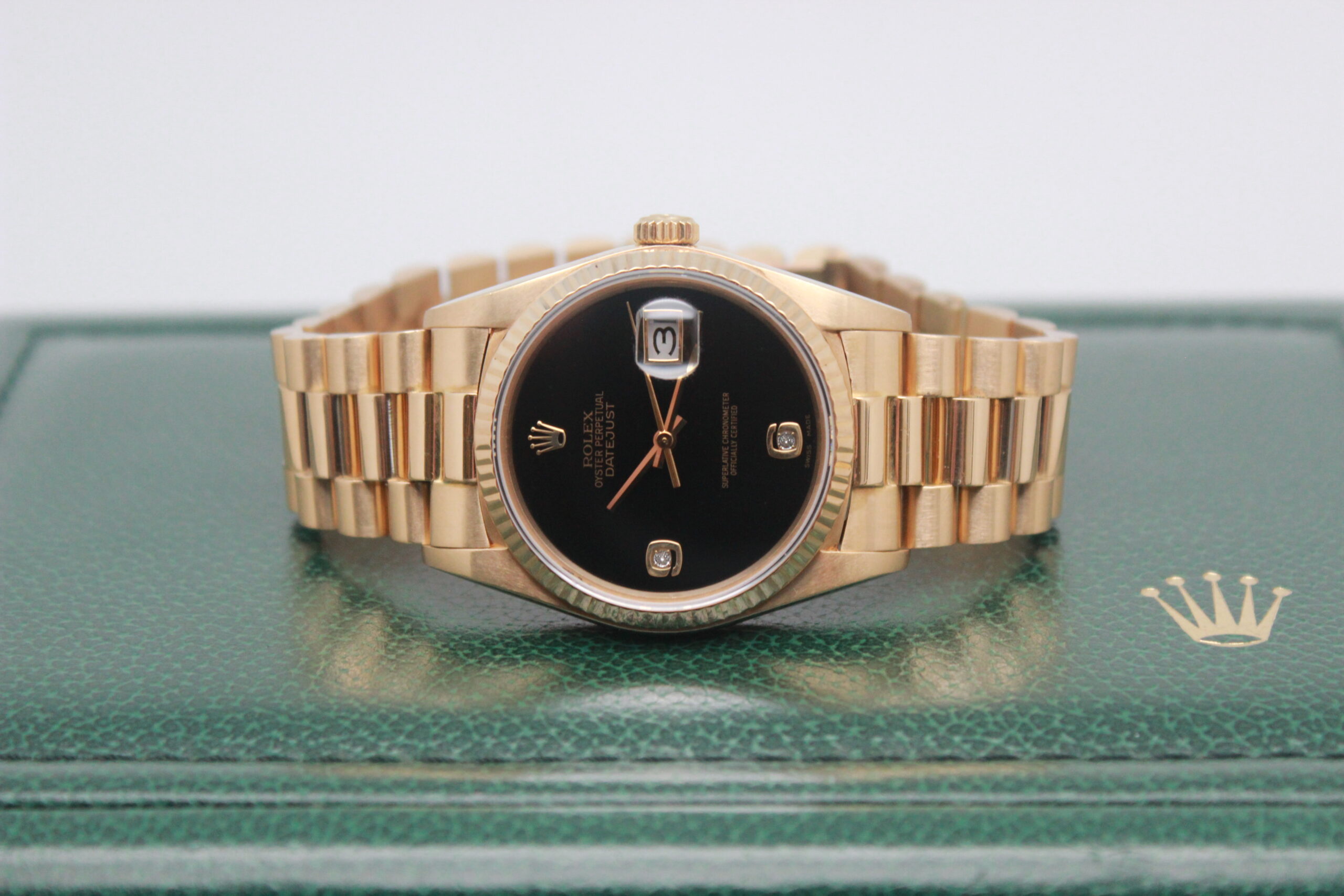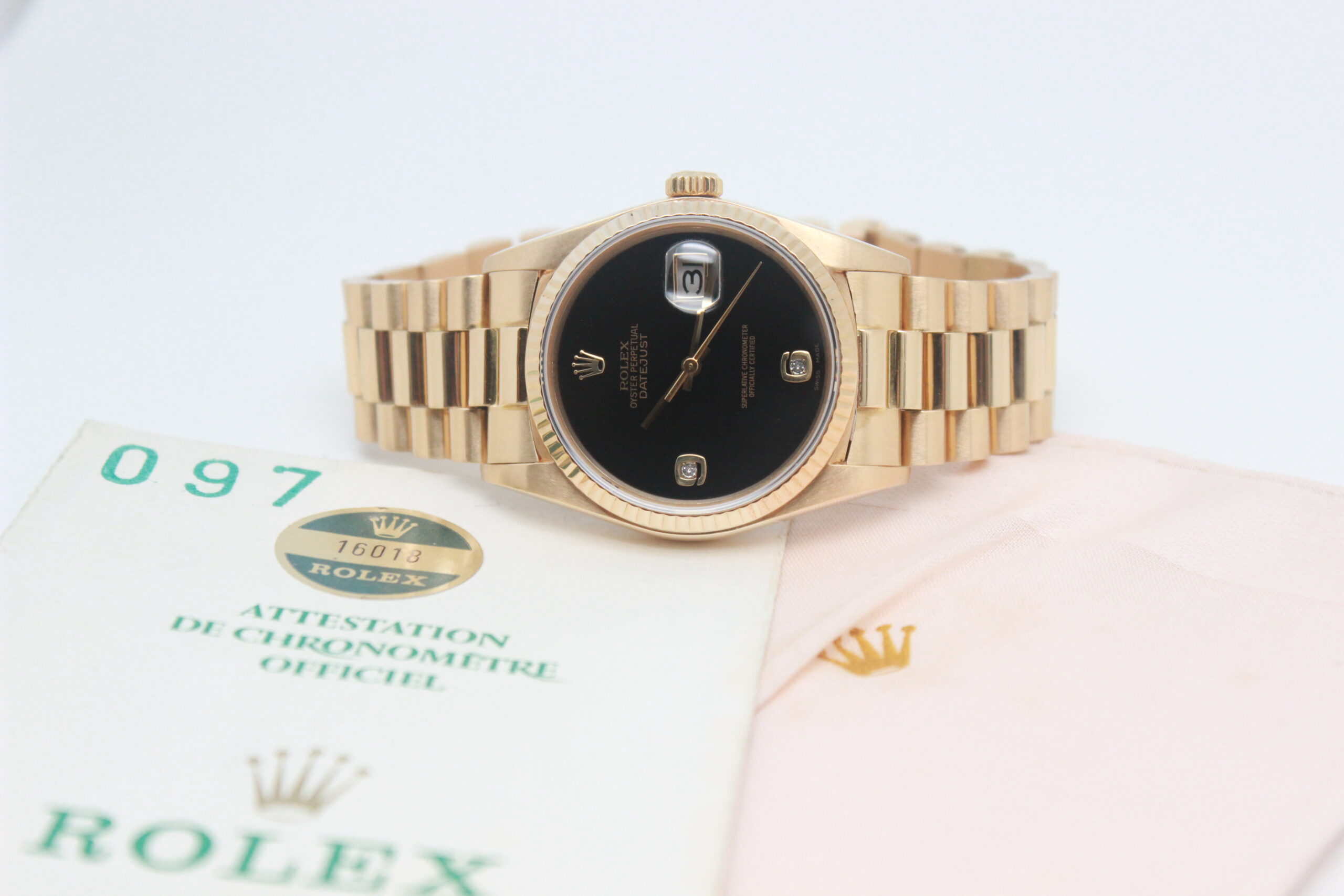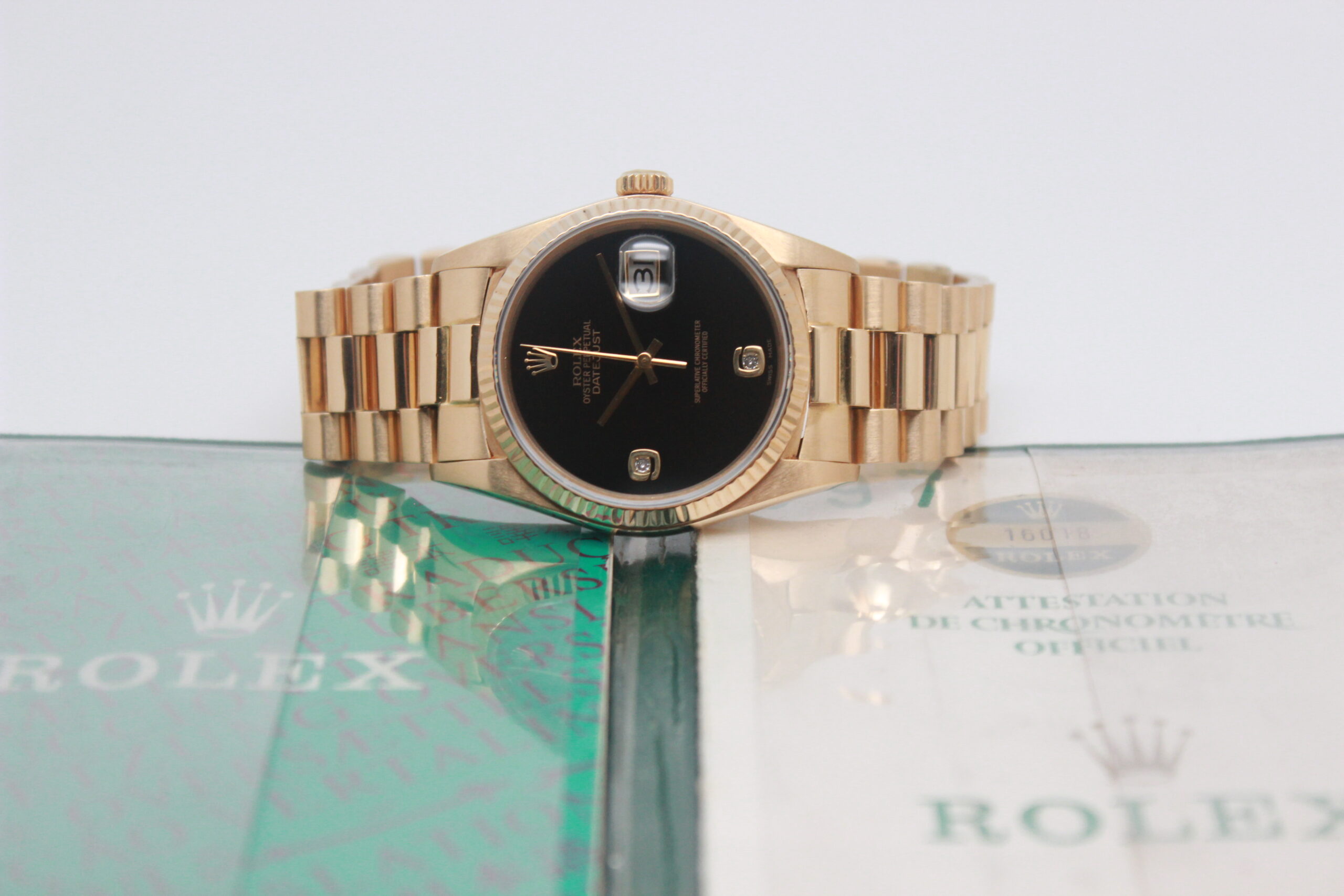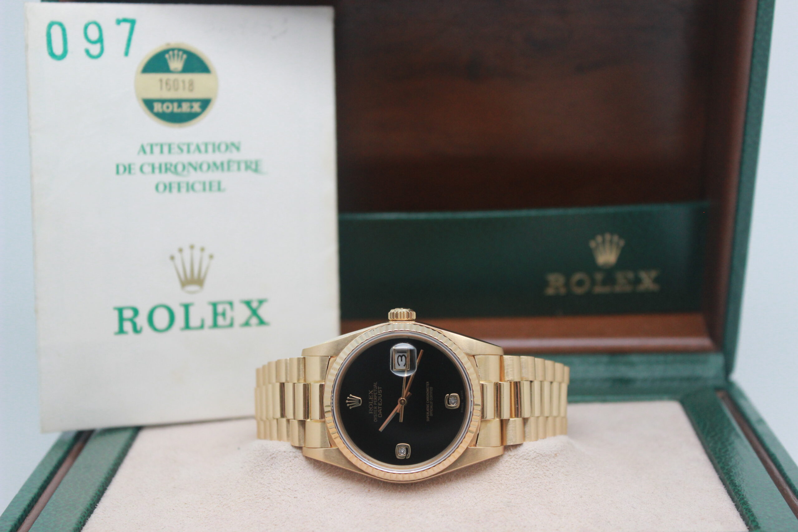 Rolex Datejust 36 16018 “Onyx Dial” Full Set 1986, 36mm yellow gold case, black diamond dial, yellow gold knurled bezel, President bracelet in polished and satin yellow gold with pop-up clasp. Equipped with original Rolex box and warranty.