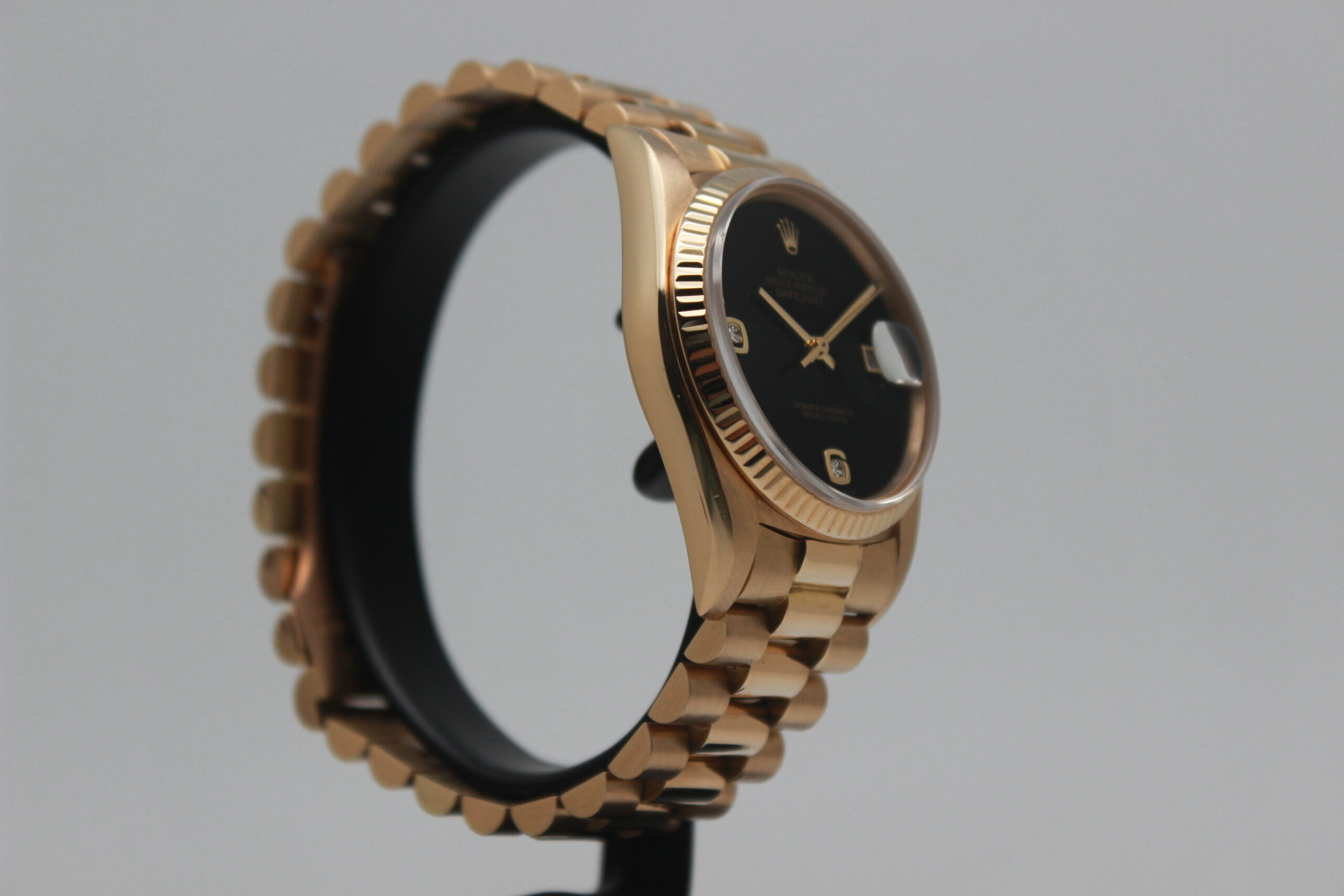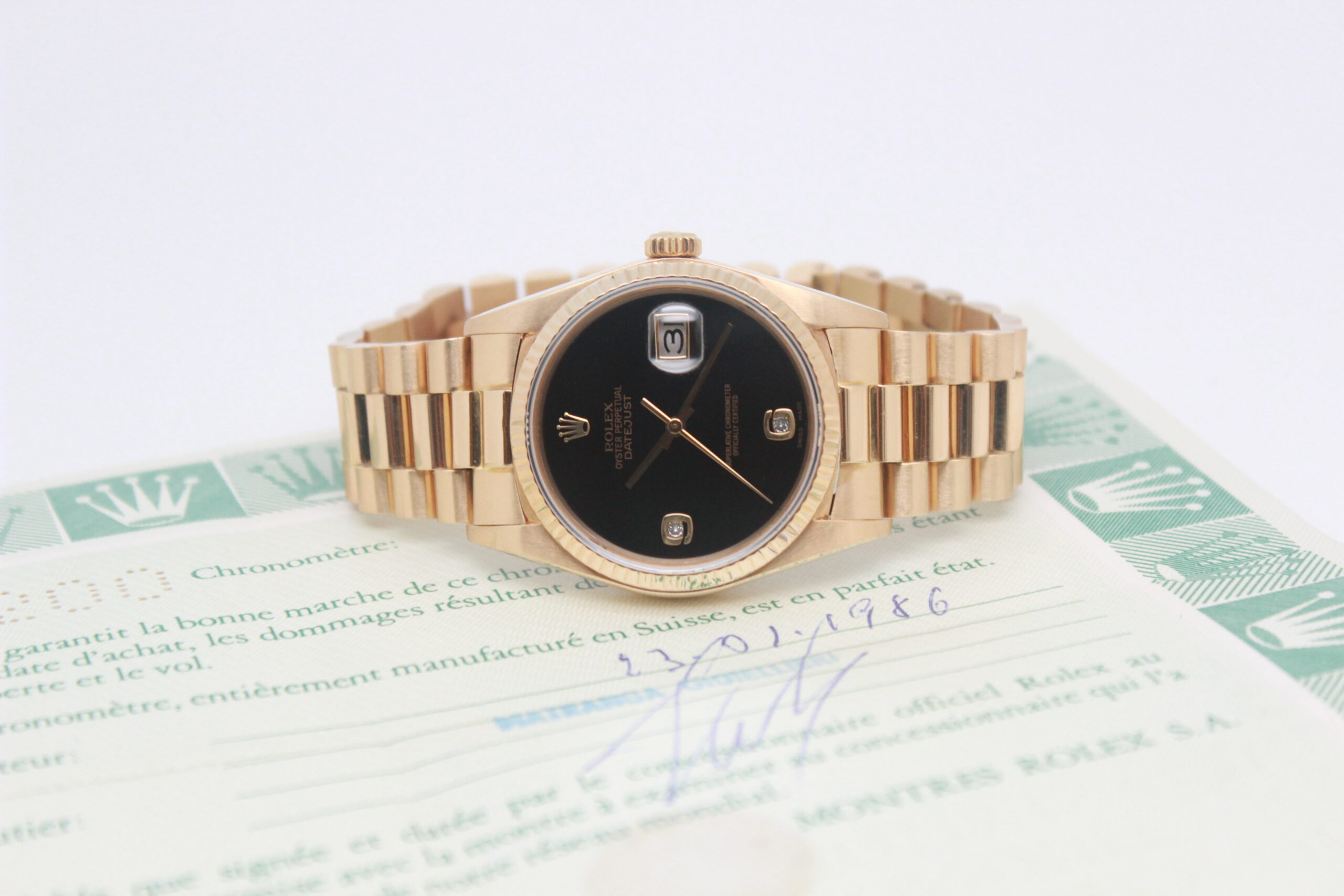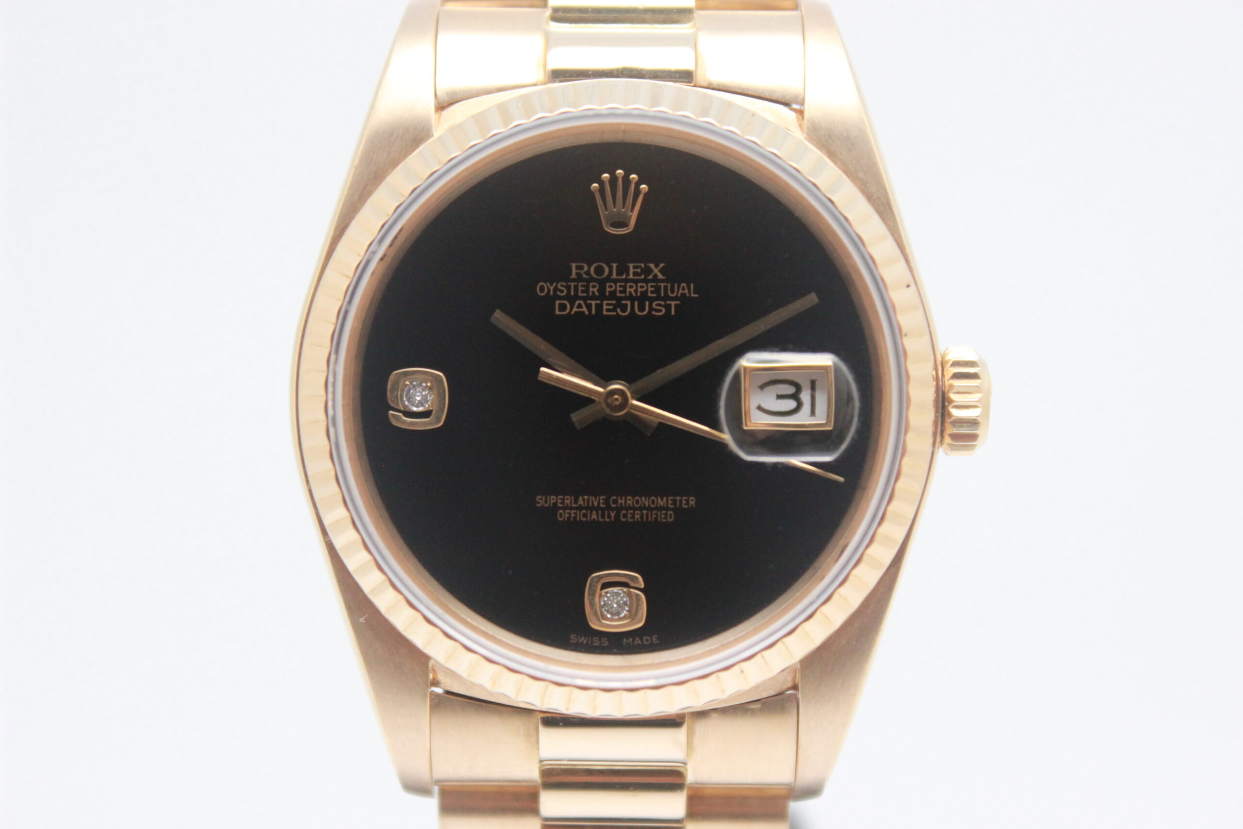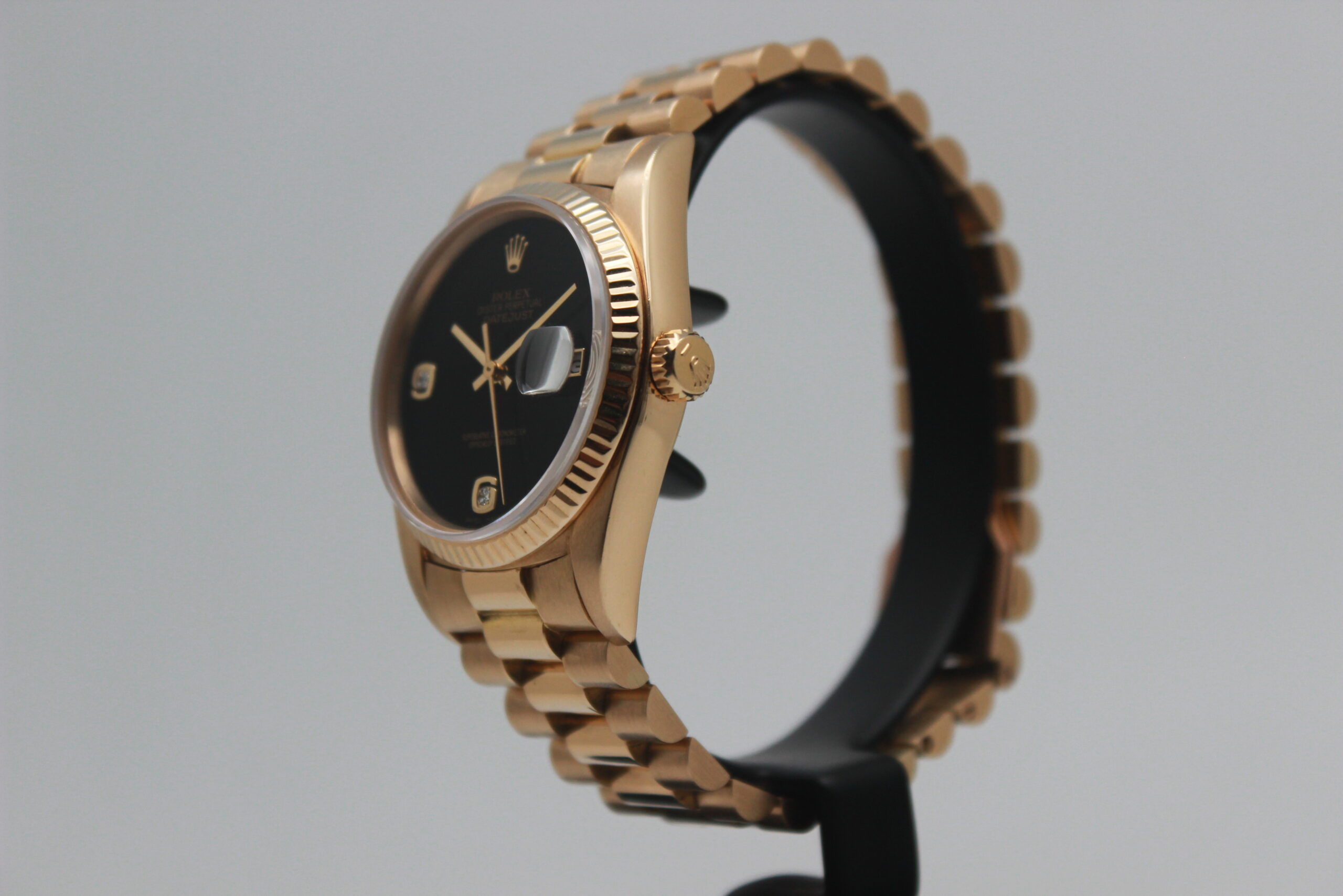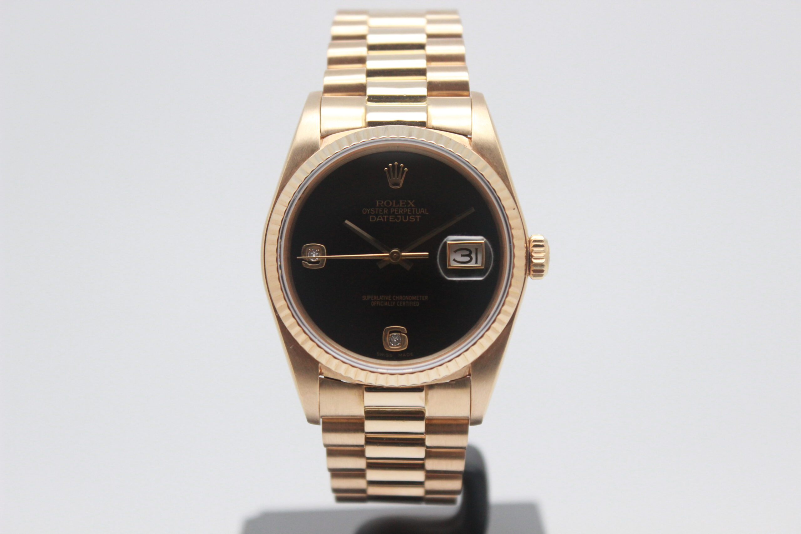 Rolex Datejust 36 16018 “Onyx Dial” Full Set 1986, 36mm yellow gold case, black diamond dial, yellow gold knurled bezel, President bracelet in polished and satin yellow gold with pop-up clasp. Equipped with original Rolex box and warranty.