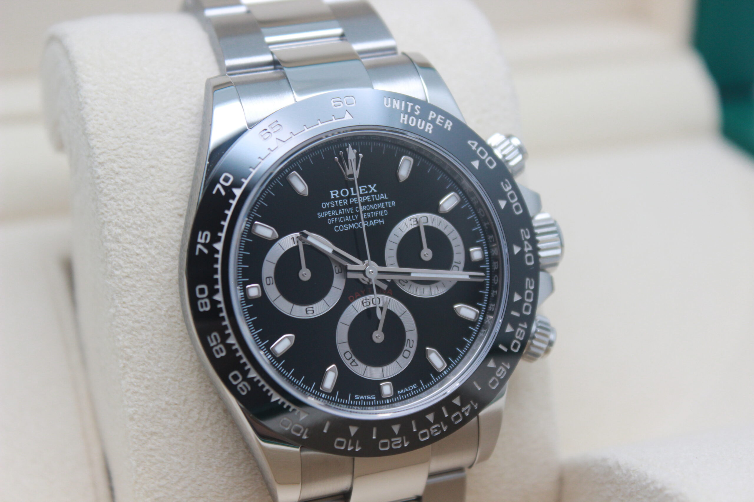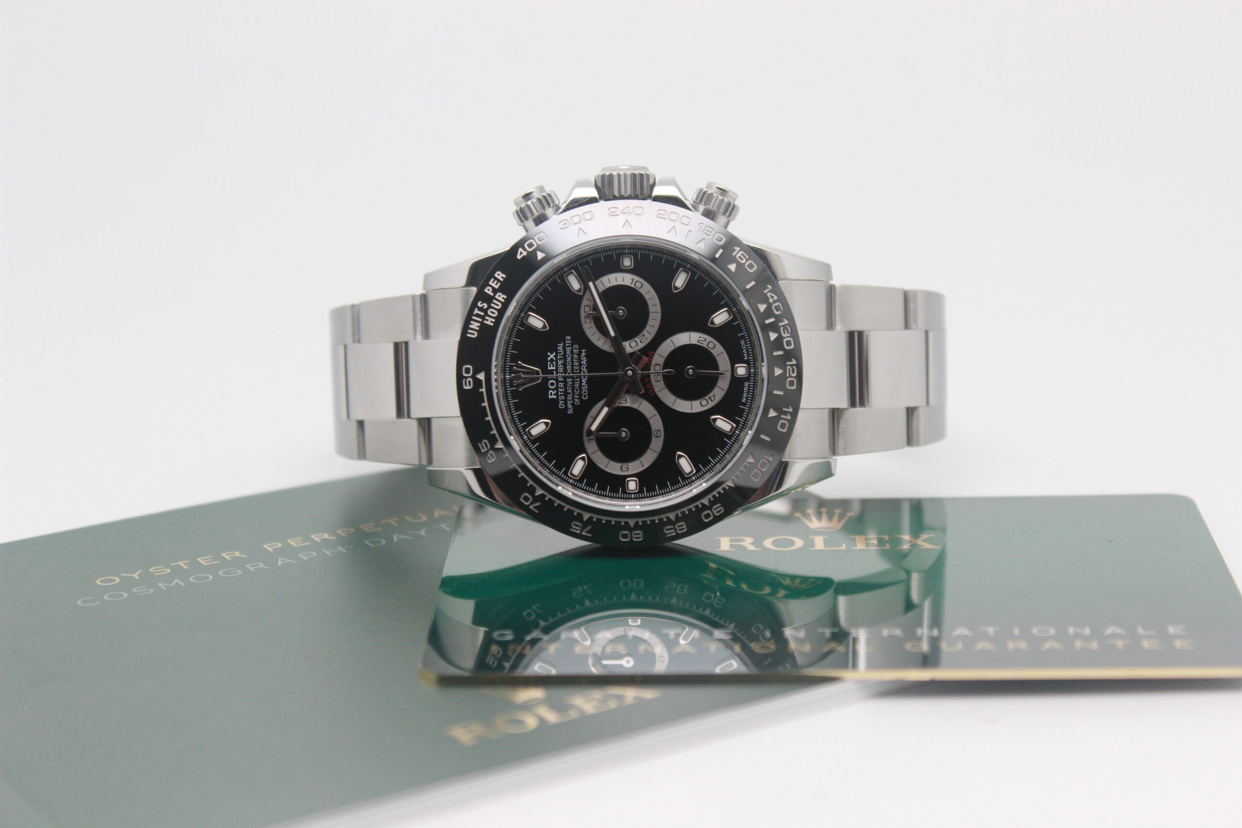 Rolex Daytona 116500LN Full Set 2021, 40mm Steel Case, Black Dial, Steel Bezel with Black Ceramic Insert, Polished and Satin Steel Oyster Bracelet with Steel Oysterlock Clasp. This model features a 4130 gauge self-winding mechanical movement. Comes with an original Rolex box and warranty card.