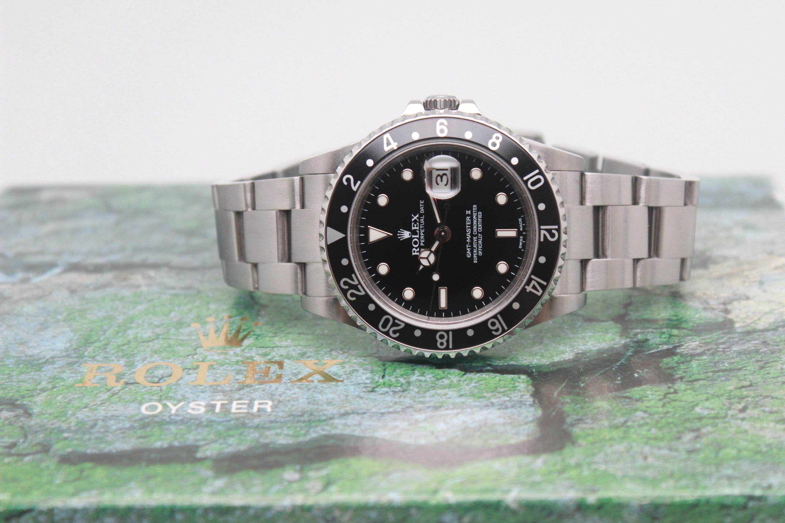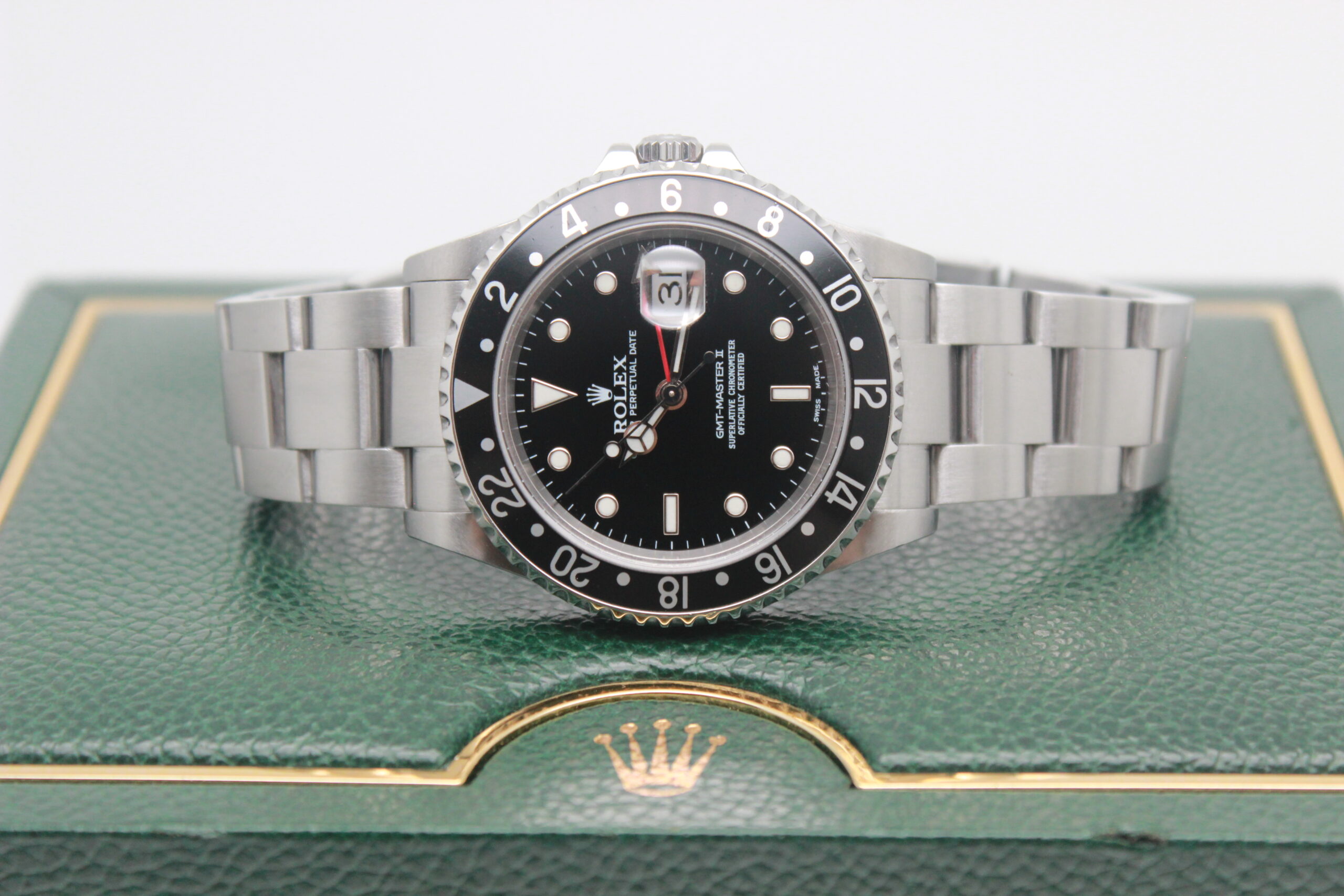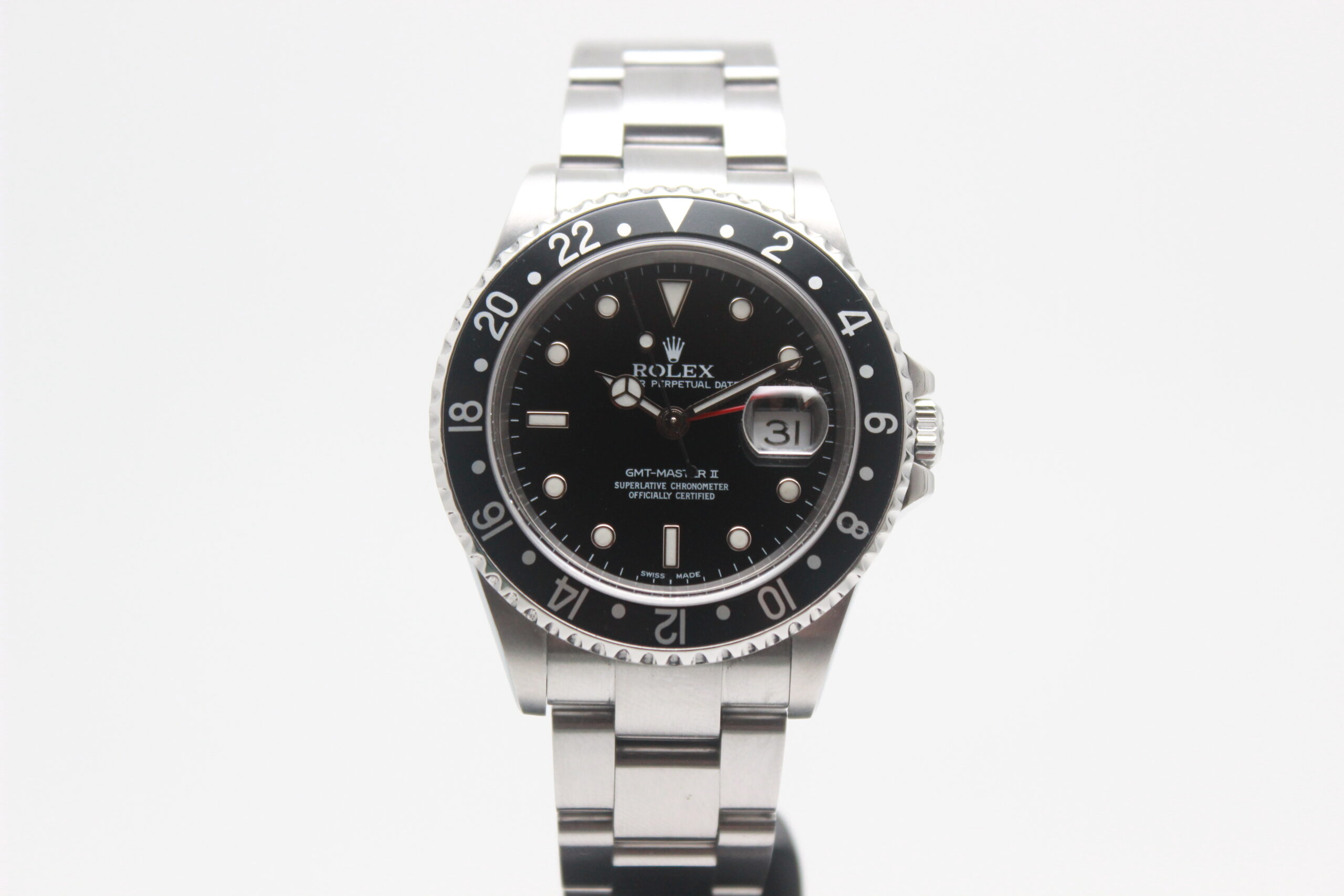 Rolex GMT-Master II 16710 Full Set 2004, 40mm Steel Case, Steel Bezel with Black Ceramic Insert, Black Dial, Oyster Satin Steel Bracelet with Steel Fliplock Clasp. This model features a Rolex 3185 caliber self-winding mechanical movement. Equipped with original Rolex box and warranty.