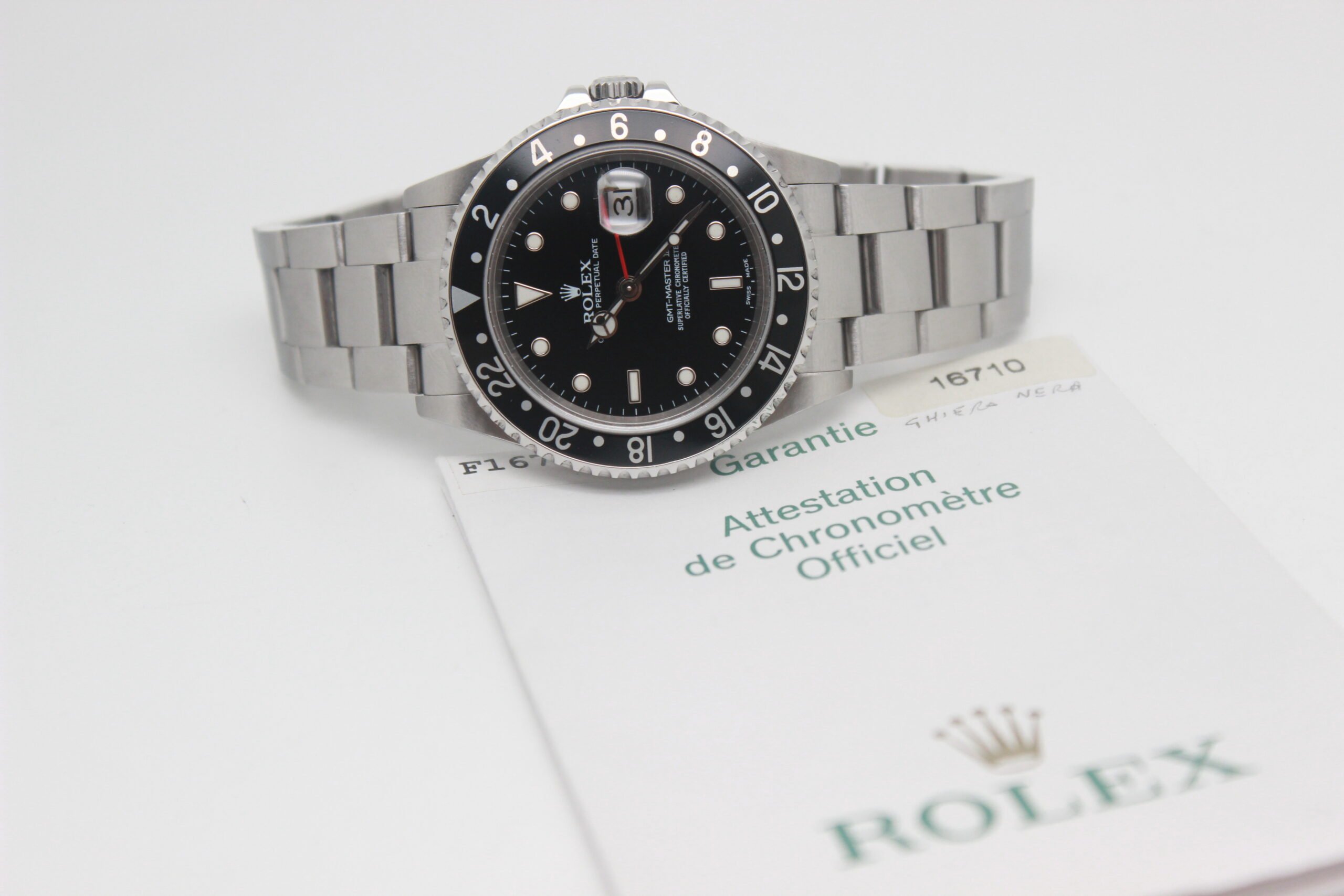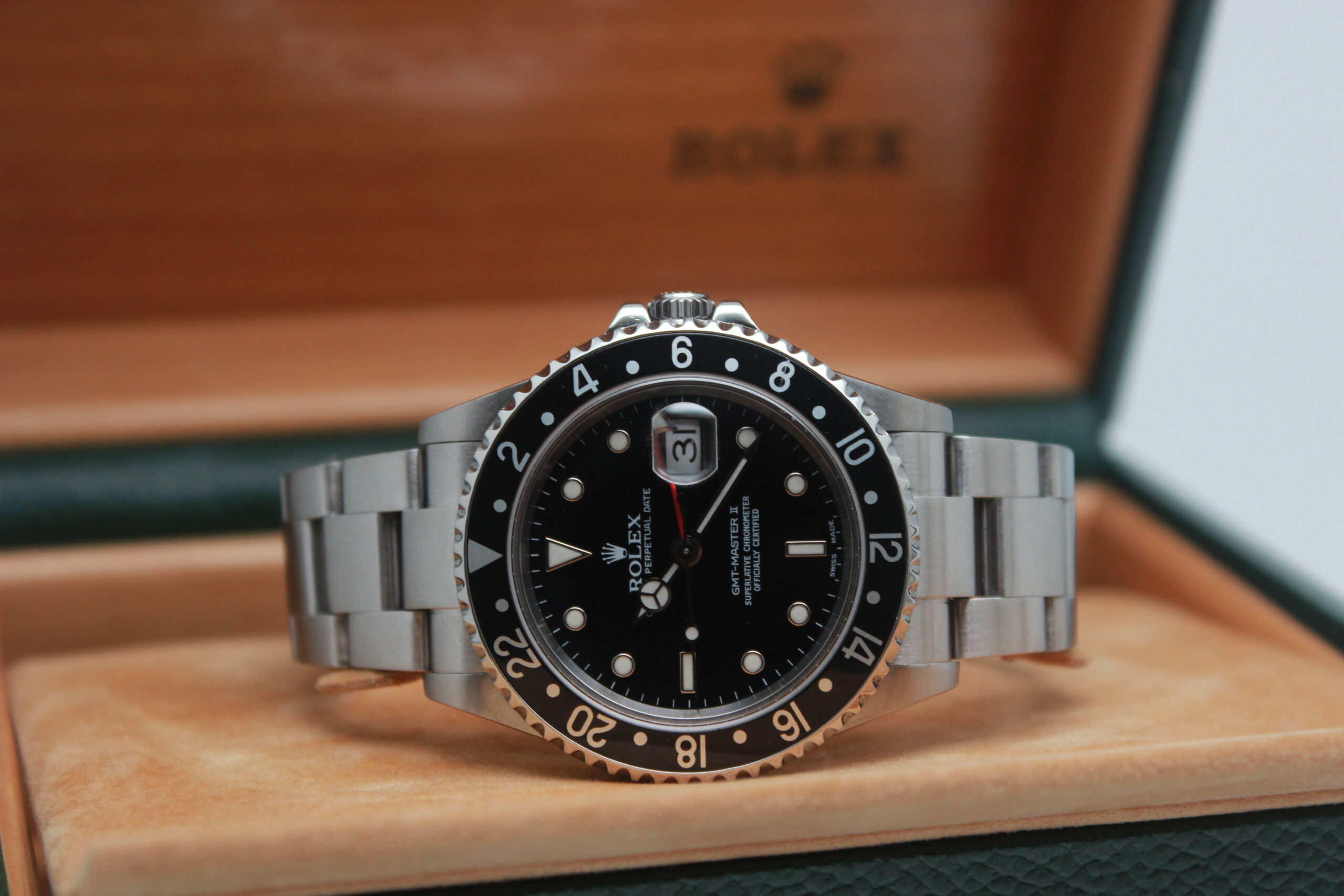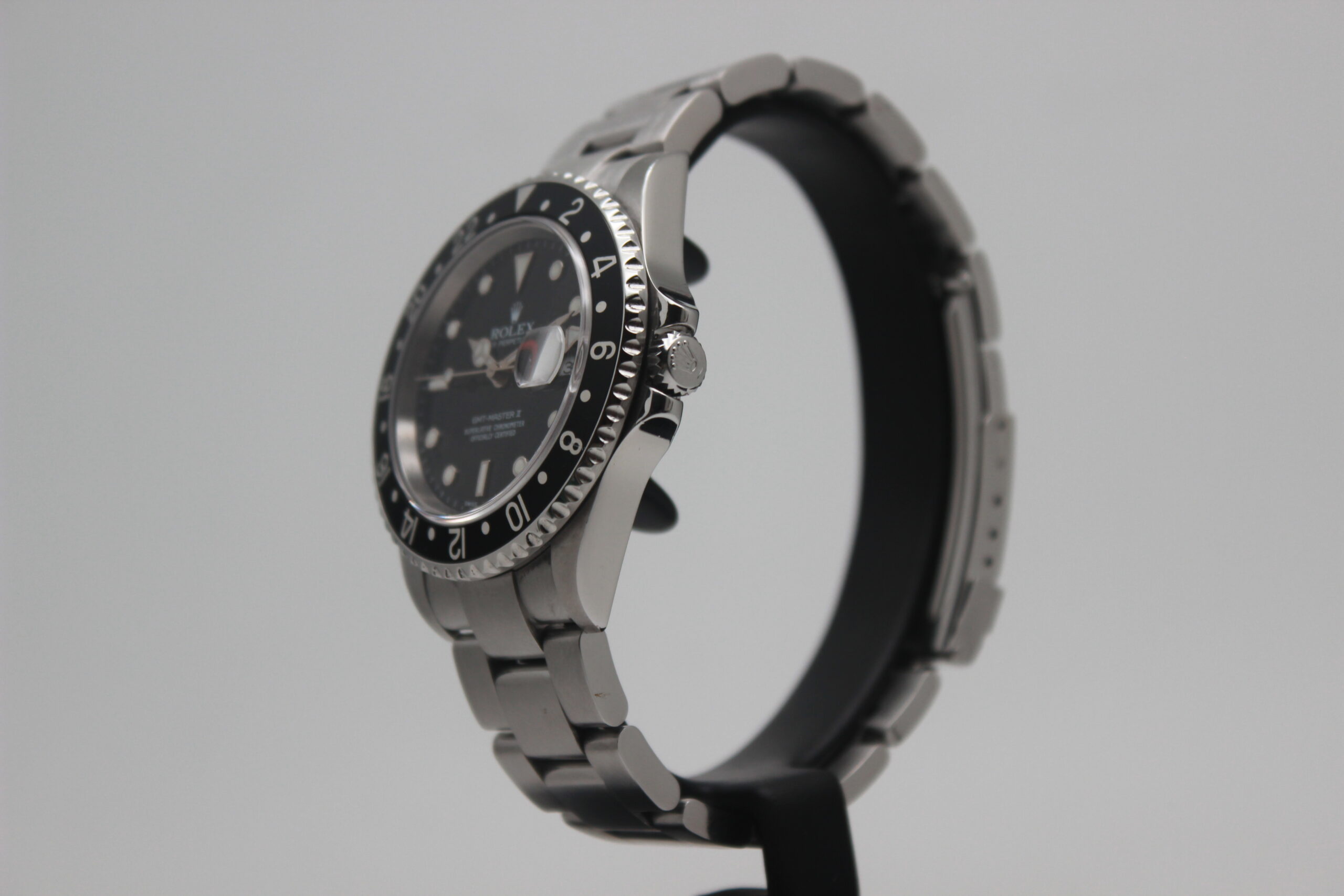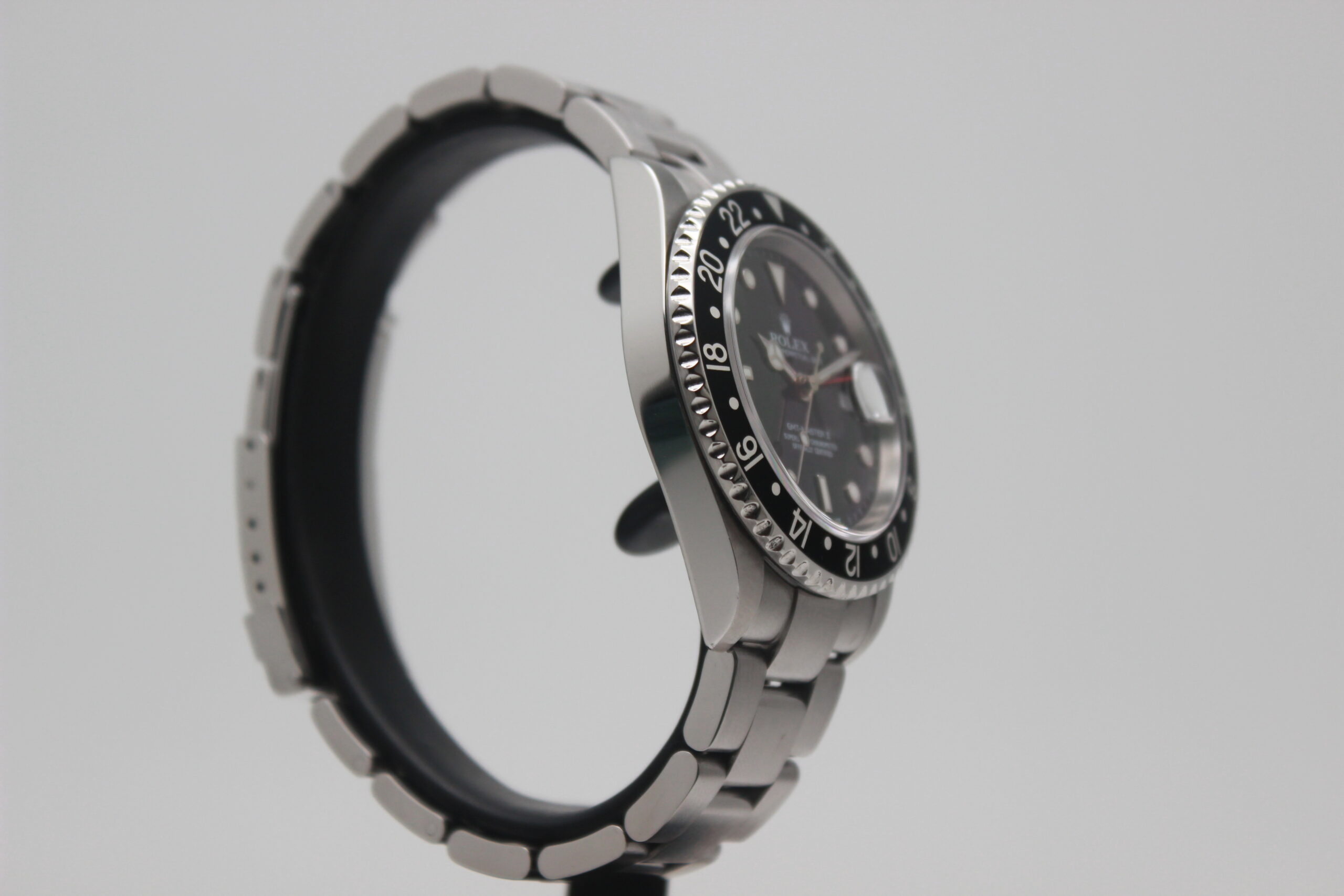 Rolex GMT-Master II 16710 Full Set 2004, 40mm Steel Case, Steel Bezel with Black Ceramic Insert, Black Dial, Oyster Satin Steel Bracelet with Steel Fliplock Clasp. This model features a Rolex 3185 caliber self-winding mechanical movement. Equipped with original Rolex box and warranty.