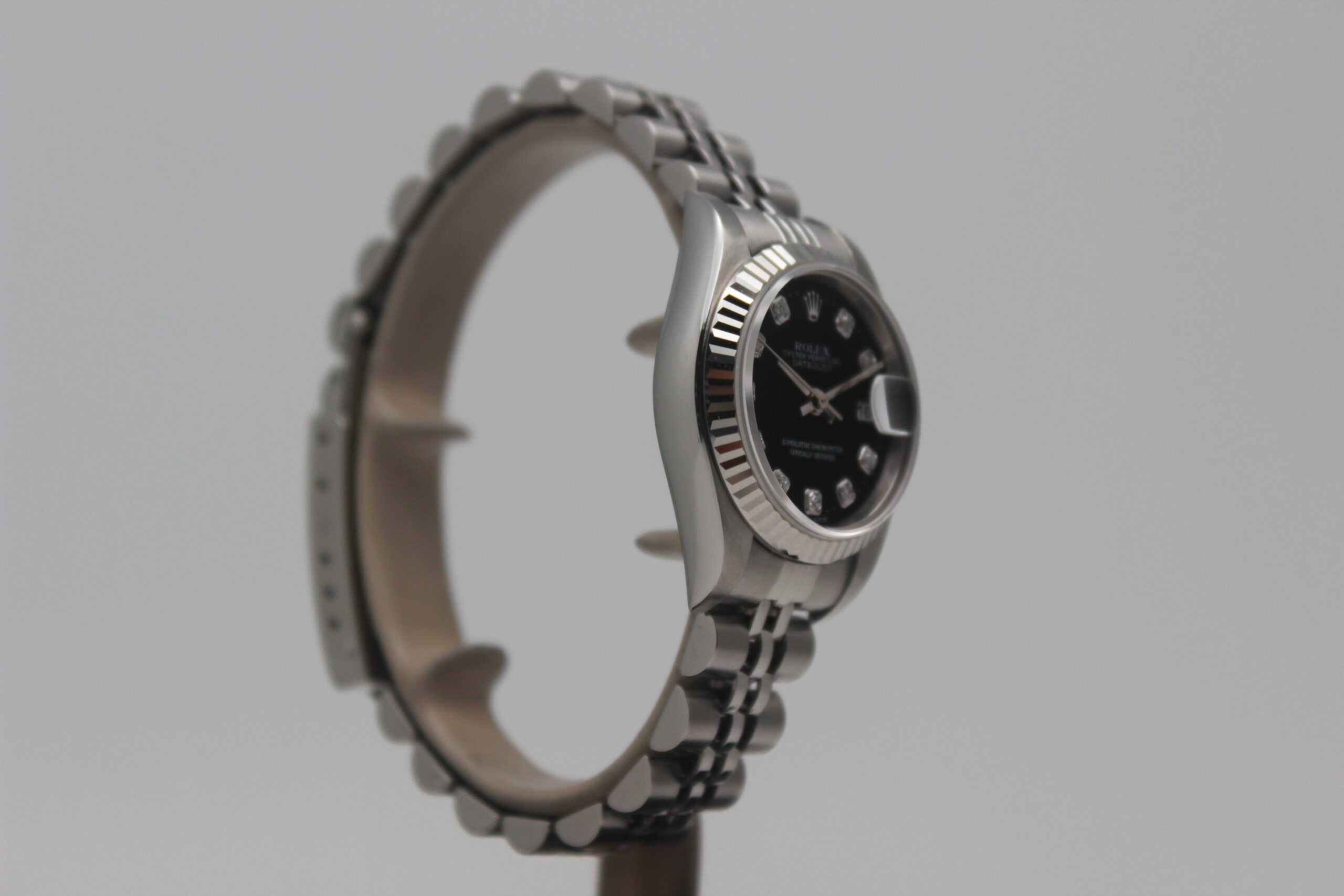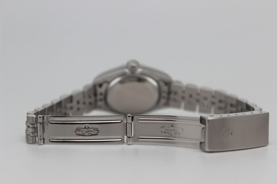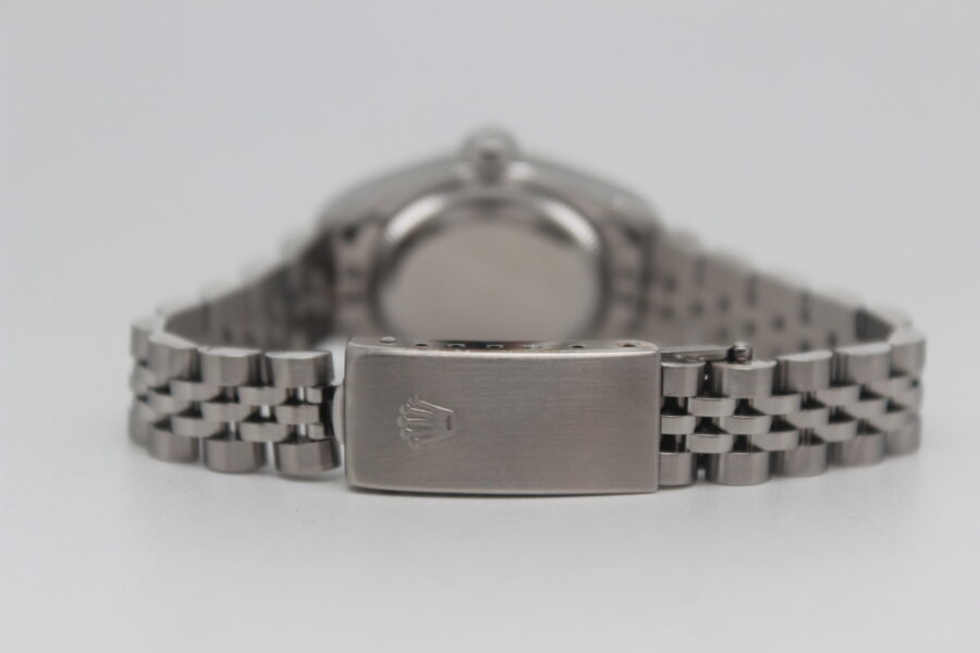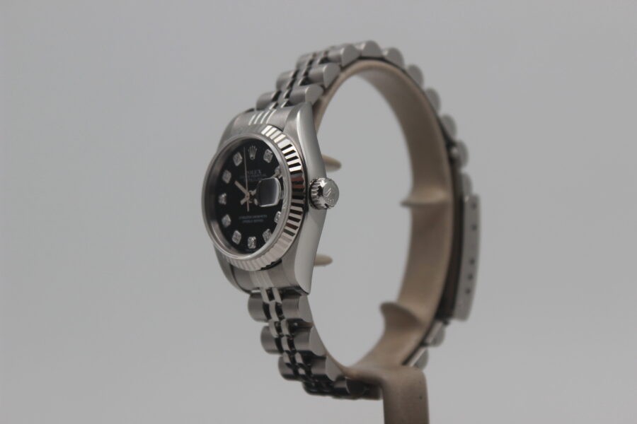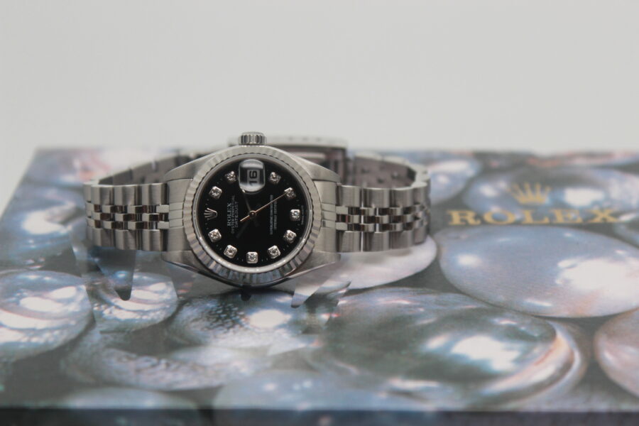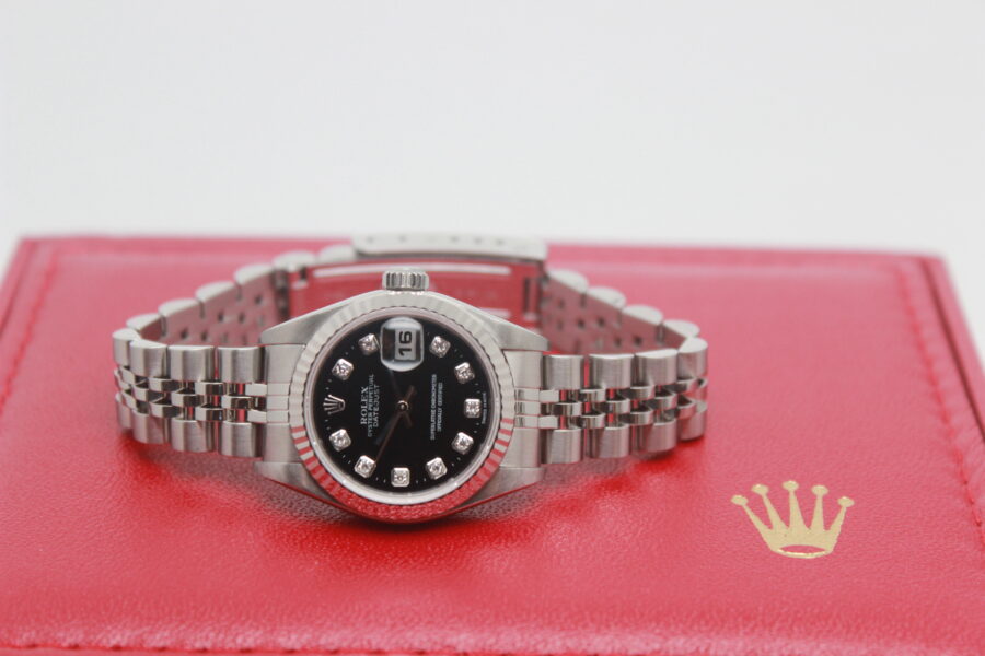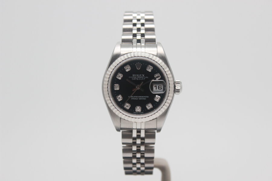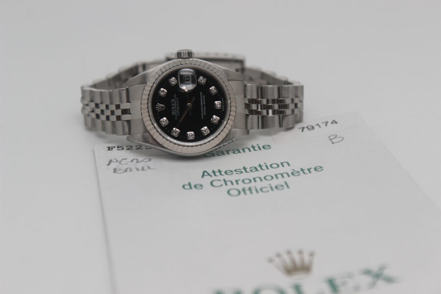 Rolex Lady-Datejust 79174 Full Set, 26mm steel case, black dial with diamonds, knurled bezel in white gold, Jubilee bracelet in polished and satin steel with steel cassette closure. This model is equipped with a self-winding mechanical movement of caliber 2235, with a date display at 3 o’clock. Complete with original Rolex box and warranty.