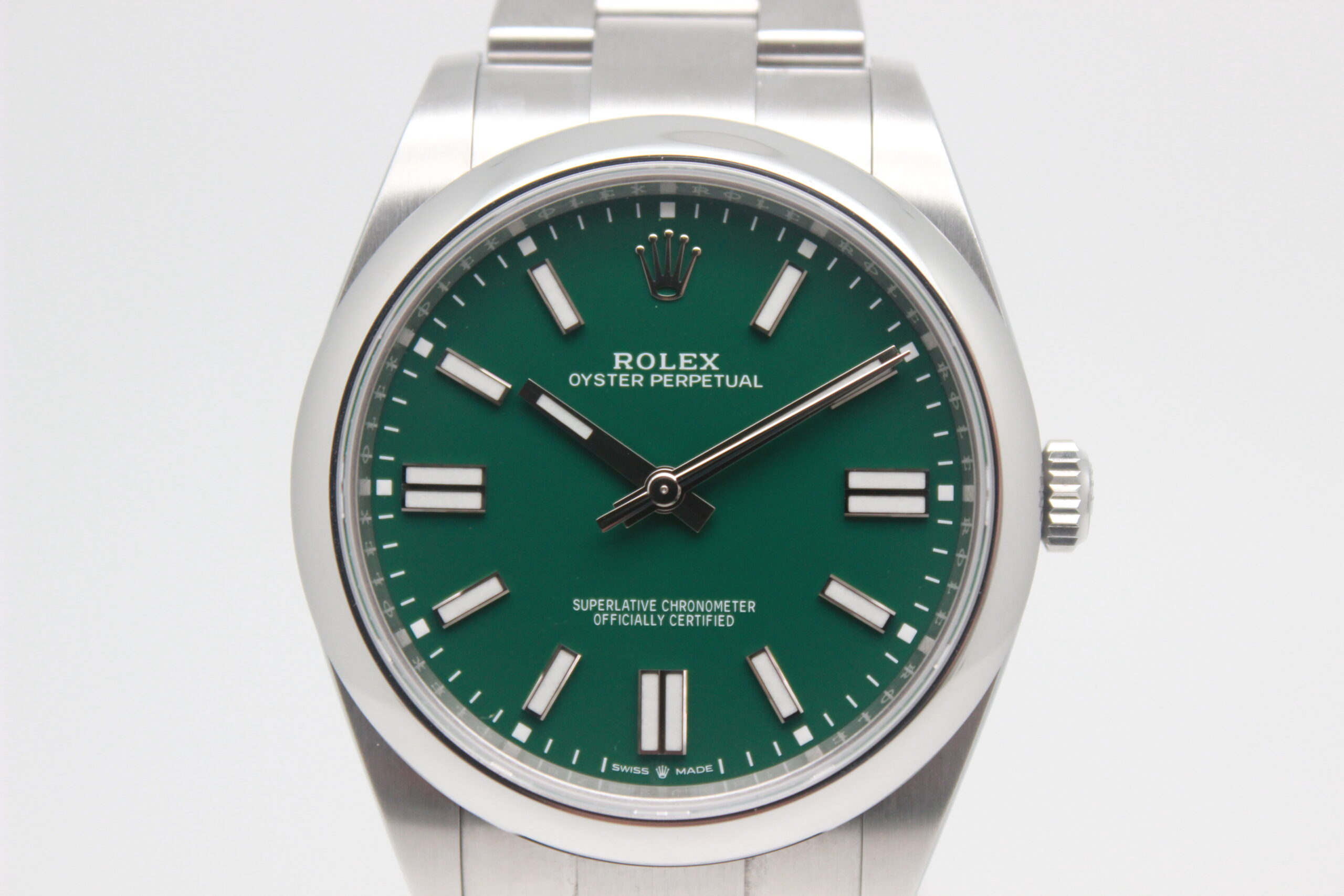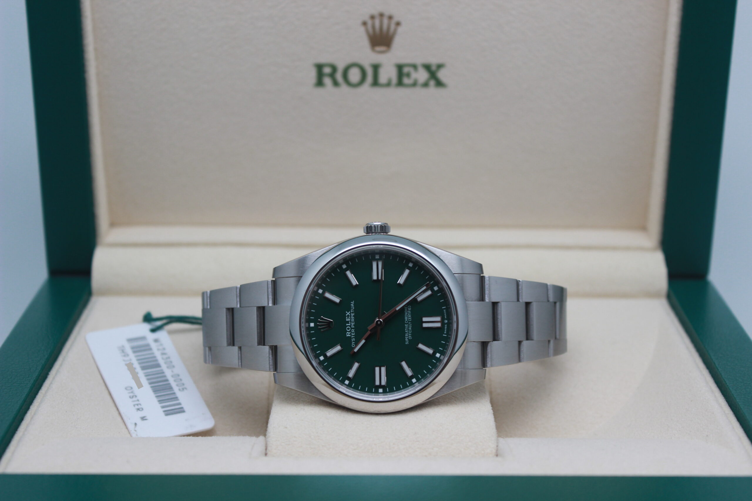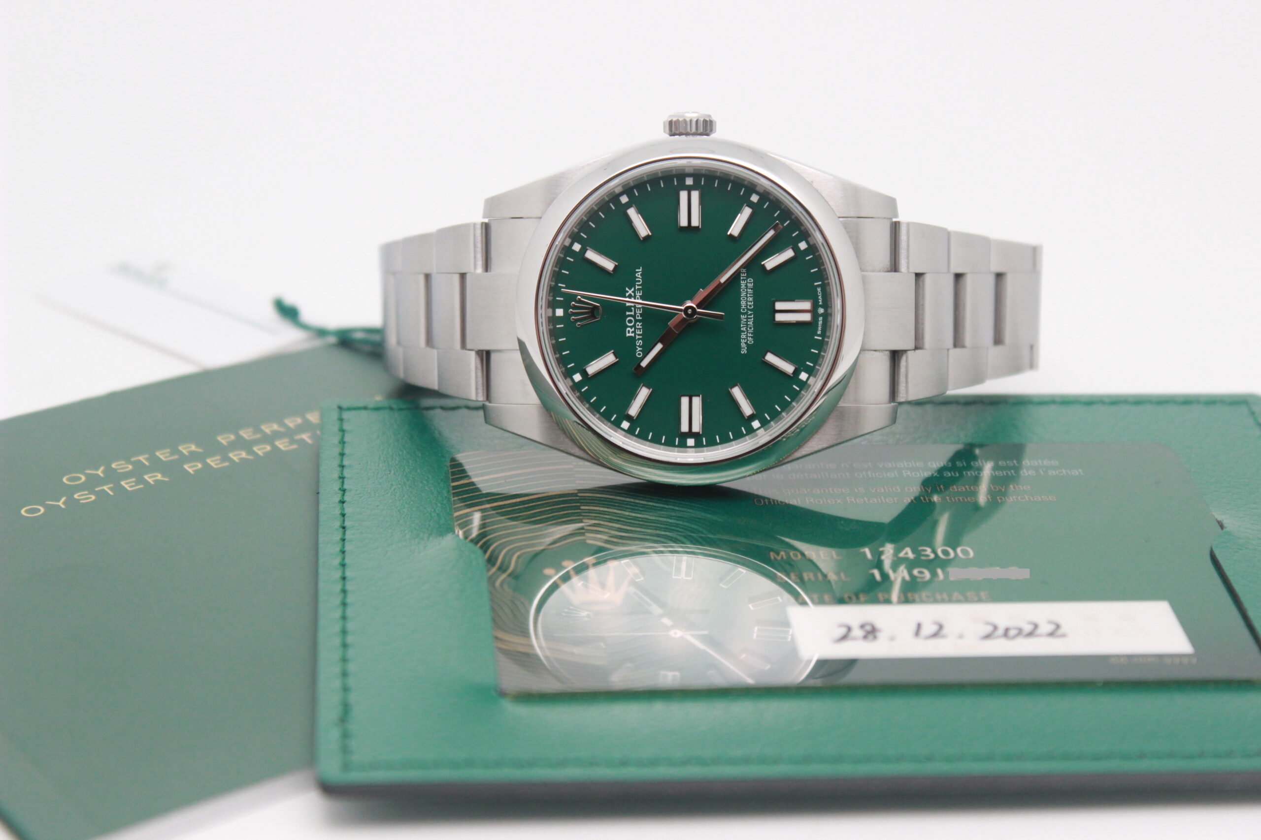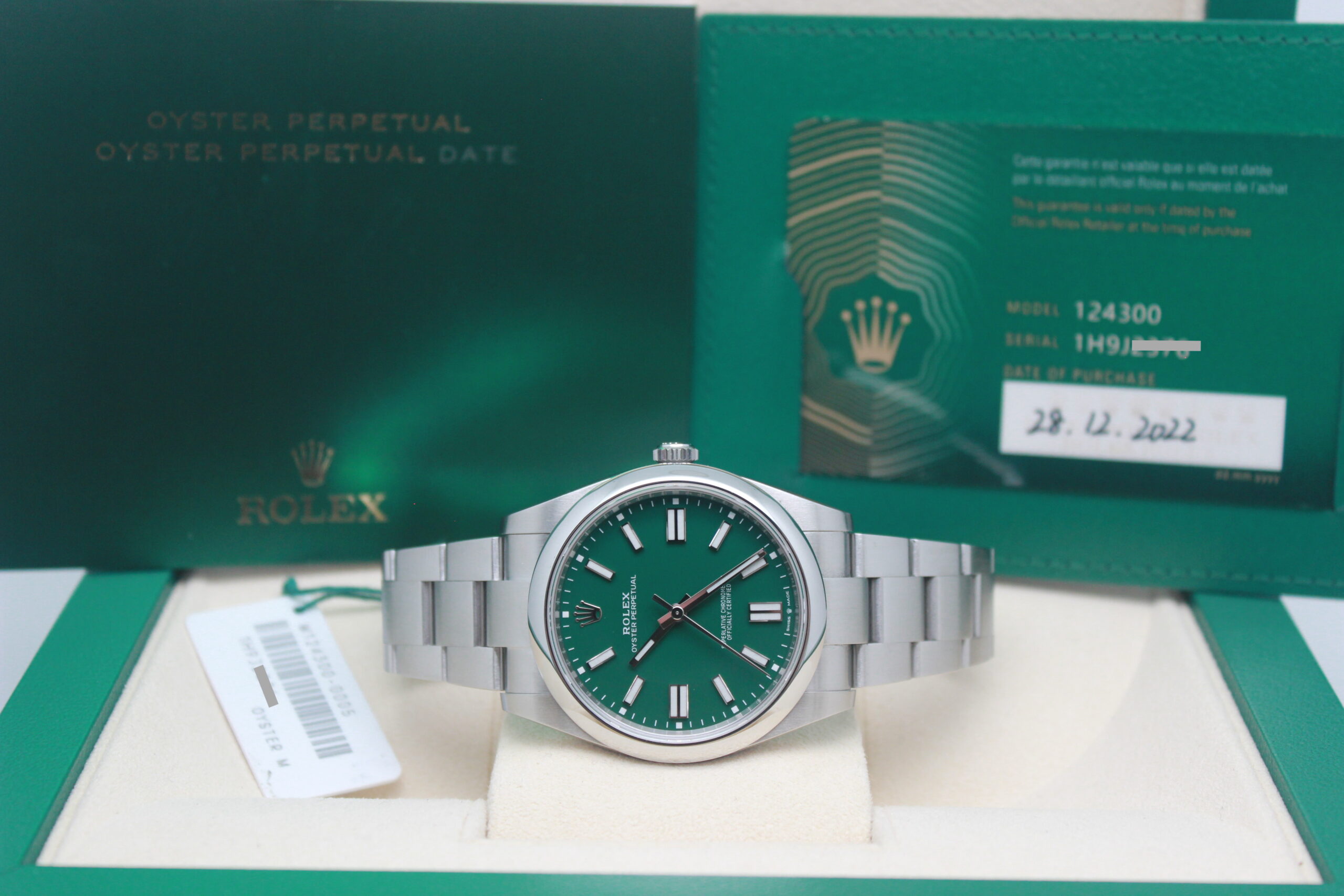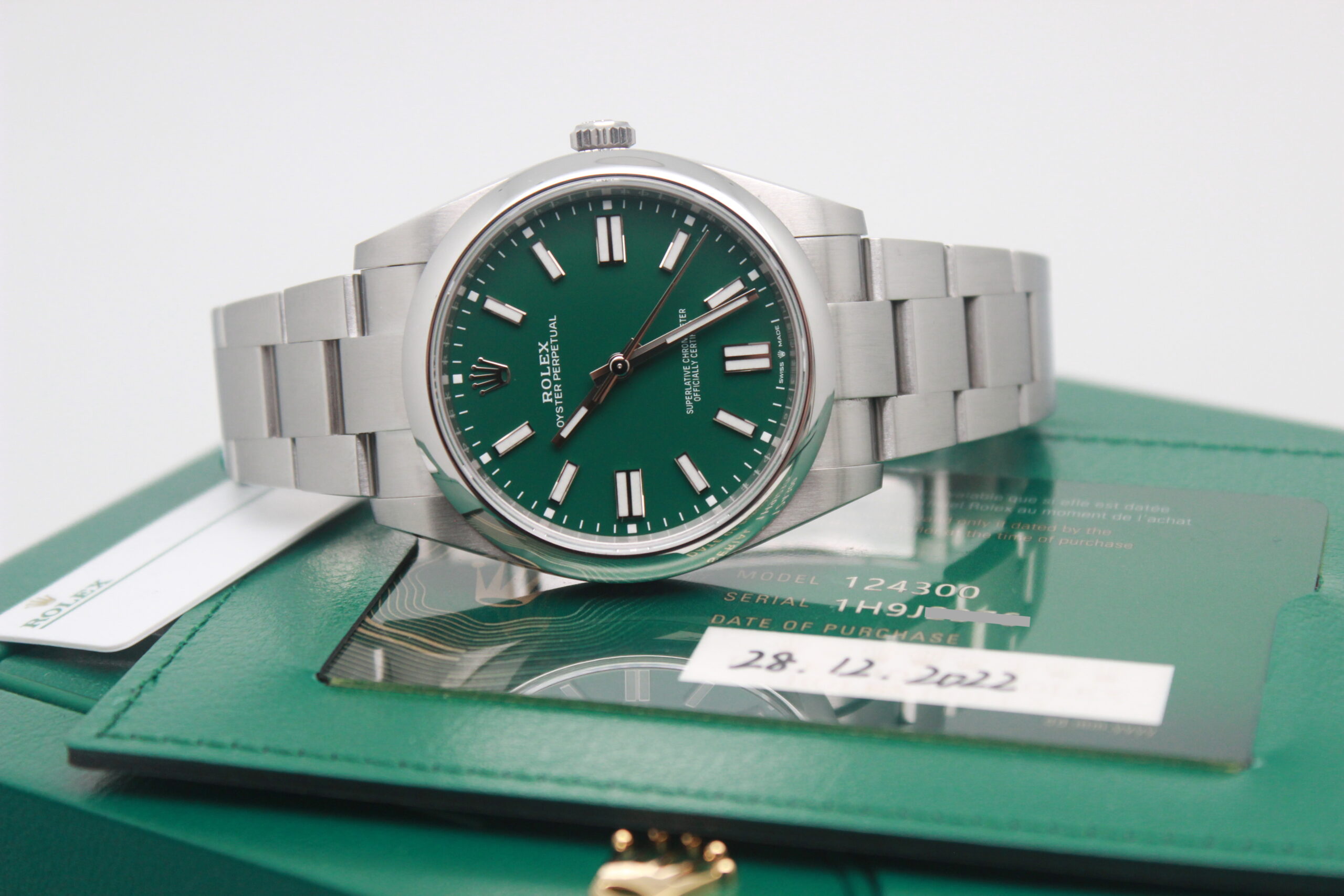 Rolex Oyster Perpetual 41 124300 Full Set 2022, 41mm Steel Case, Green Dial, Steel Bezel, Satin Steel Oyster Bracelet with Steel Oysterclasp Clasp. Comes with an original Rolex box and warranty card.