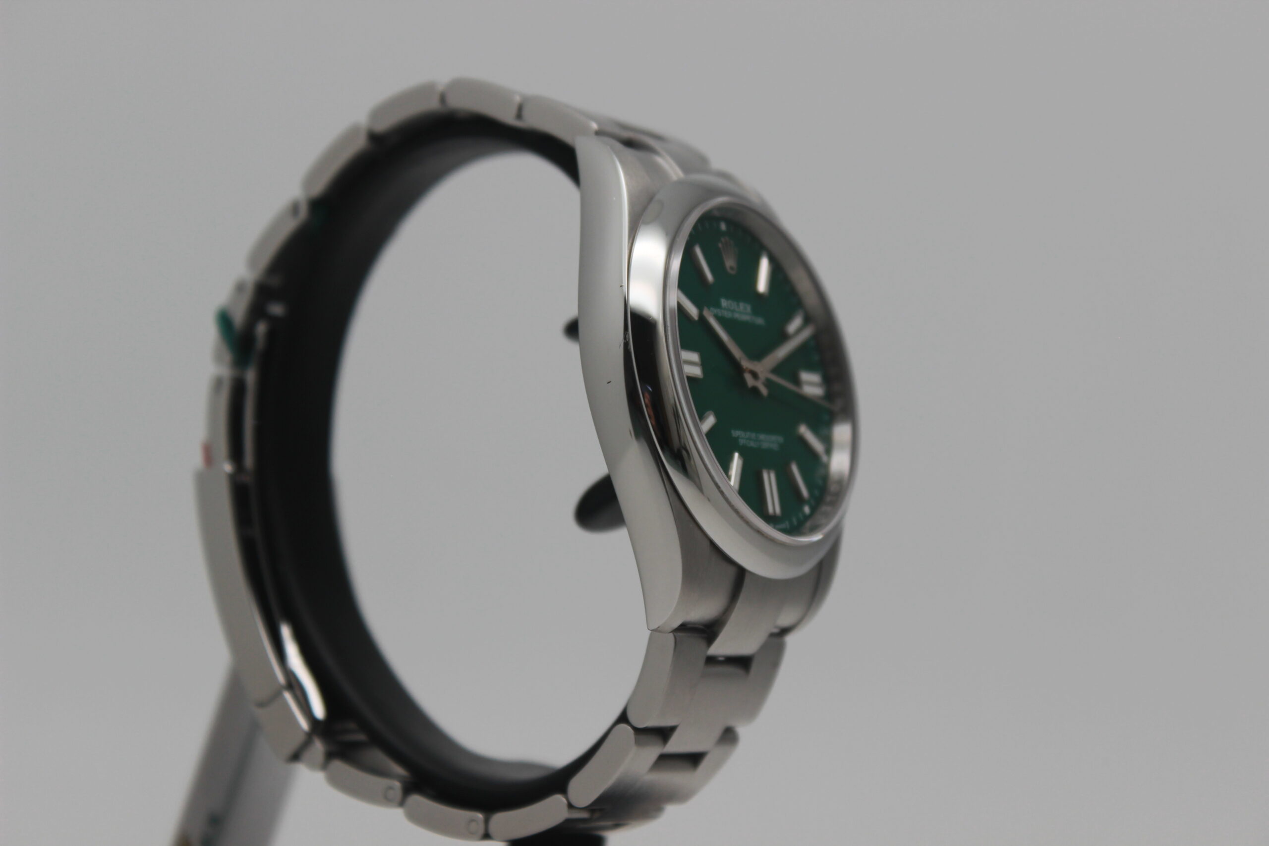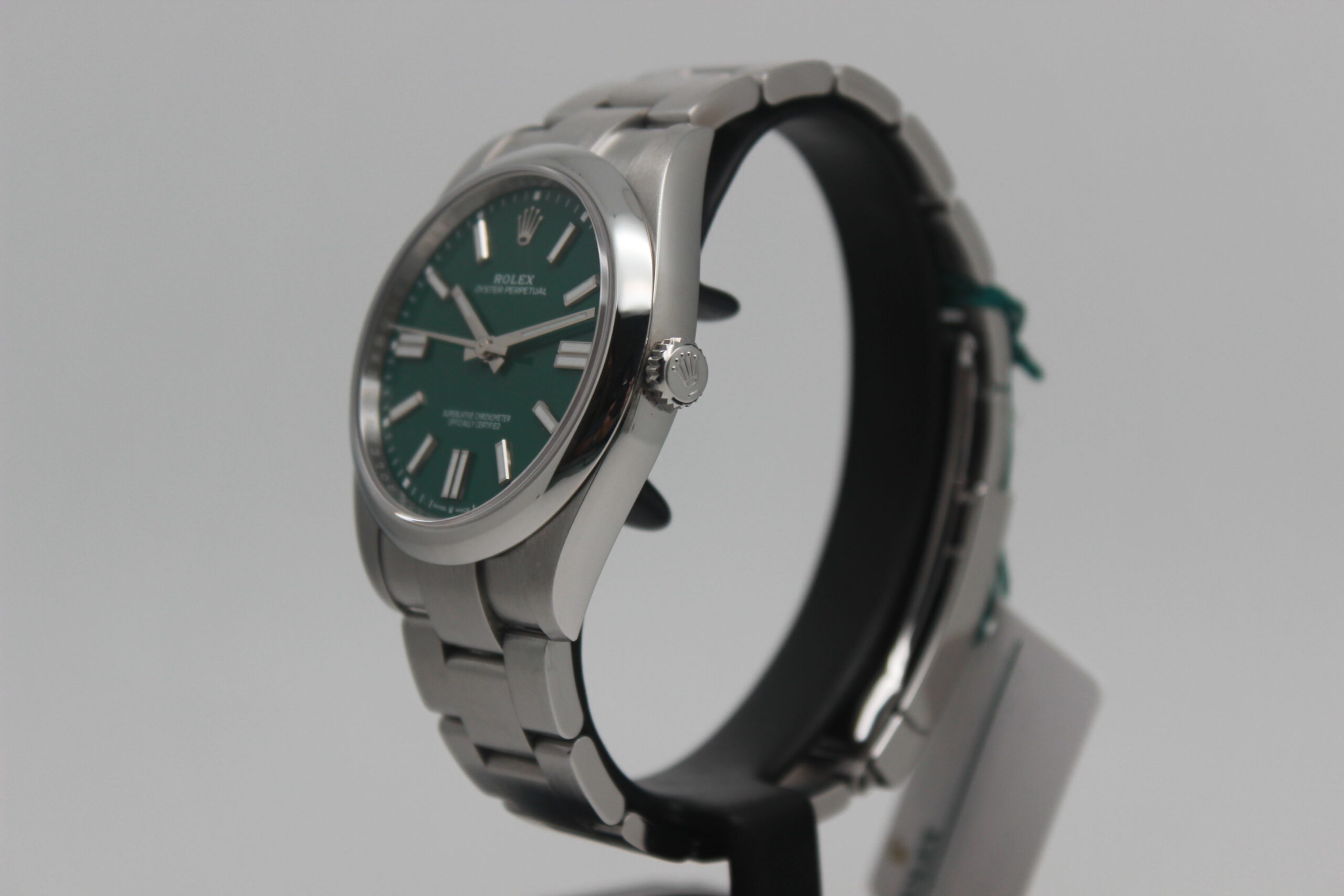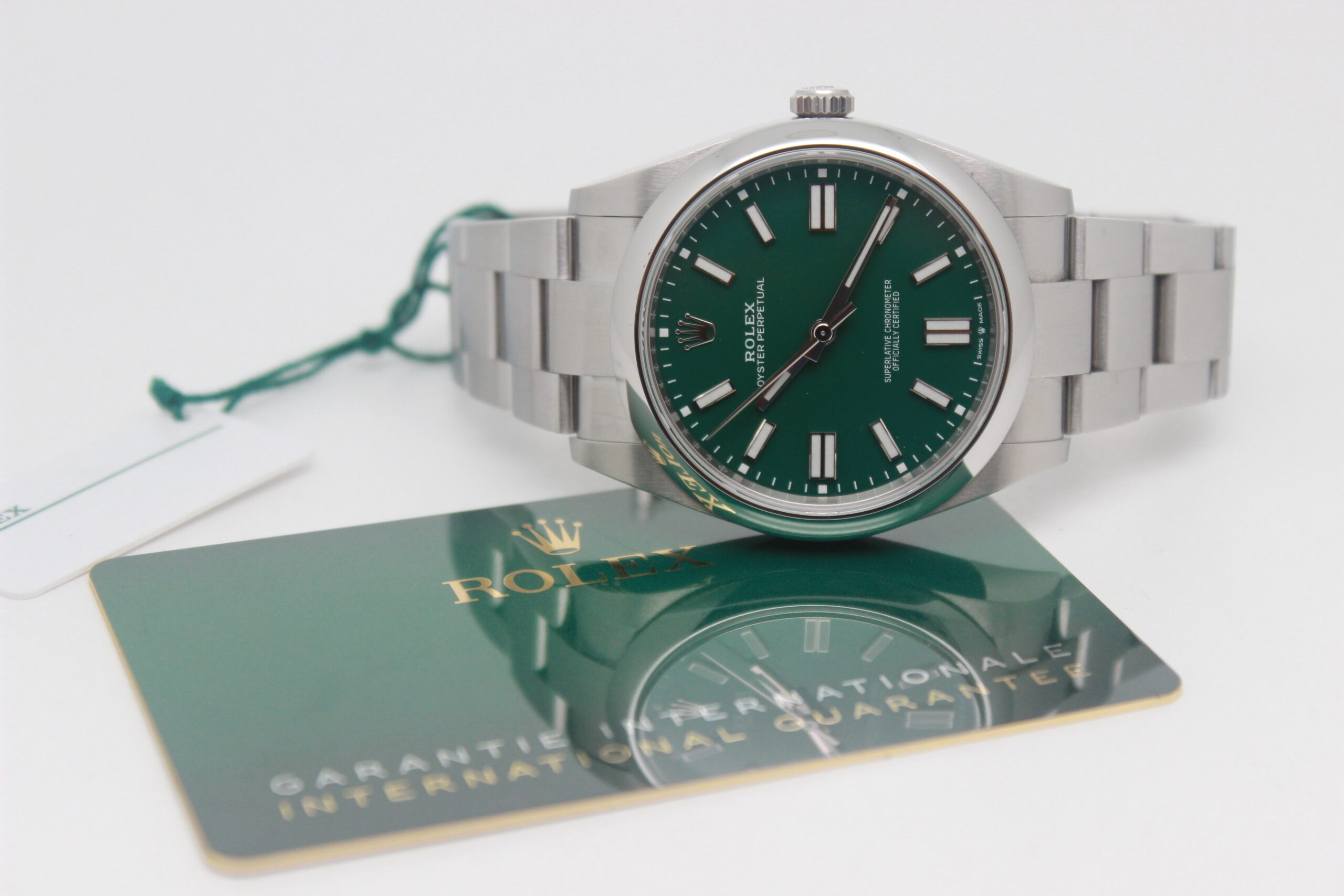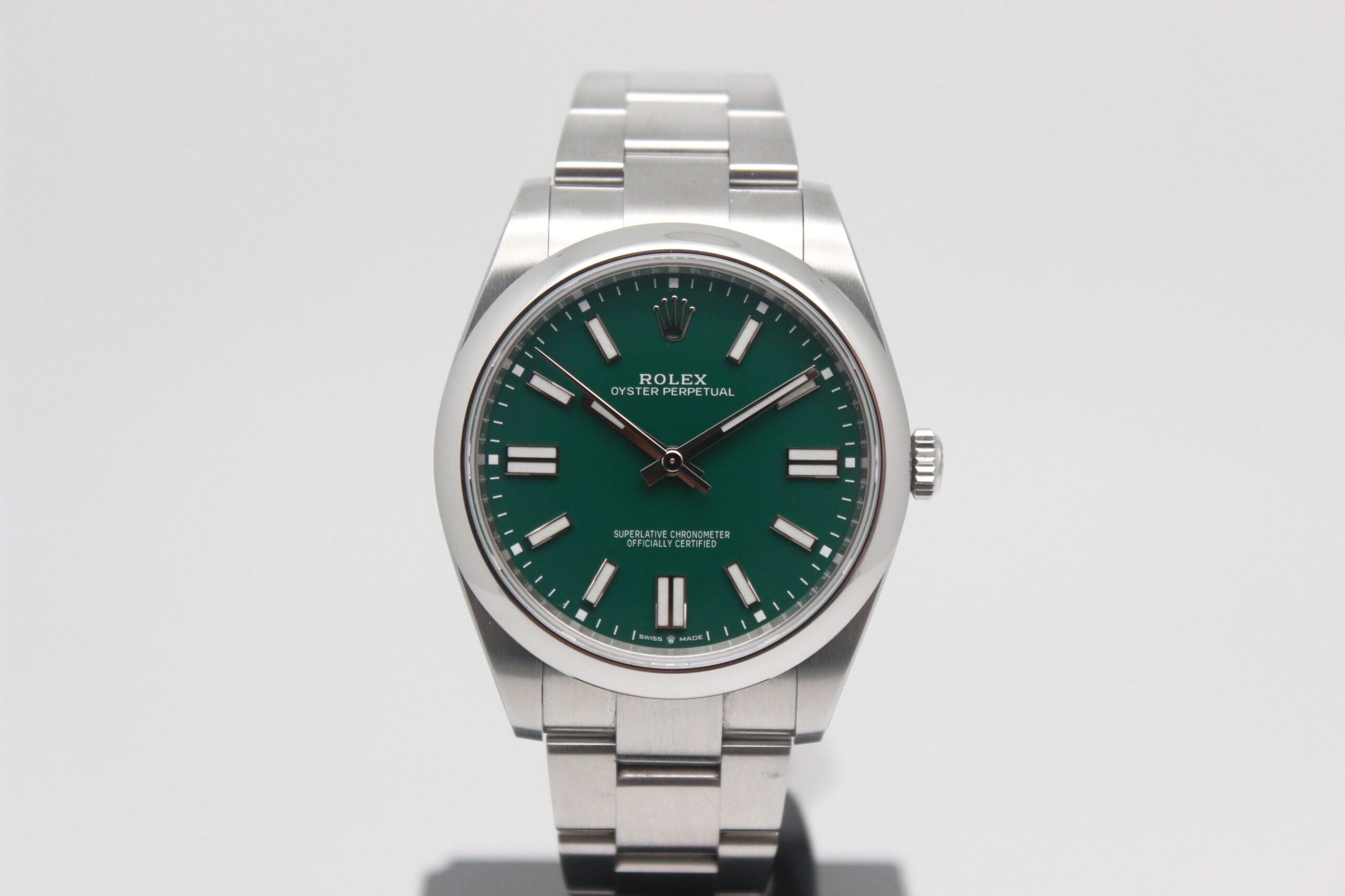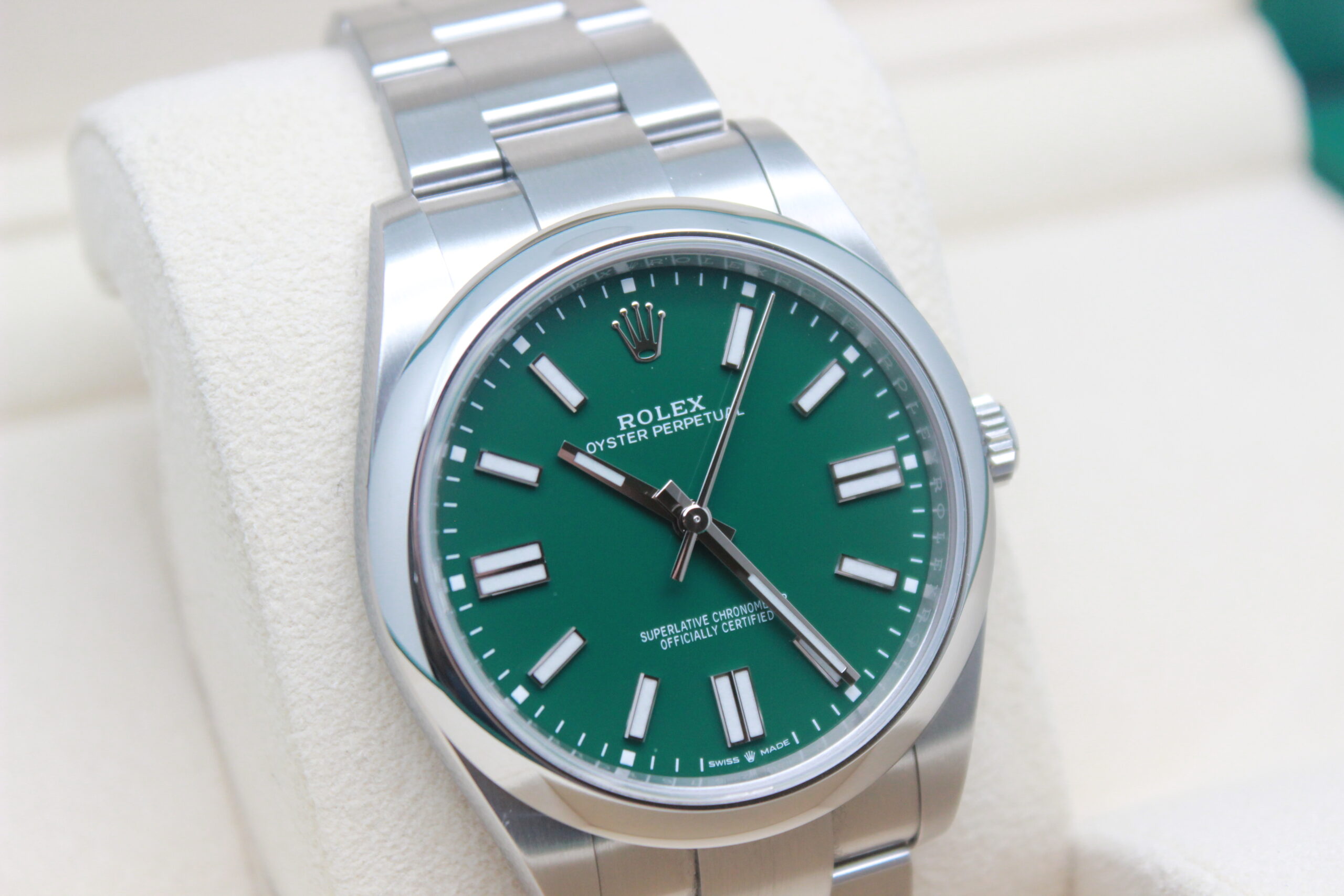 Rolex Oyster Perpetual 41 124300 Full Set 2022, 41mm Steel Case, Green Dial, Steel Bezel, Satin Steel Oyster Bracelet with Steel Oysterclasp Clasp. Comes with an original Rolex box and warranty card.