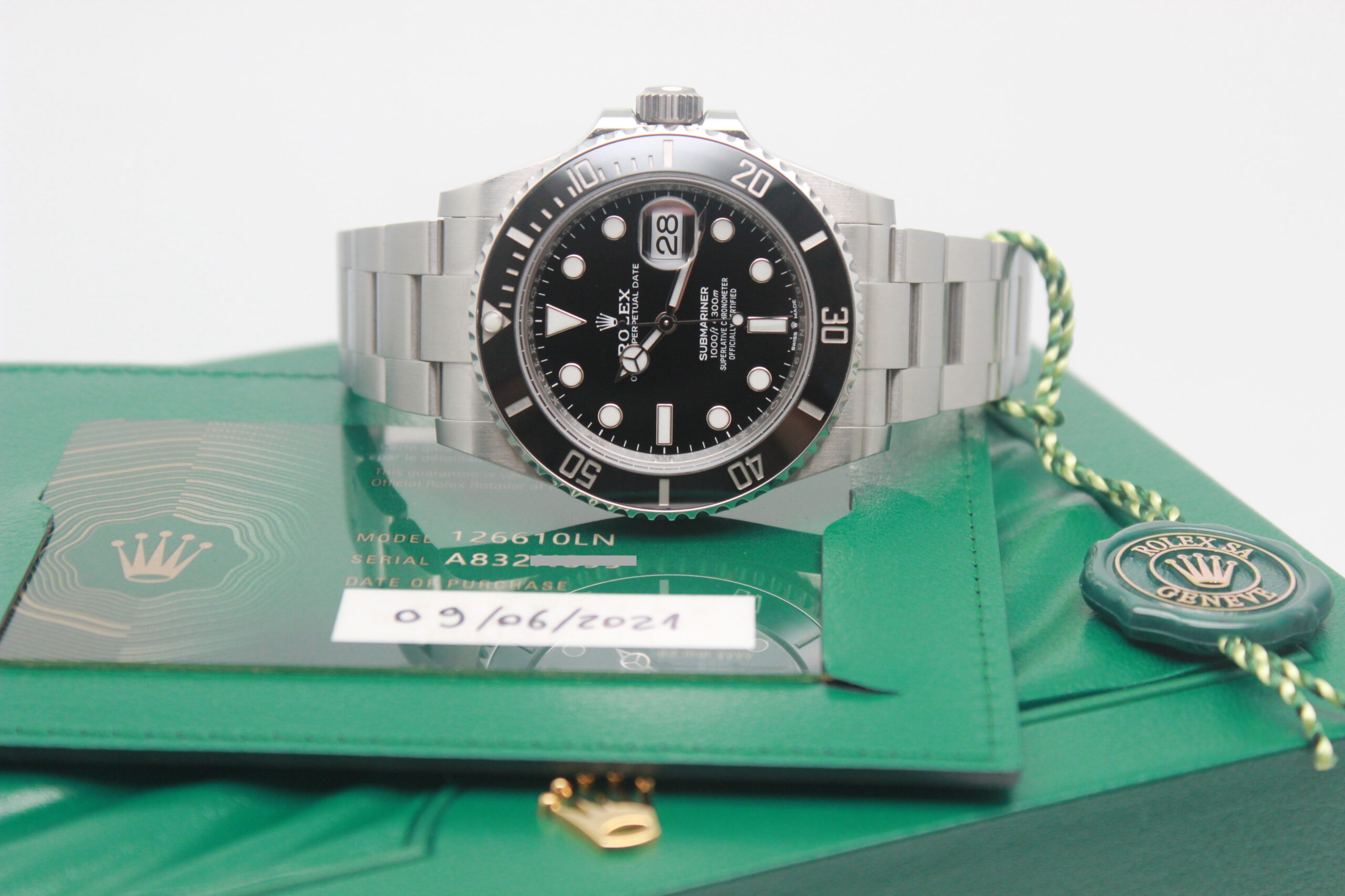Rolex Submariner Date 126610LN Full Set 2021, 41 x 40mm Steel Case, Steel Bezel with Black Ceramic Insert, Satin Steel Oyster Bracelet with Steel Oysterlock Clasp. This model features a 3135 gauge self-winding mechanical movement. Comes with an original Rolex box and warranty card.