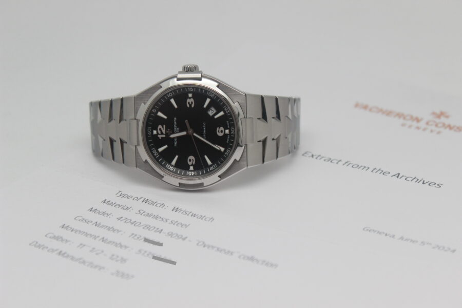 Vacheron Constantin Overseas 47040/B01A-9094 Full Set 2007, 42 mm steel case, black dial, steel bezel, steel bracelet with steel folding clasp. Complete with box and original Vacheron Constantin documents.