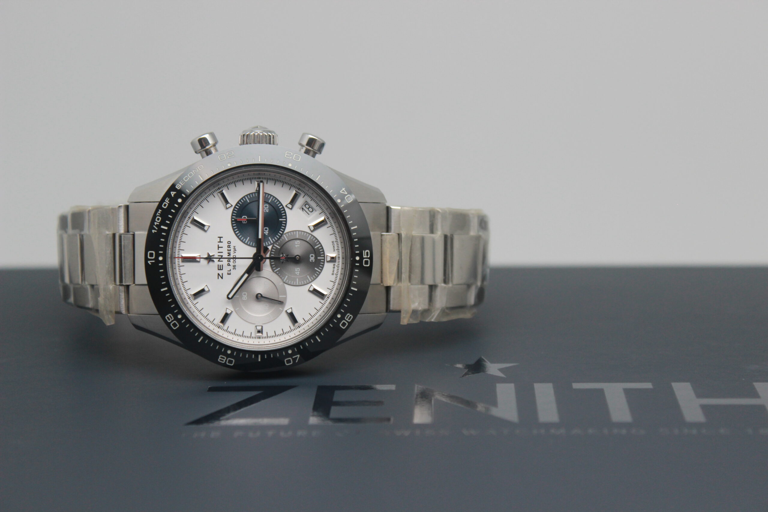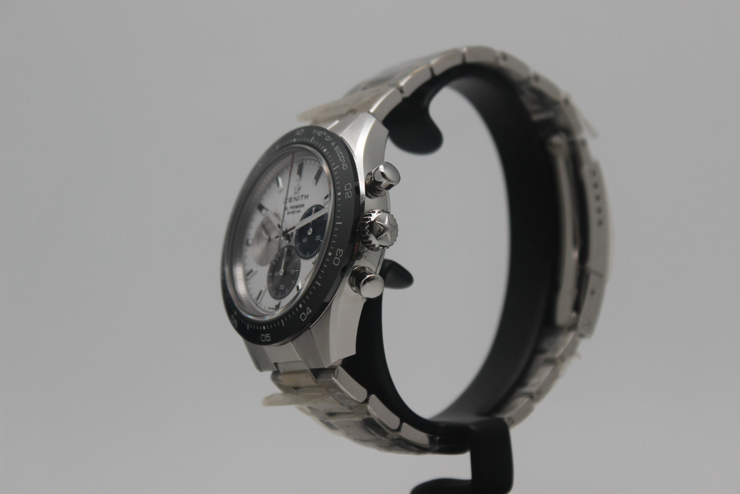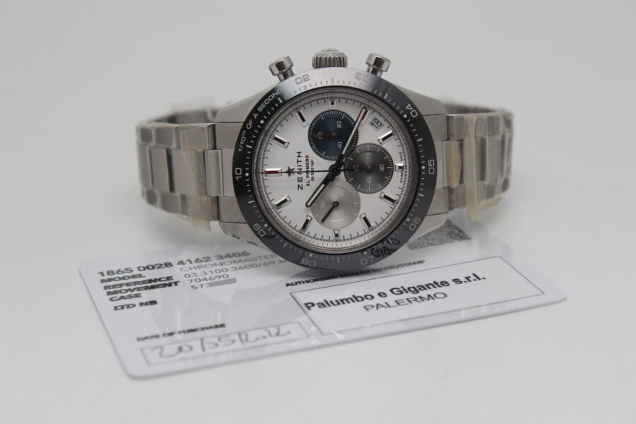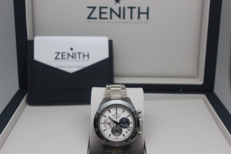 Zenith Chronomaster Sport 03.3100.3600/69.M3100 Full Set 2022, full stickers, 41 mm steel case, white dial, black ceramic bezel, polished and satin steel strap with steel folding clasp. Complete with original Zenith box and guarantee card.