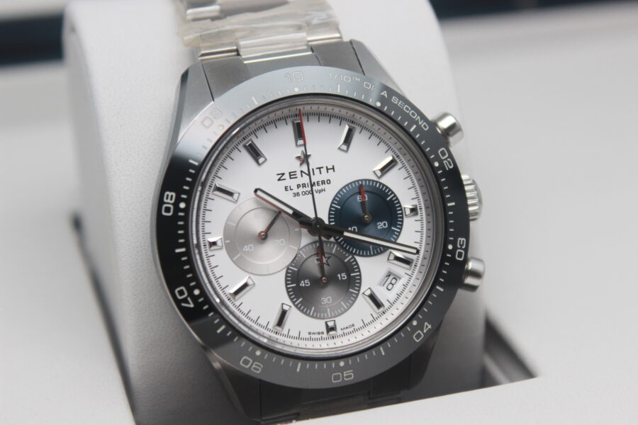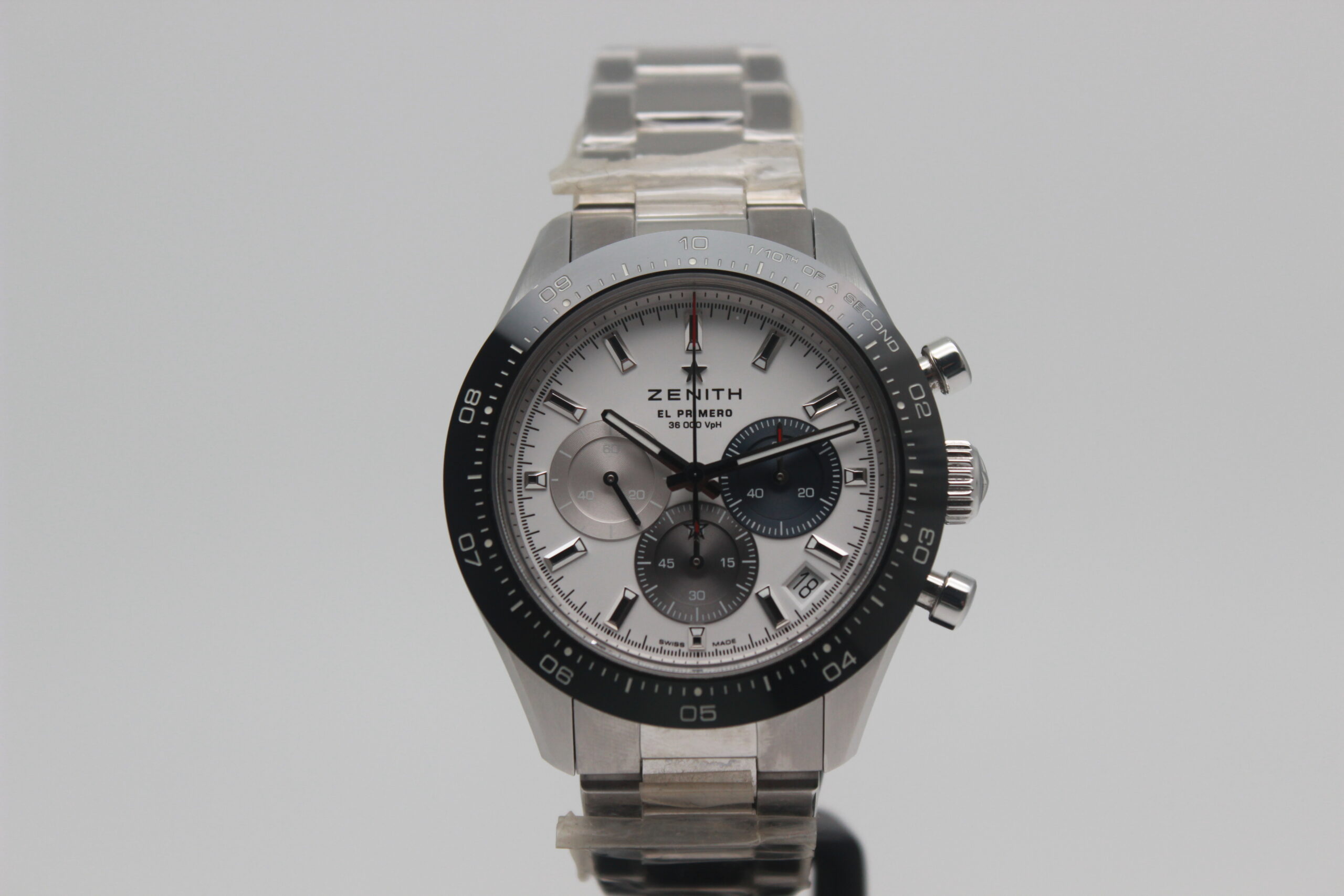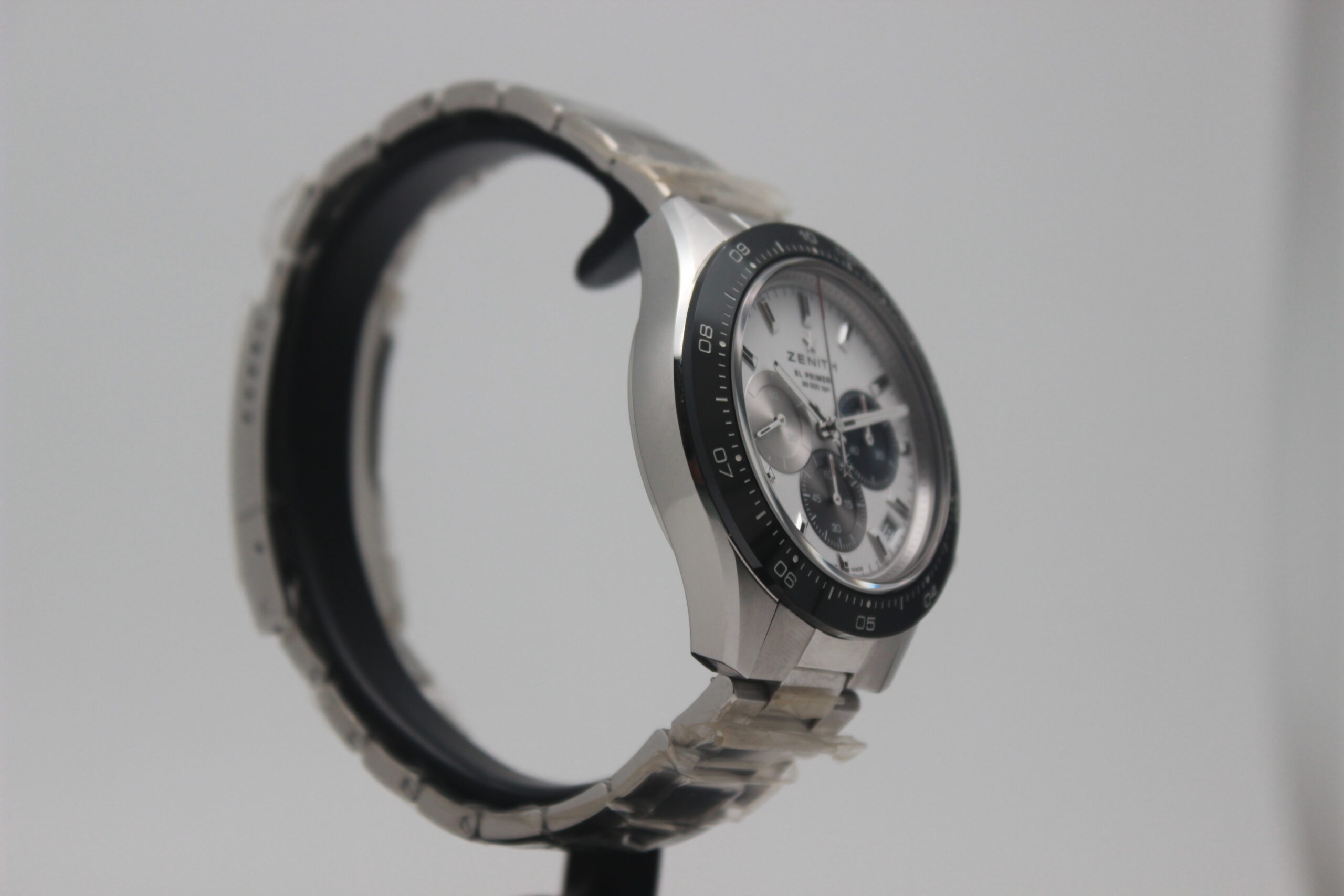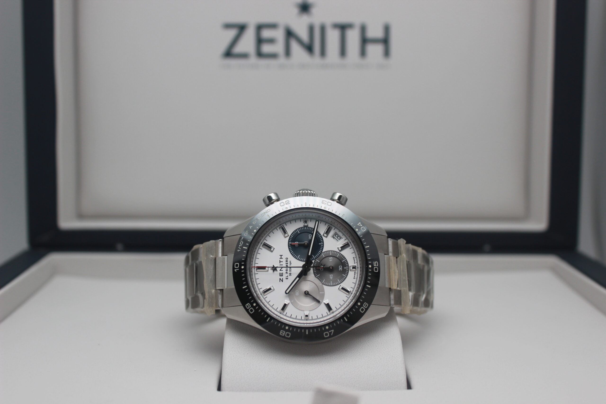 Zenith Chronomaster Sport 03.3100.3600/69.M3100 Full Set 2022, full stickers, 41 mm steel case, white dial, black ceramic bezel, polished and satin steel strap with steel folding clasp. Complete with original Zenith box and guarantee card.