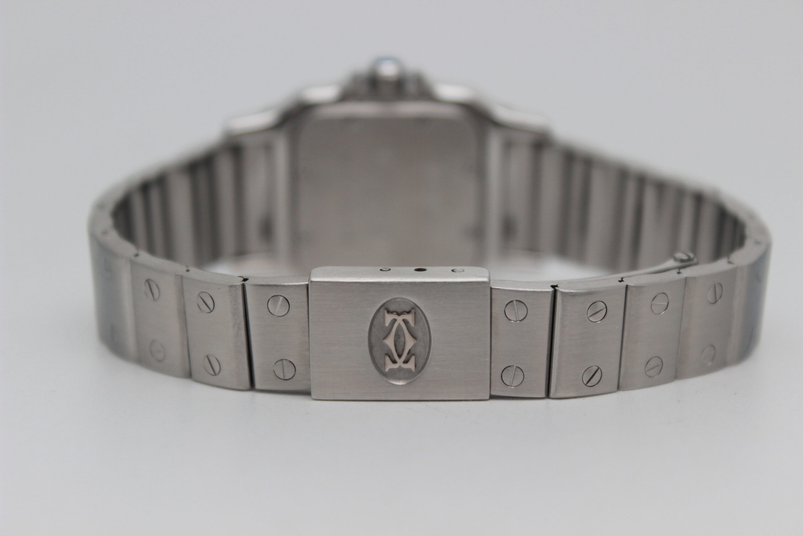 Cartier Lady Santos Galbée 1565, cassa in acciaio da 24 x 35 mm, quadrante bianco con numeri romani, lunetta in acciaio, cinturino in acciaio con chiusura déployante in acciaio.