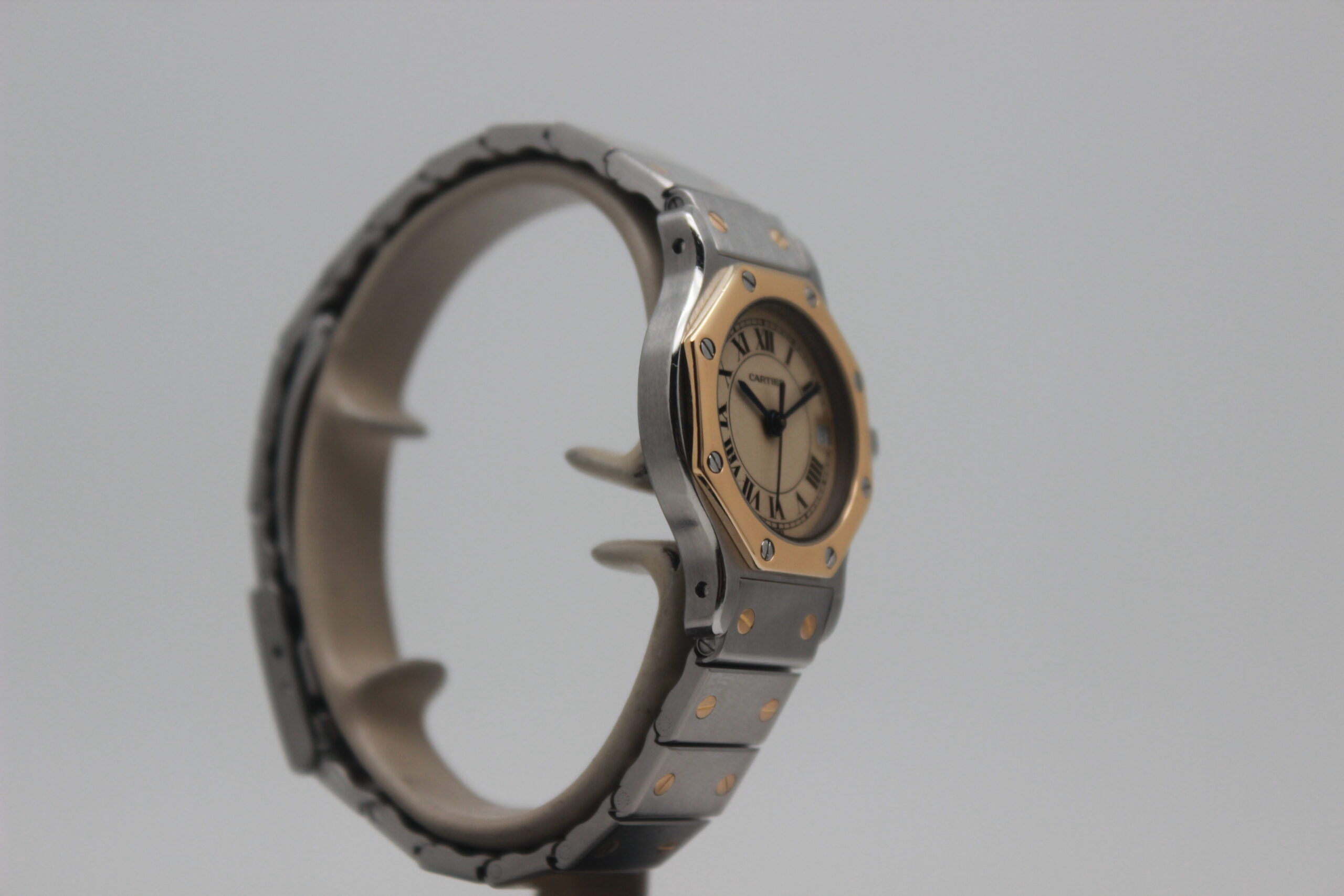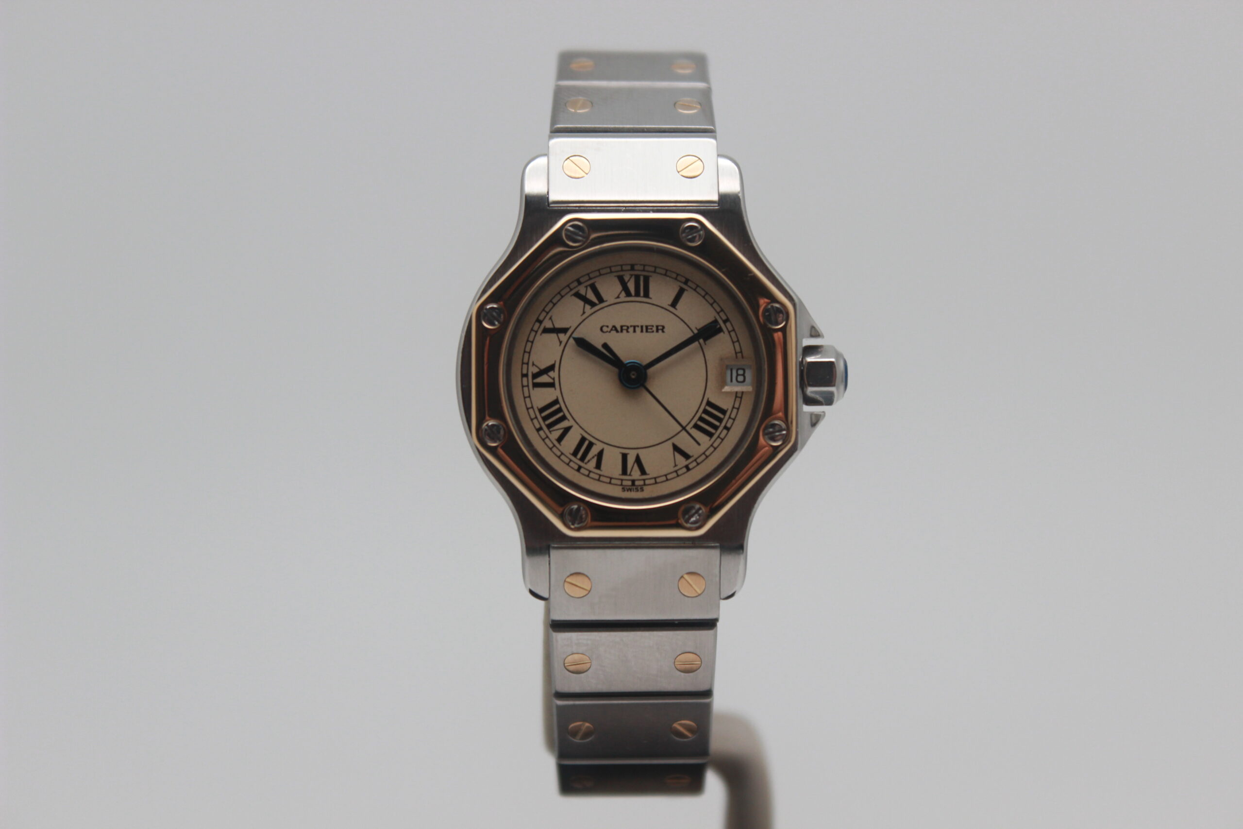 Cartier Lady Santos Octagon 187903, cassa in acciaio e oro da 25 mm, quadrante champagne con numeri romani e data, lunetta in oro giallo, cinturino in acciaio e oro con chiusura déployante.