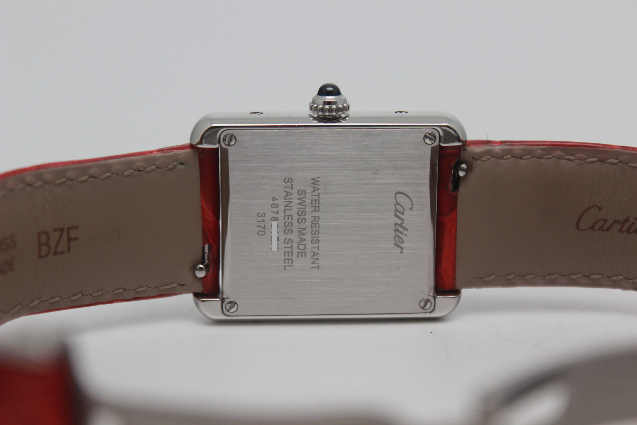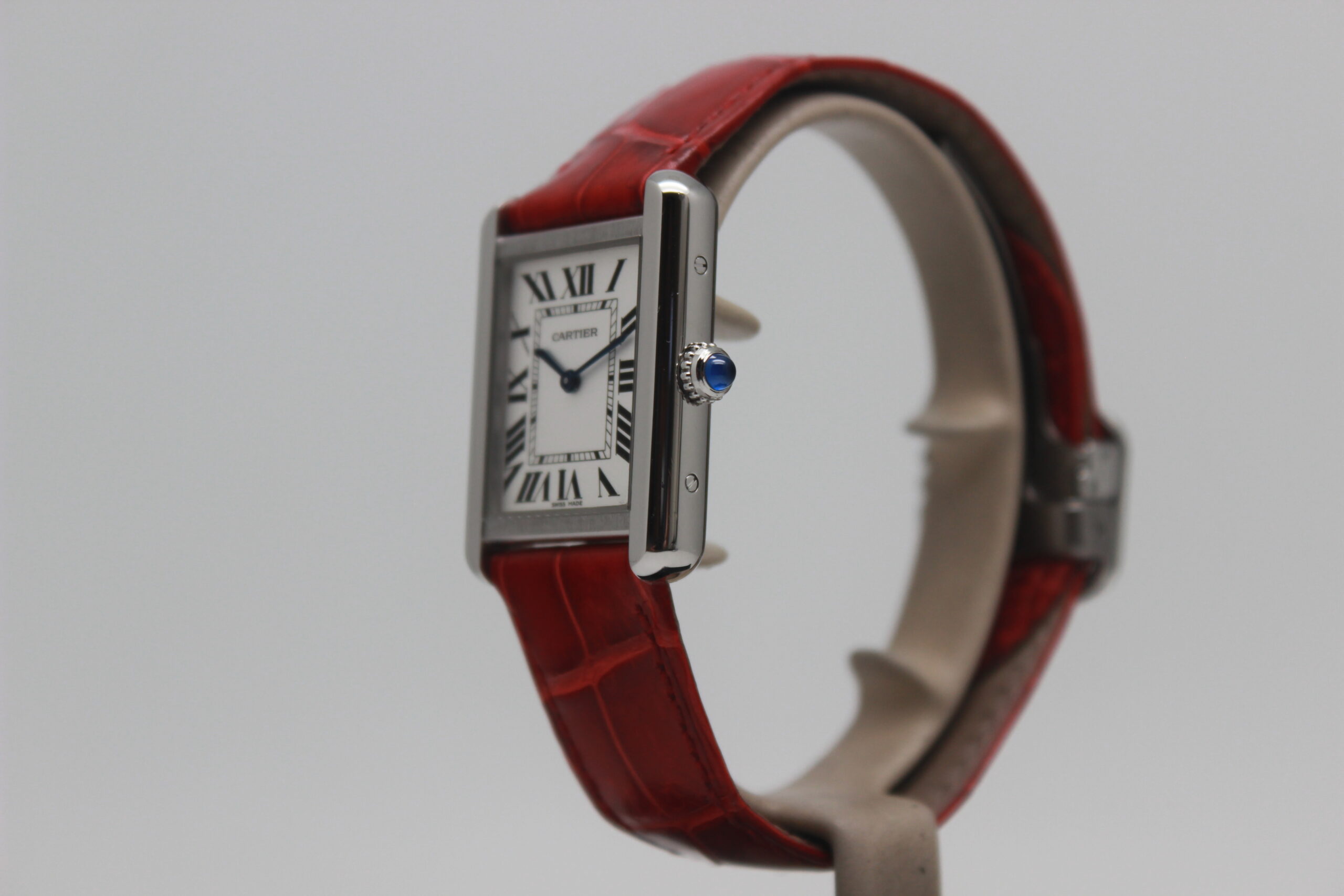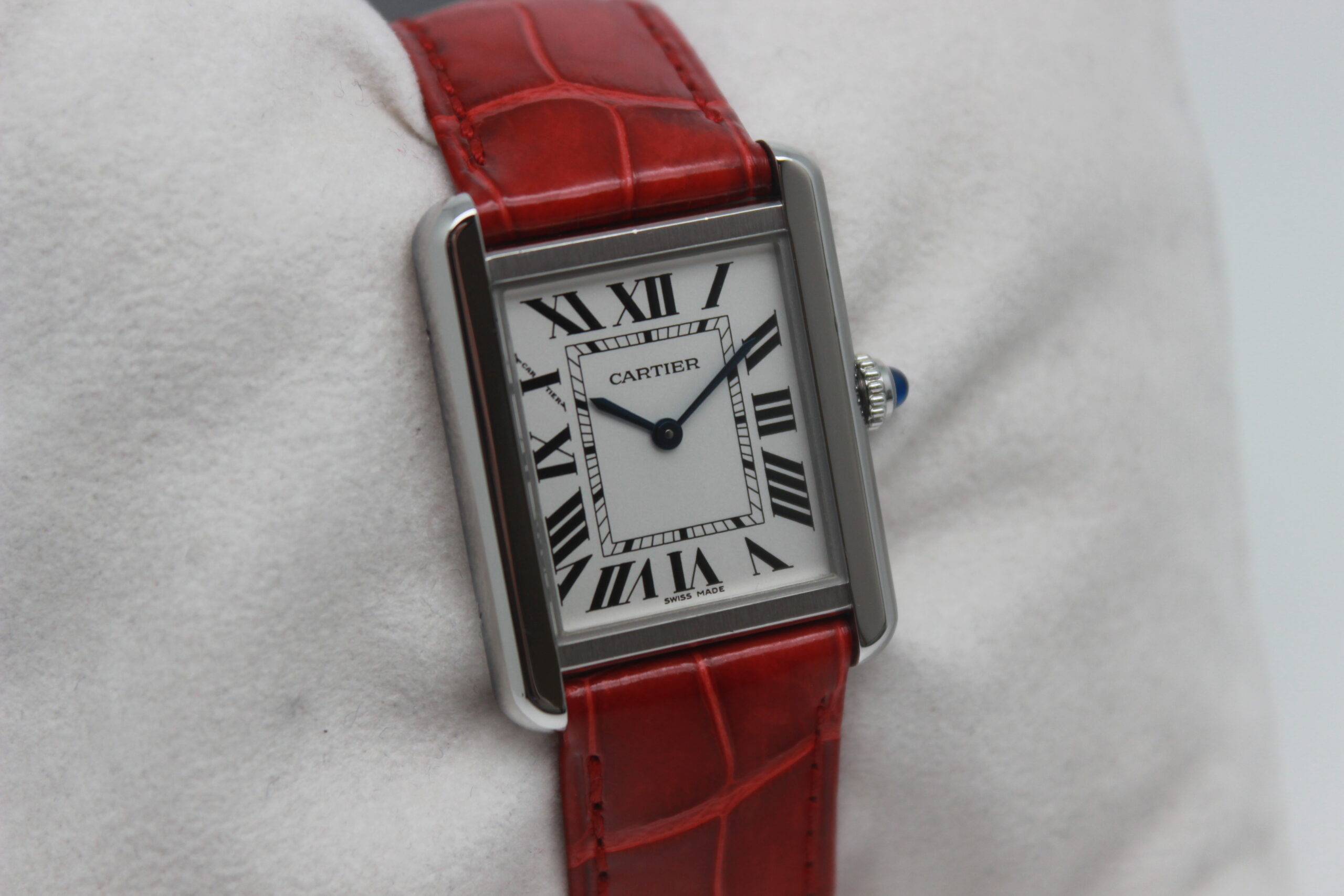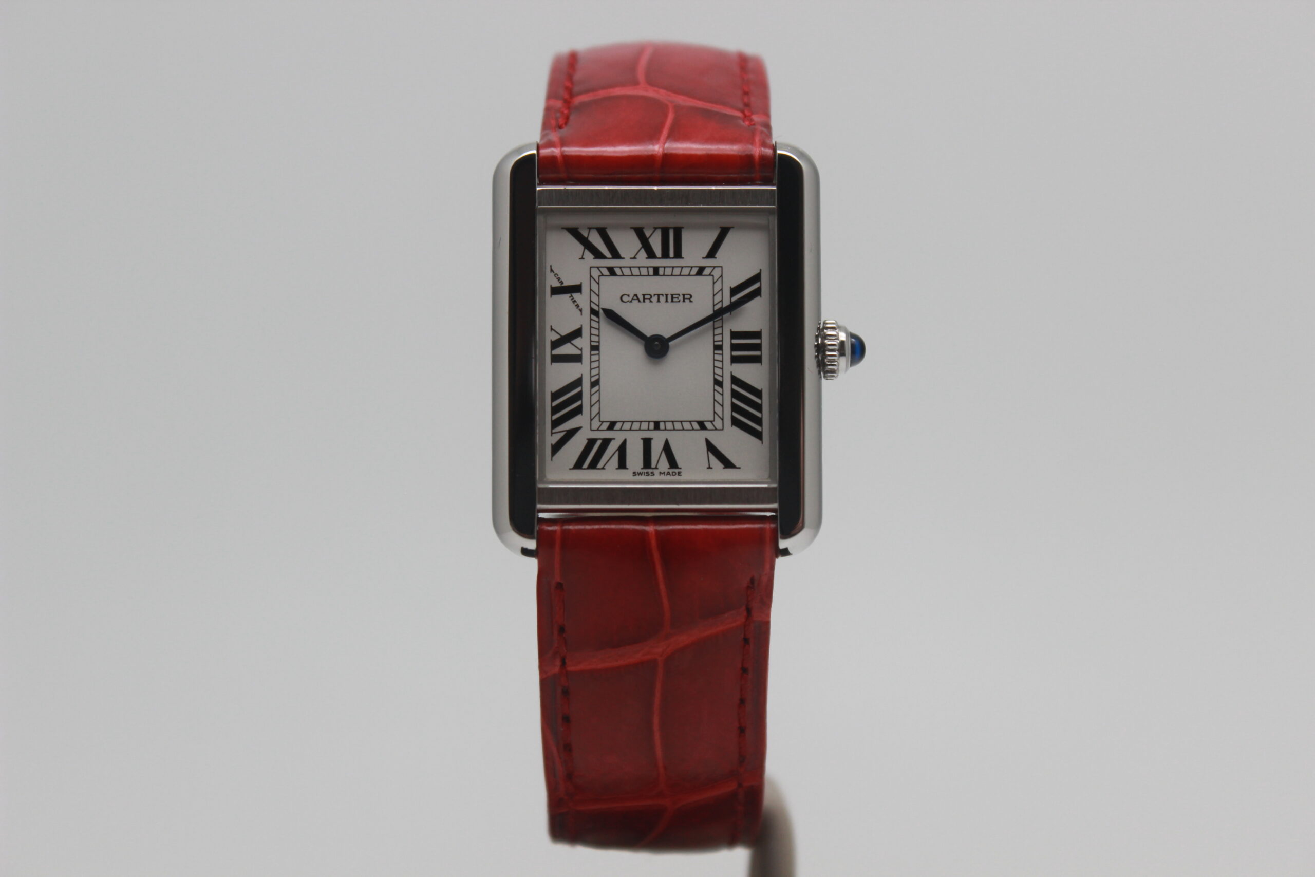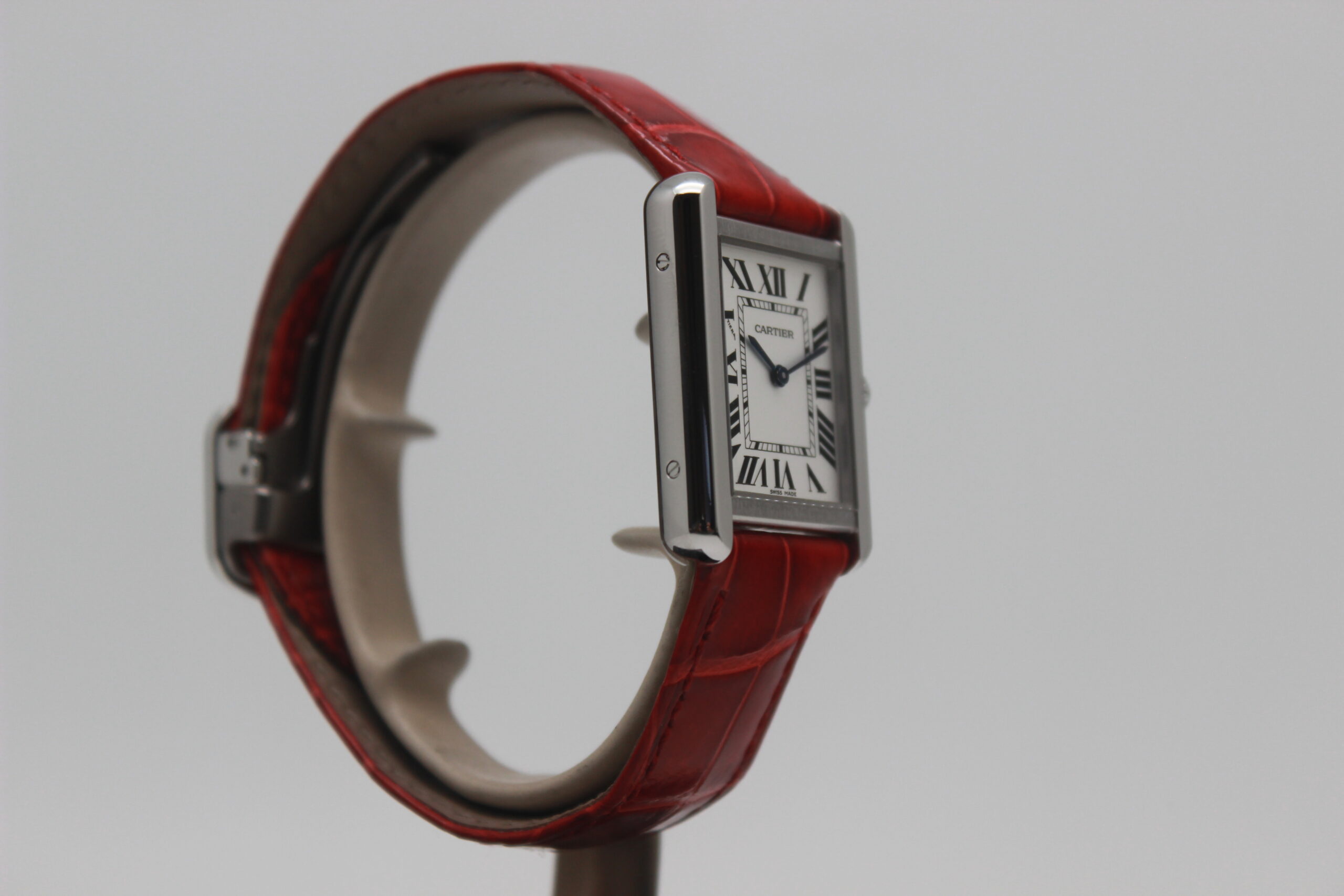 Cartier Lady Tank Solo 3170, cassa in acciaio da 24 x 31 mm, quadrante bianco con numeri romani, cinturino rosso in pelle con chiusura déployante in acciaio.