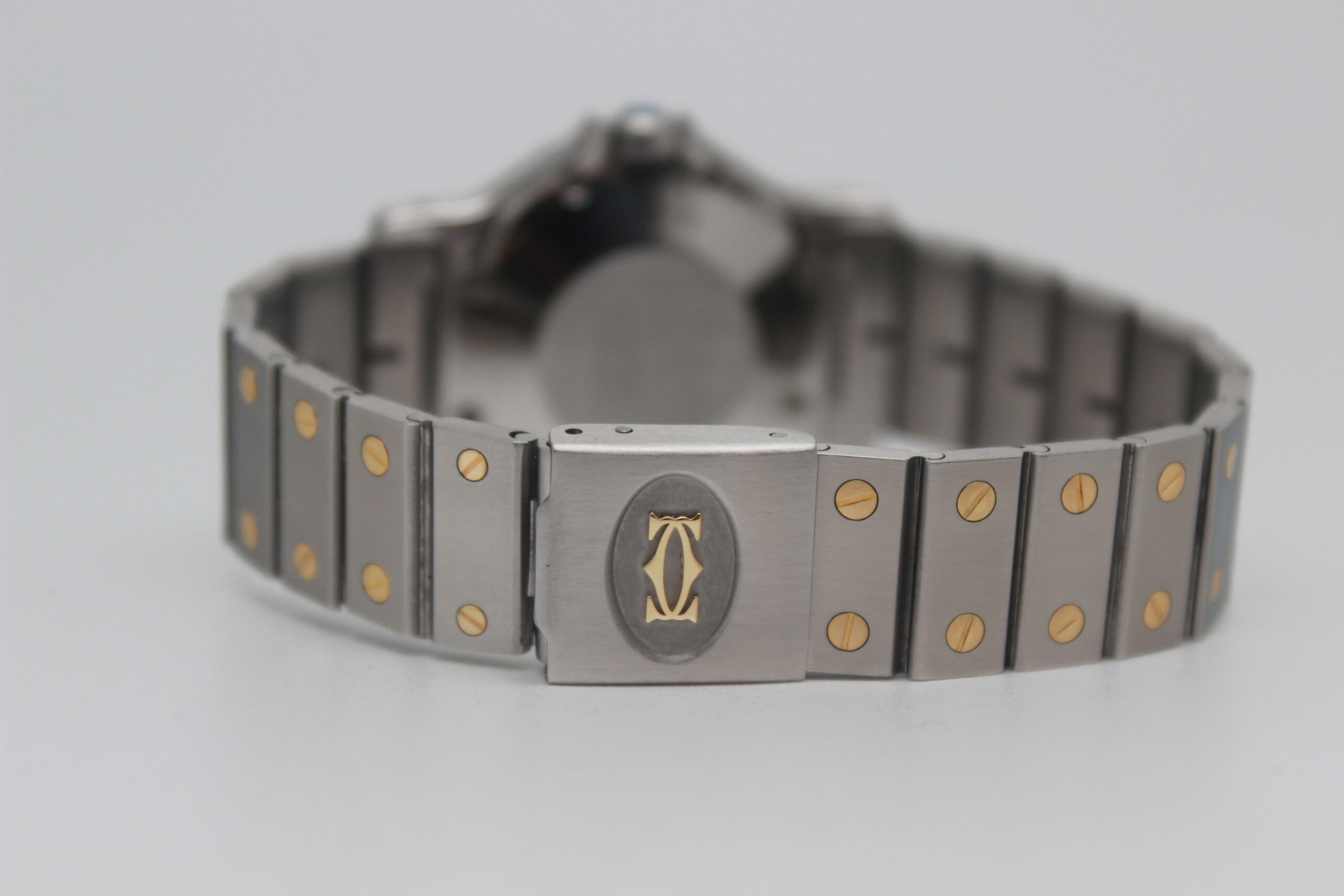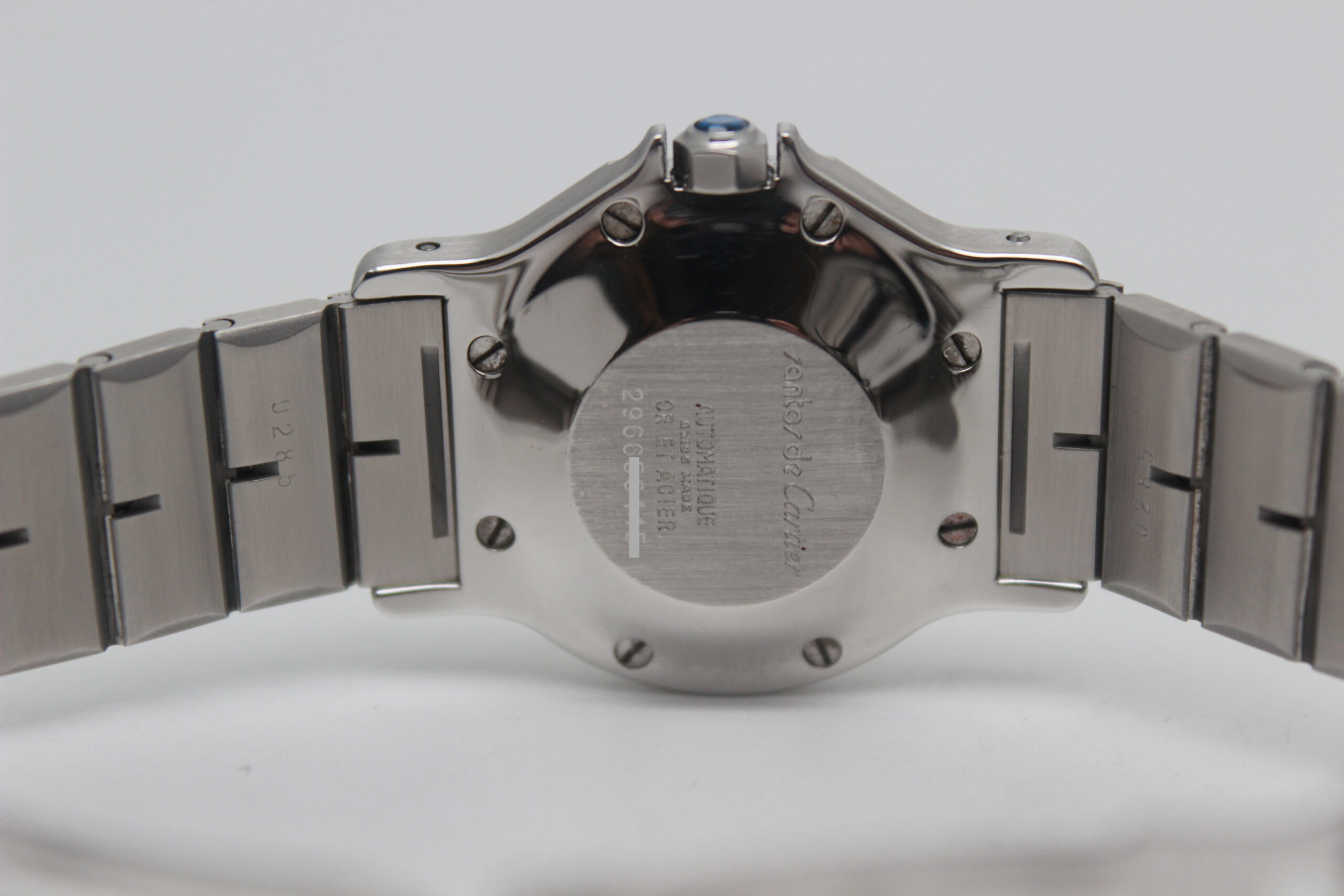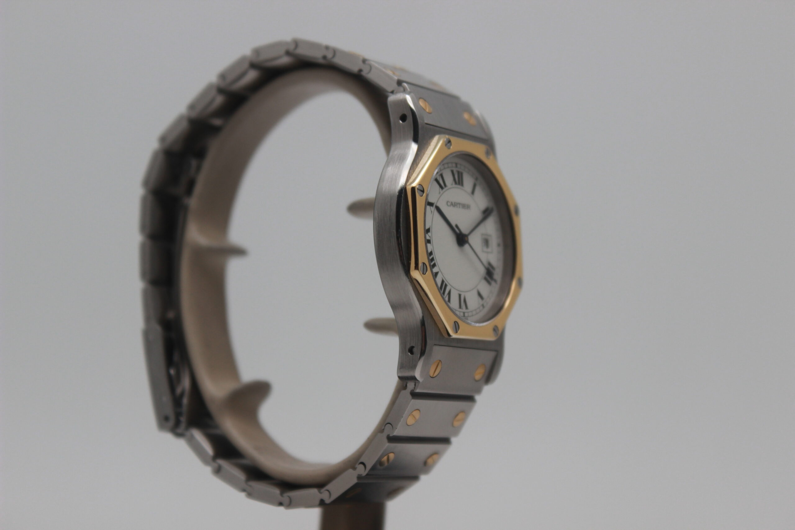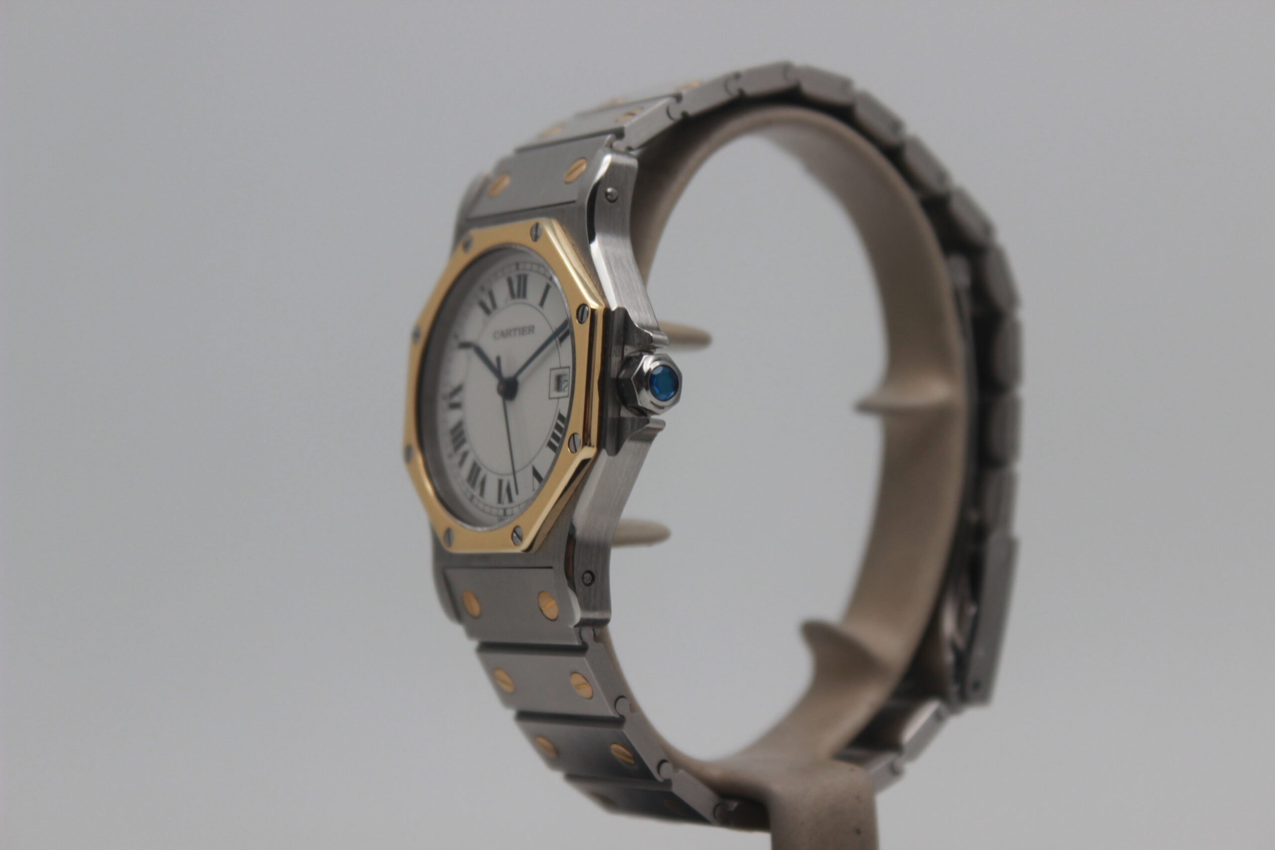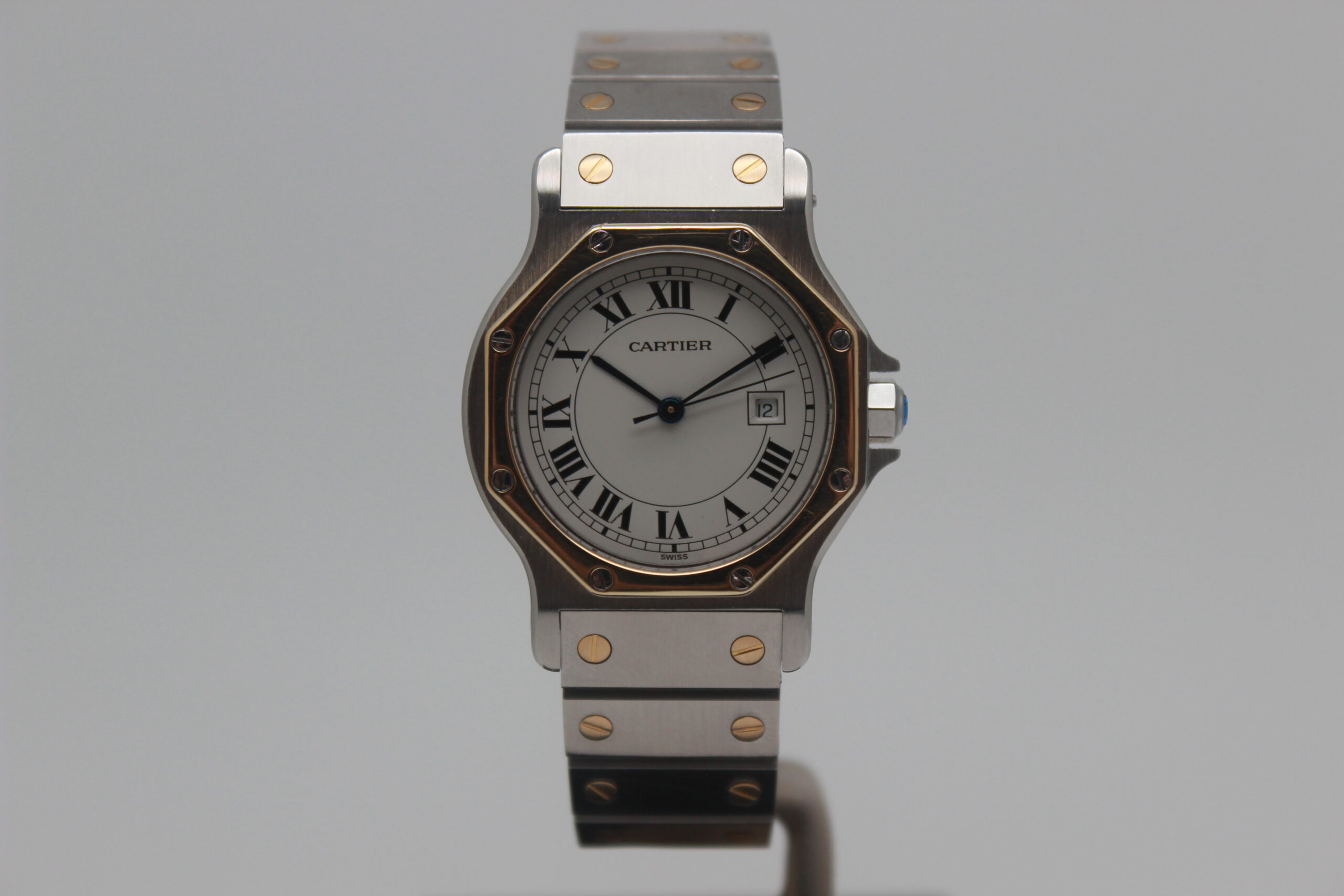 Cartier Santos Octagon 2966, cassa in acciaio e oro da 30 mm, quadrante bianco con numeri romani e data, lunetta in oro giallo, bracciale in acciaio e oro con chiusura déployante.