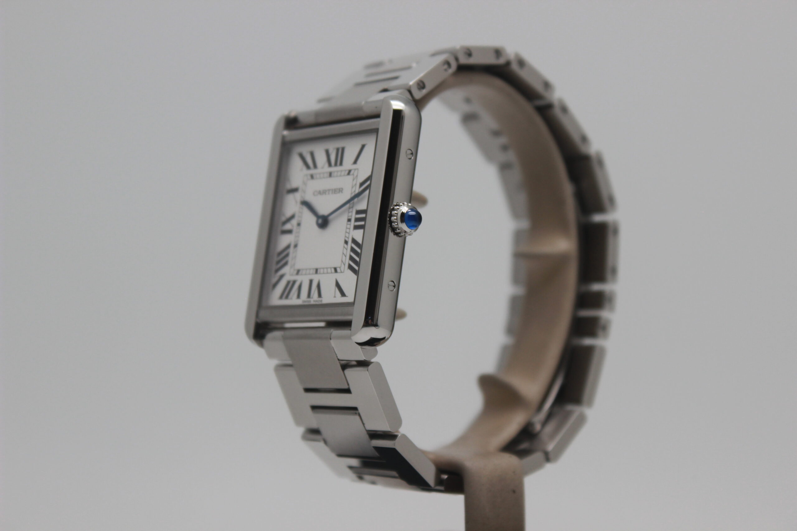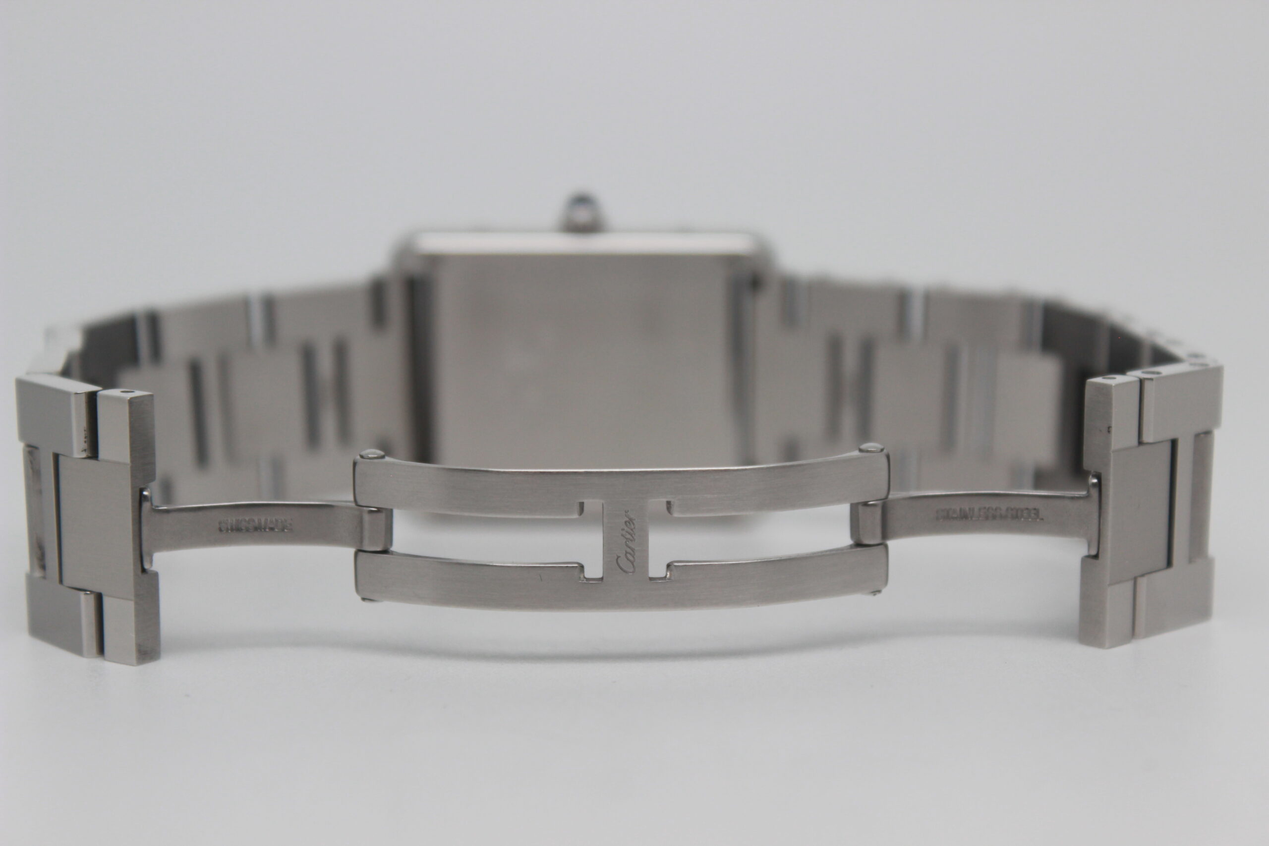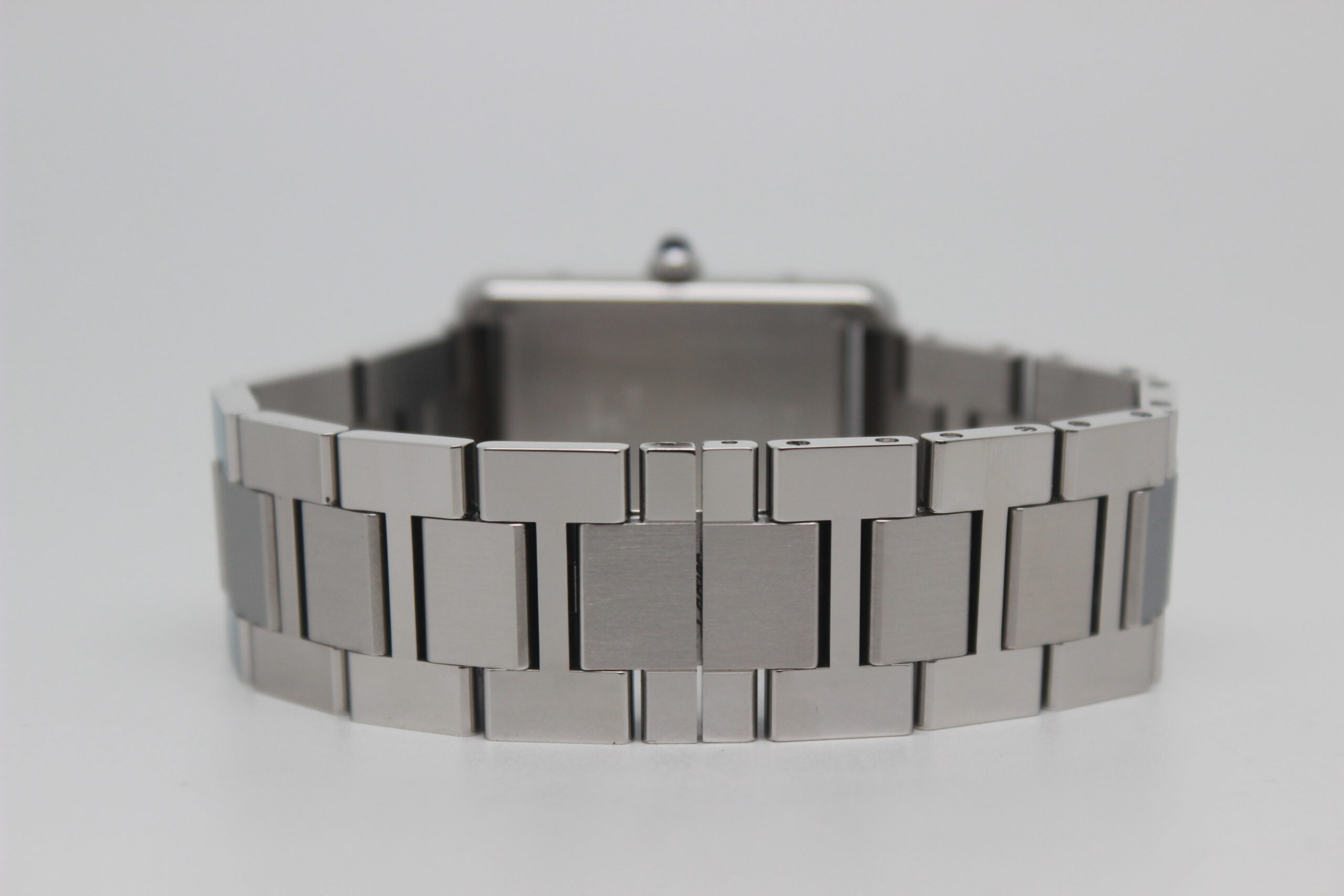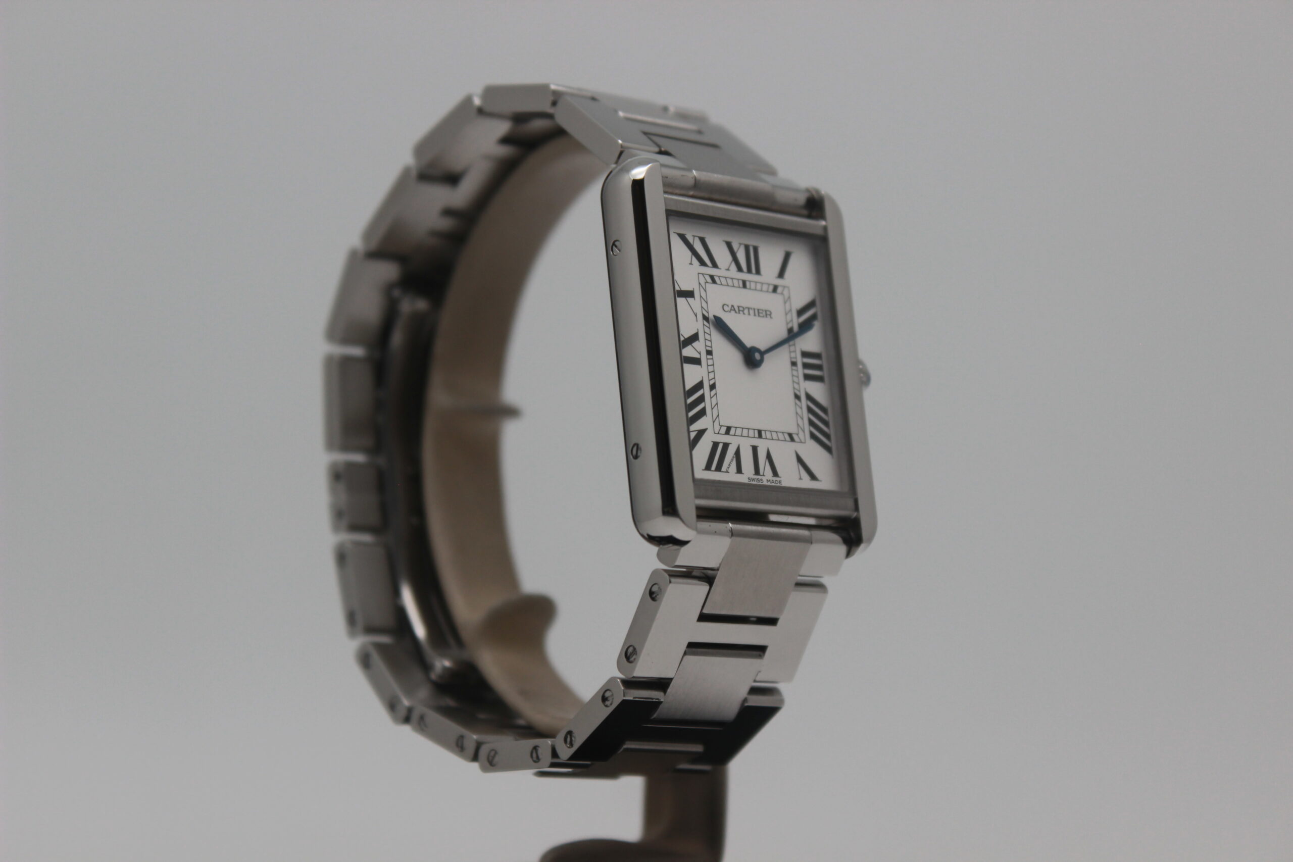 Cartier Tank Solo 3169, cassa in acciaio da 27 x 35 mm, quadrante bianco con numeri romani, bracciale in acciaio lucido e satinato con chiusura déployante in acciaio.