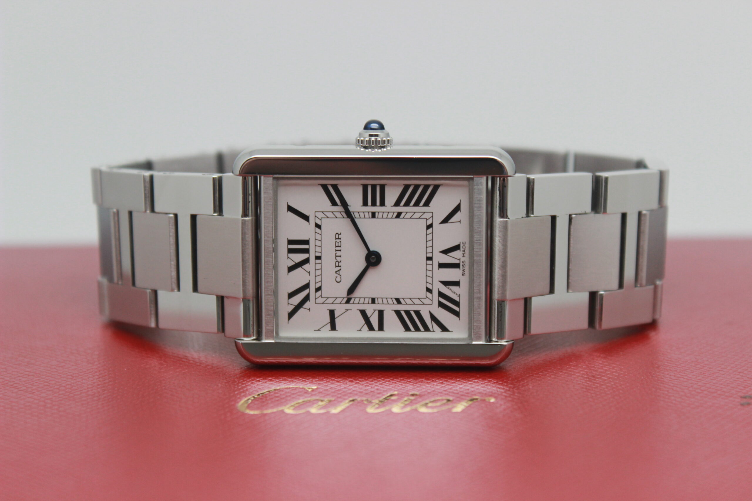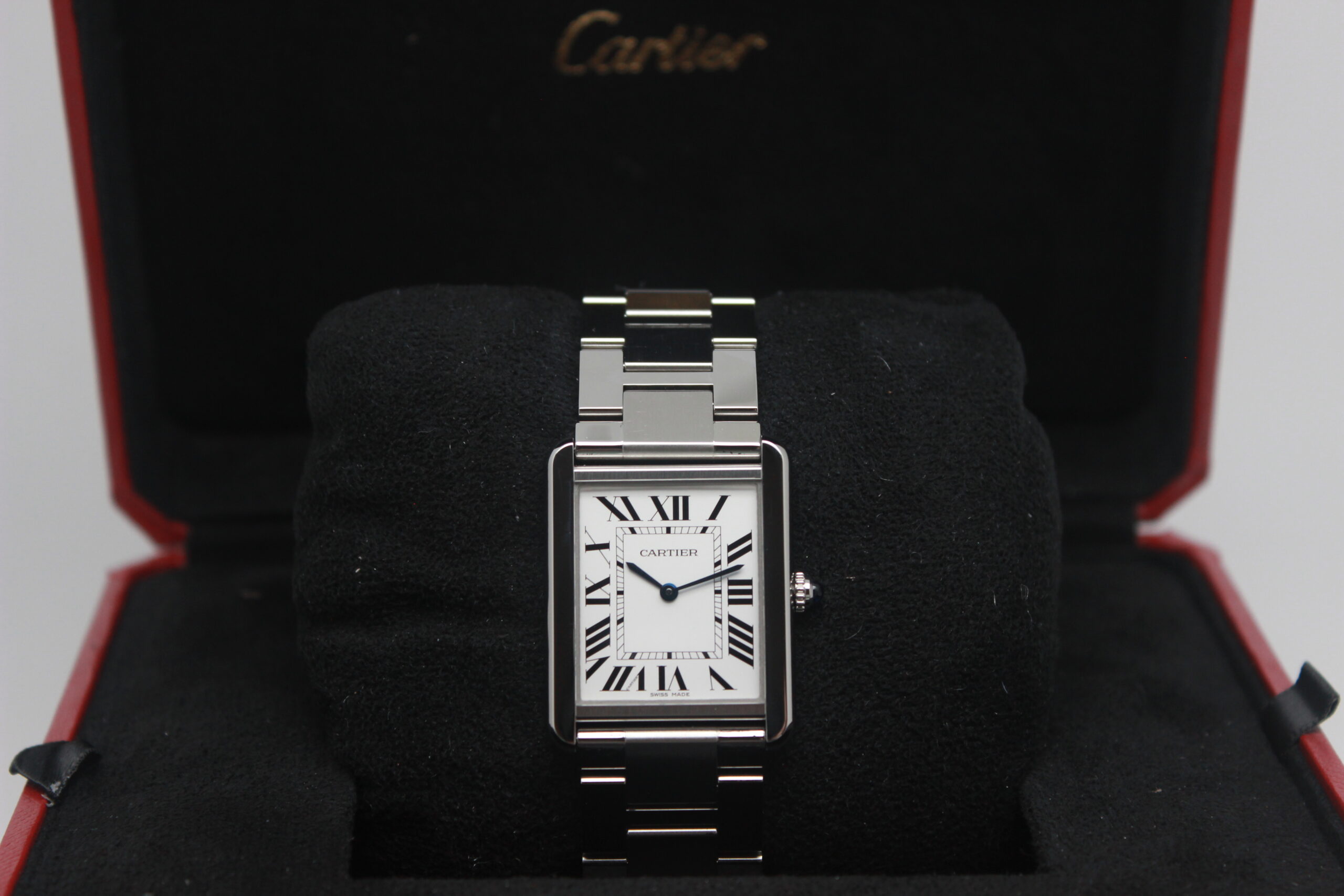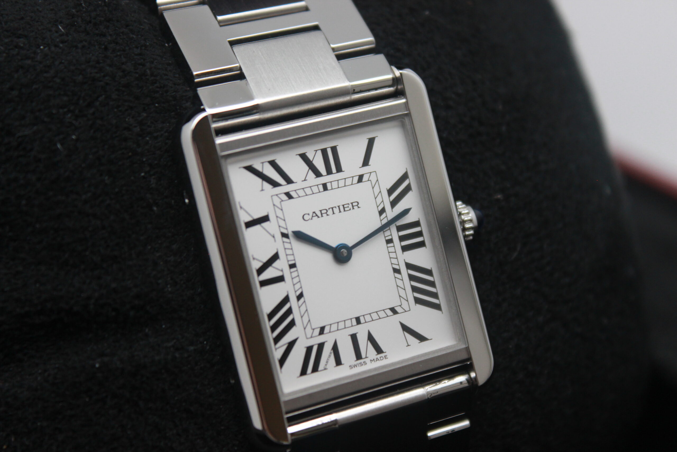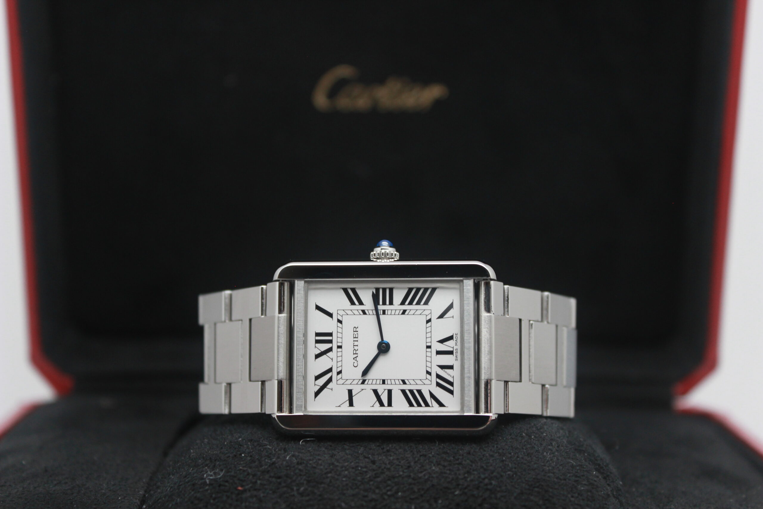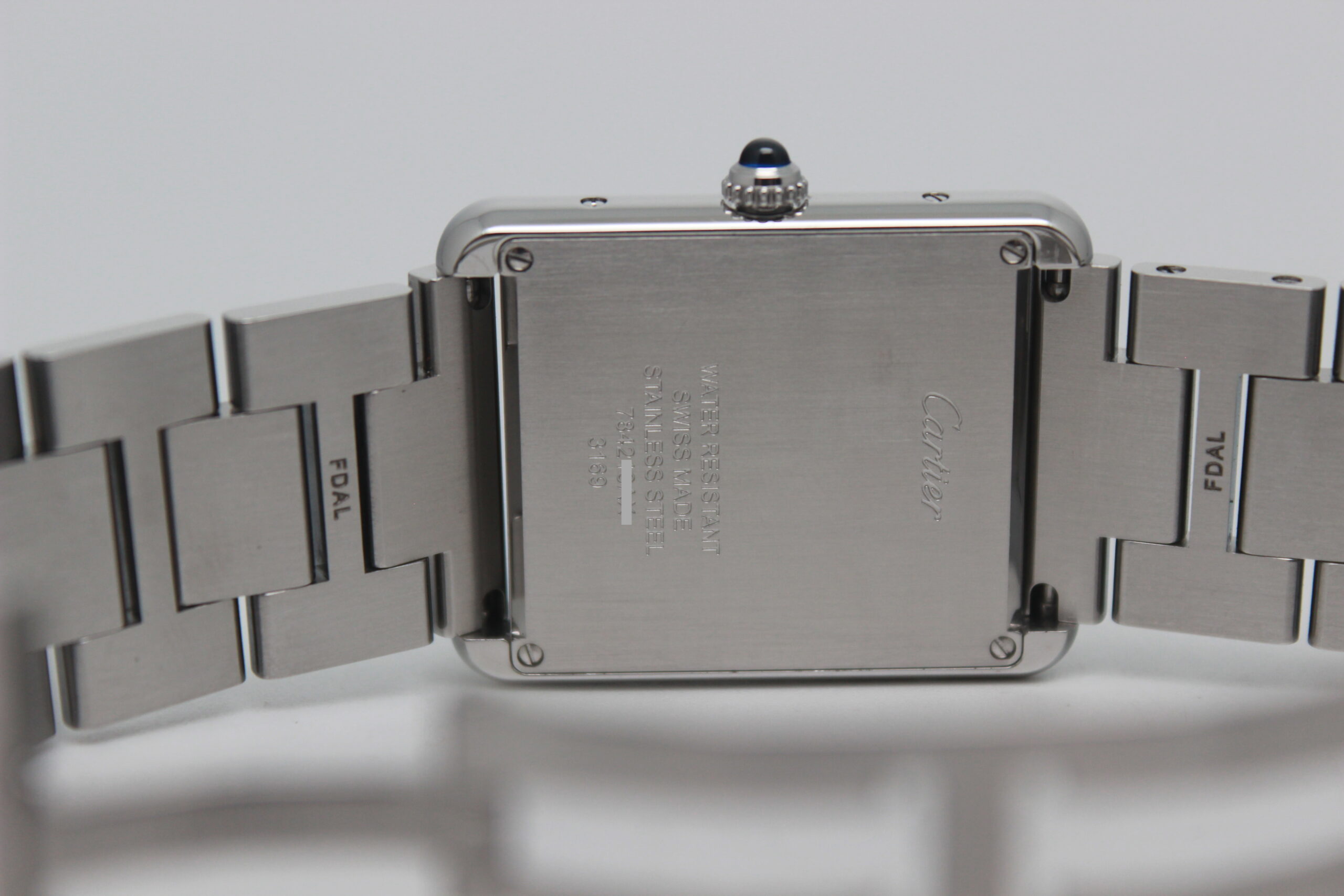 Cartier Tank Solo 3169, cassa in acciaio da 27 x 35 mm, quadrante bianco con numeri romani, bracciale in acciaio lucido e satinato con chiusura déployante in acciaio.