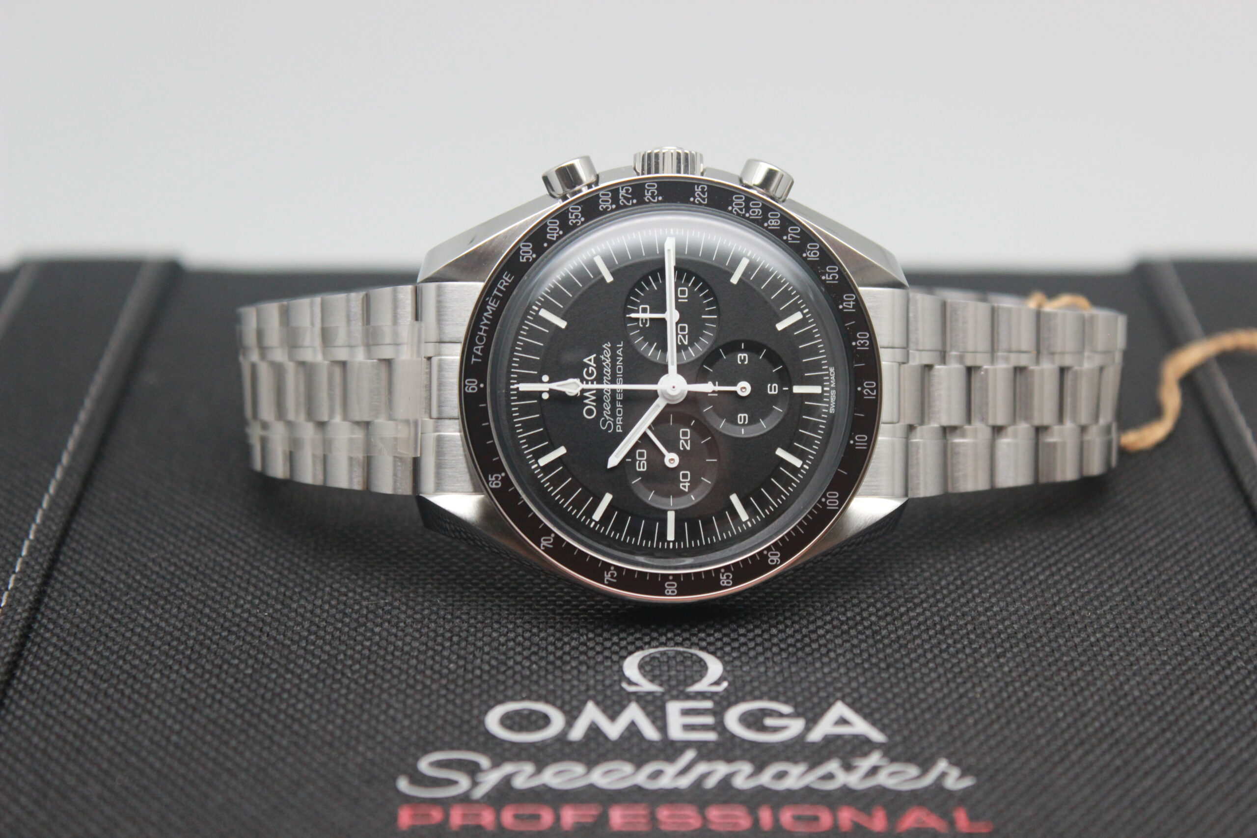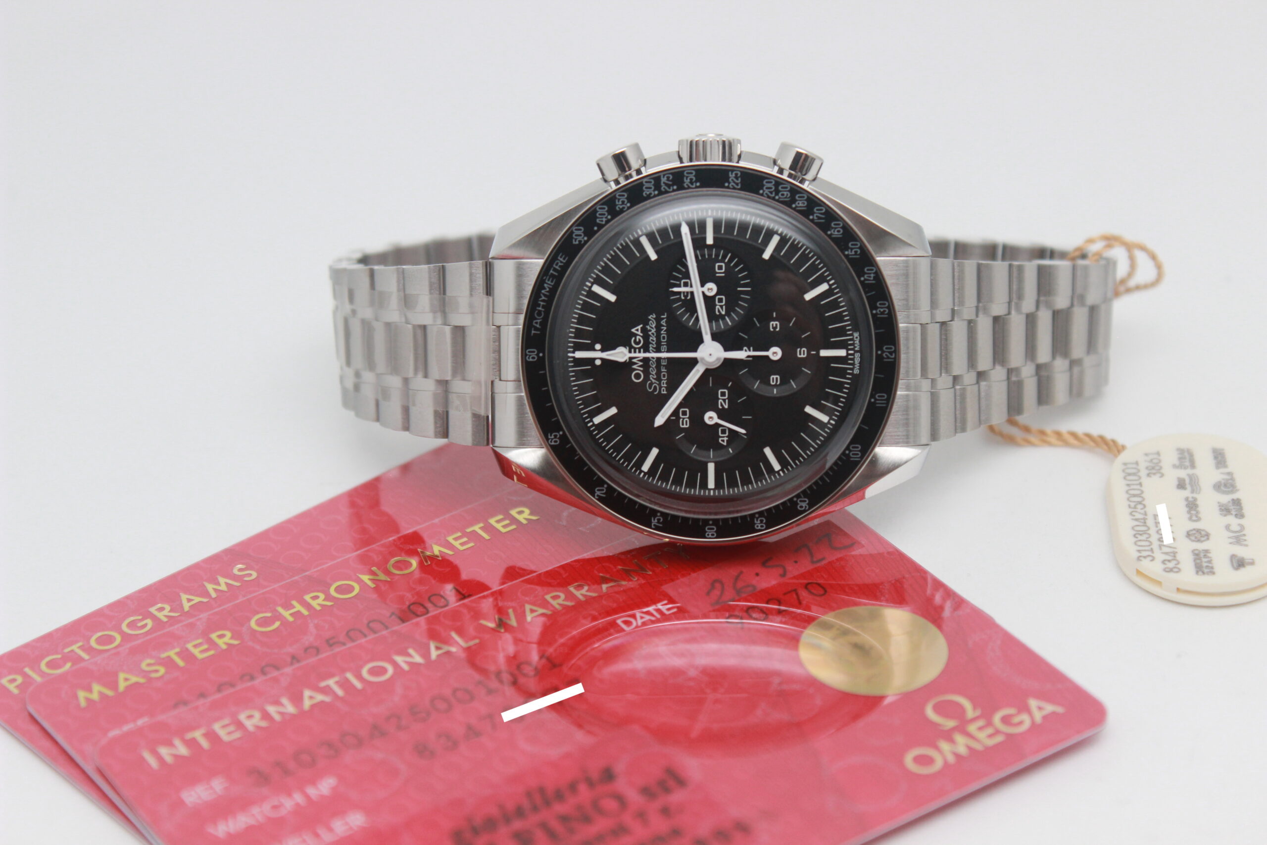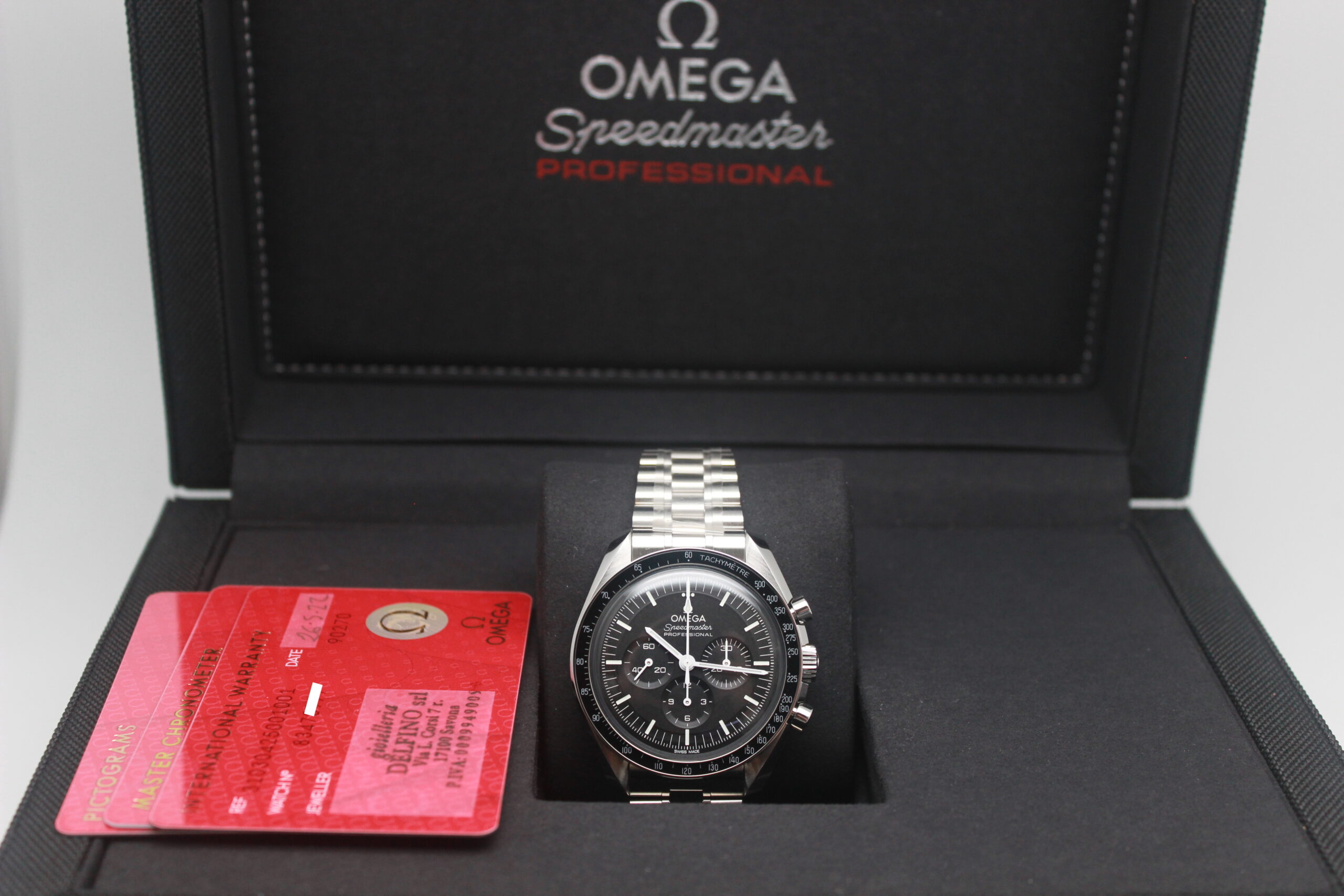 Omega Speedmaster Professional Moonwatch 310.30.42.50.01.001 Full Set 2022, cassa in acciaio da 42 mm, quadrante nero, lunetta in acciaio con inserto in alluminio nero, cinturino in acciaio con chiusura déployante in acciaio. Corredato di scatola e card di garanzia originali Omega.