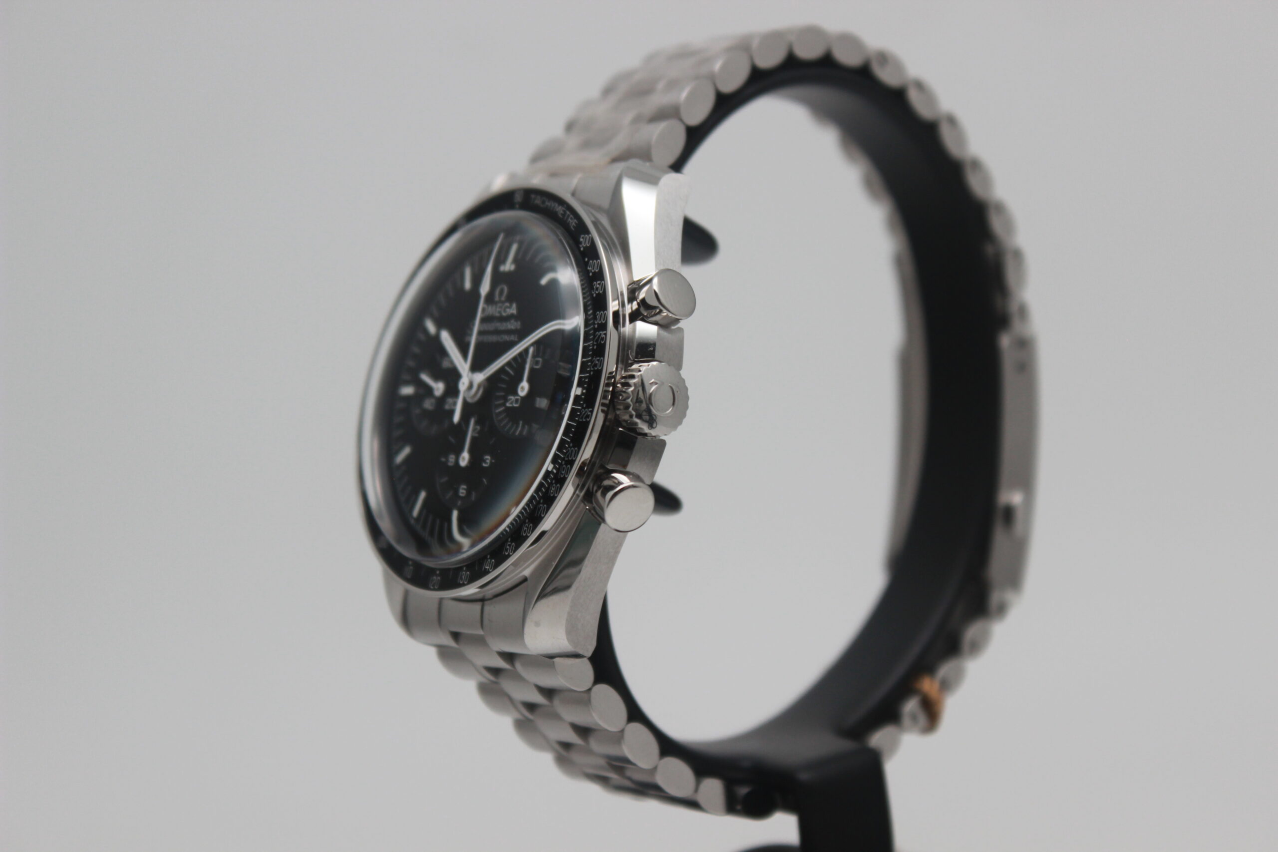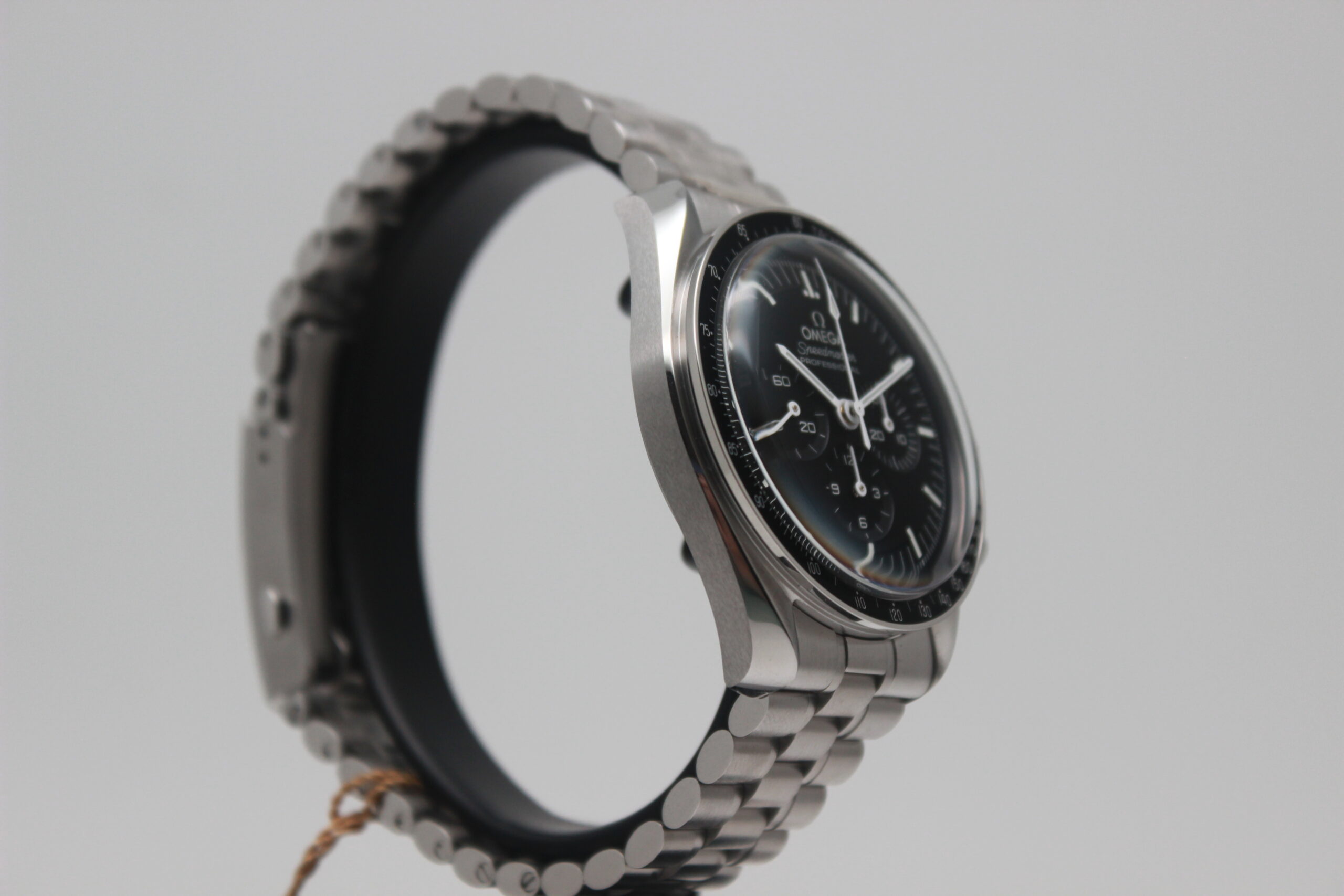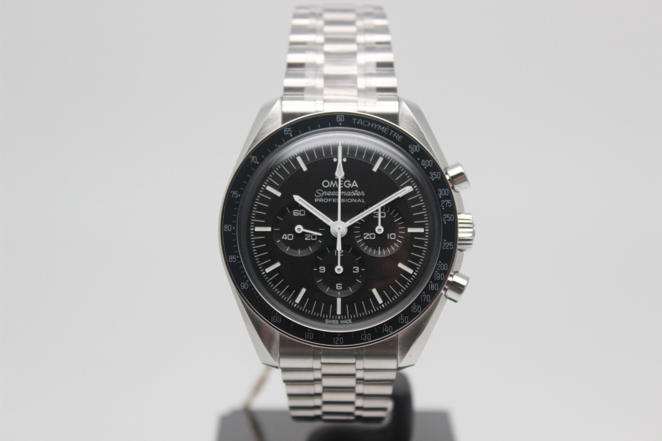 Omega Speedmaster Professional Moonwatch 310.30.42.50.01.001 Full Set 2022, cassa in acciaio da 42 mm, quadrante nero, lunetta in acciaio con inserto in alluminio nero, cinturino in acciaio con chiusura déployante in acciaio. Corredato di scatola e card di garanzia originali Omega.