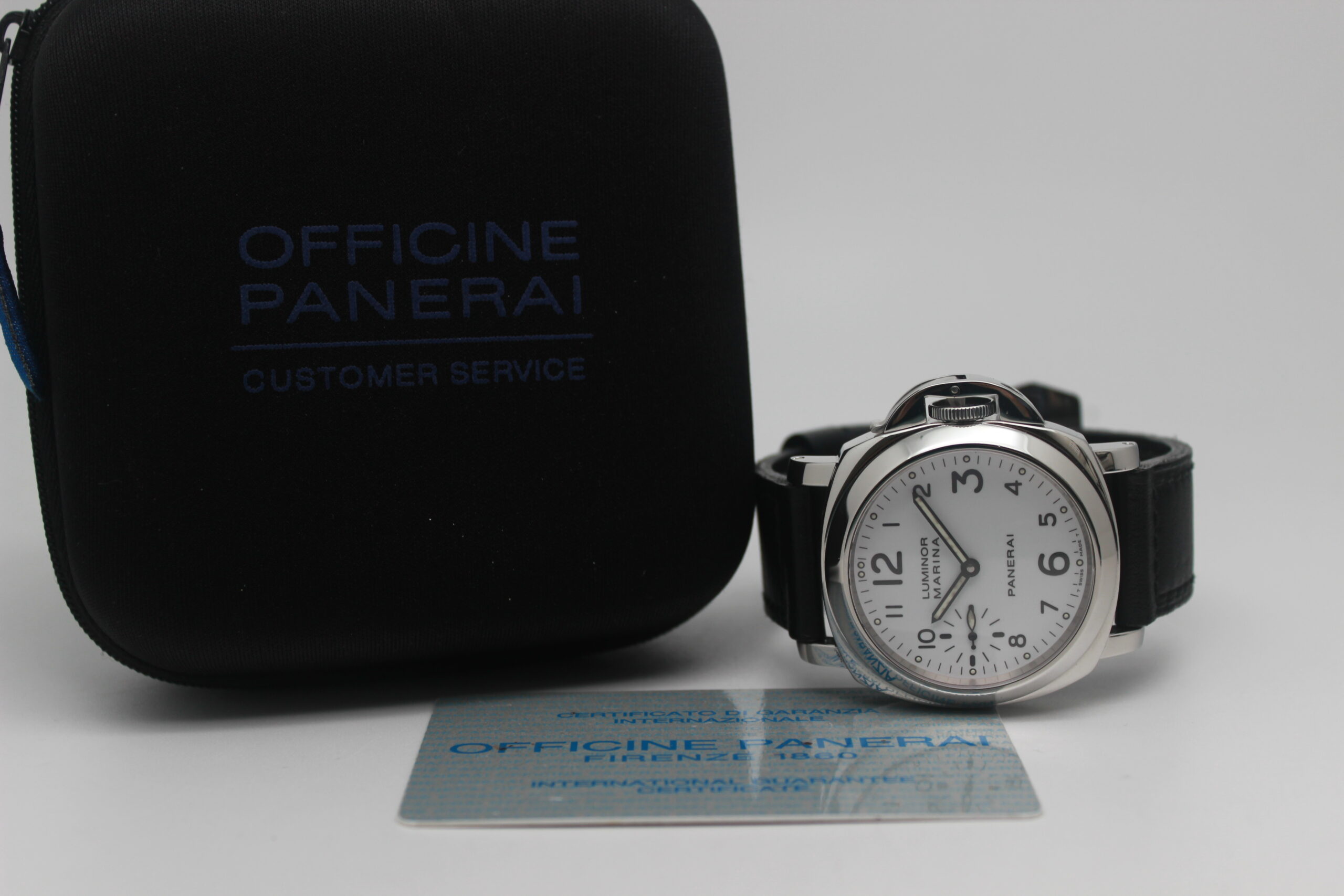 Panerai Luminor Marina OP6502 “Pre-A Series”, cassa in acciaio da 44mm, quadrante bianco, lunetta in acciaio, cinturino nero in pelle con chiusura ad ardiglione in acciaio.