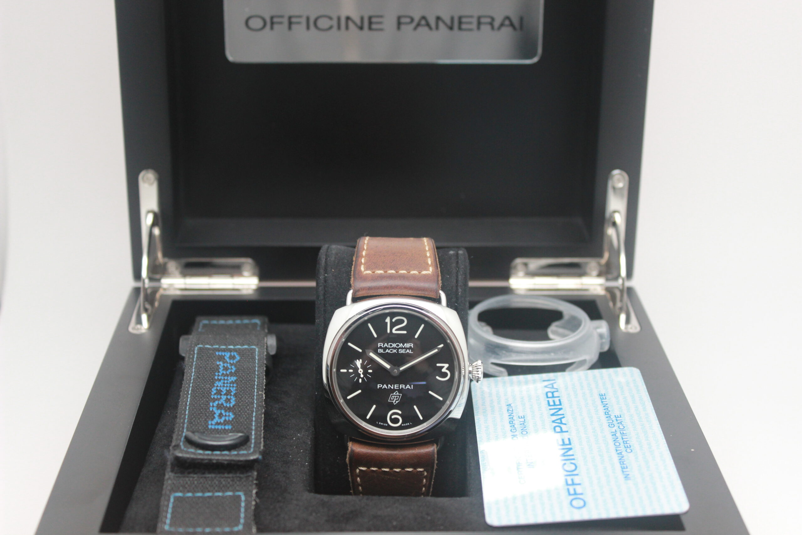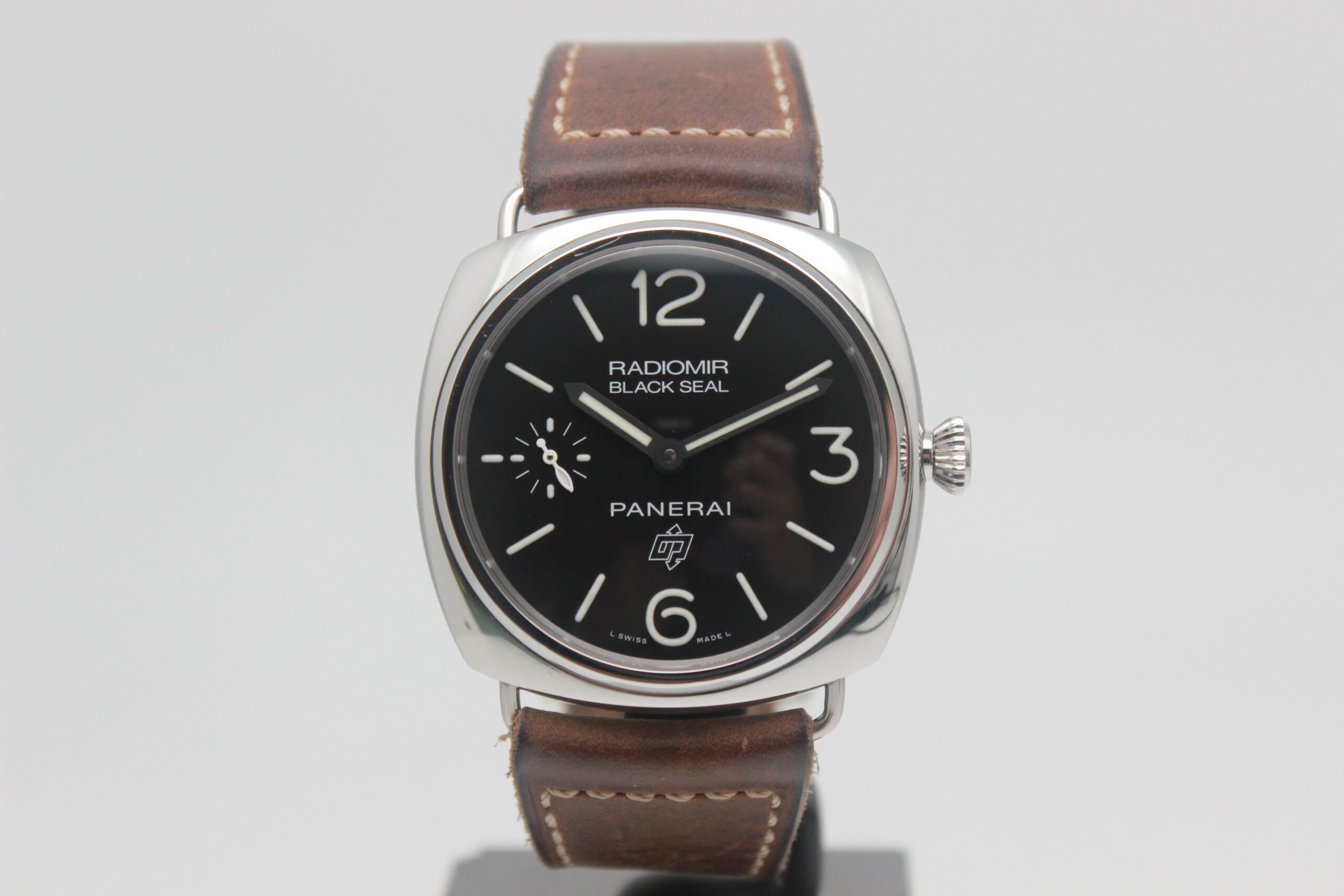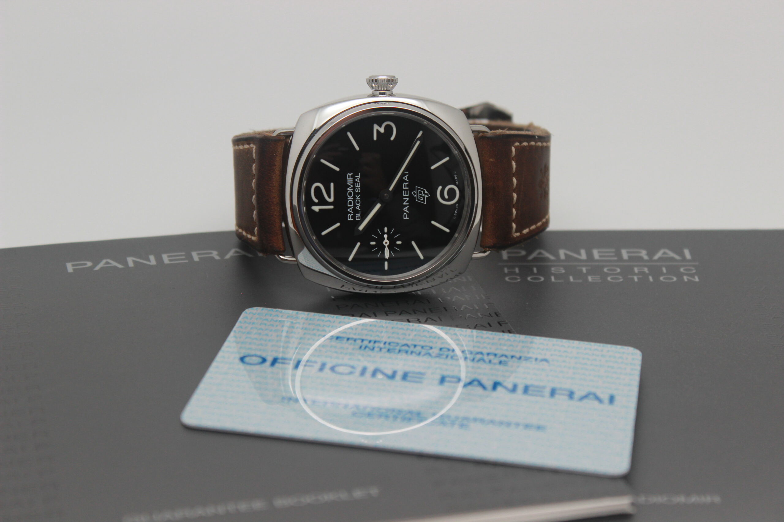 Panerai Radiomir Black Seal PAM00380 Full Set 2012, cassa in acciaio da 45 mm, quadrante nero, lunetta in acciaio, cinturino marrone in pelle con chiusura ad ardiglione in acciaio. Corredato di scatola e card di garanzia originali Panerai.