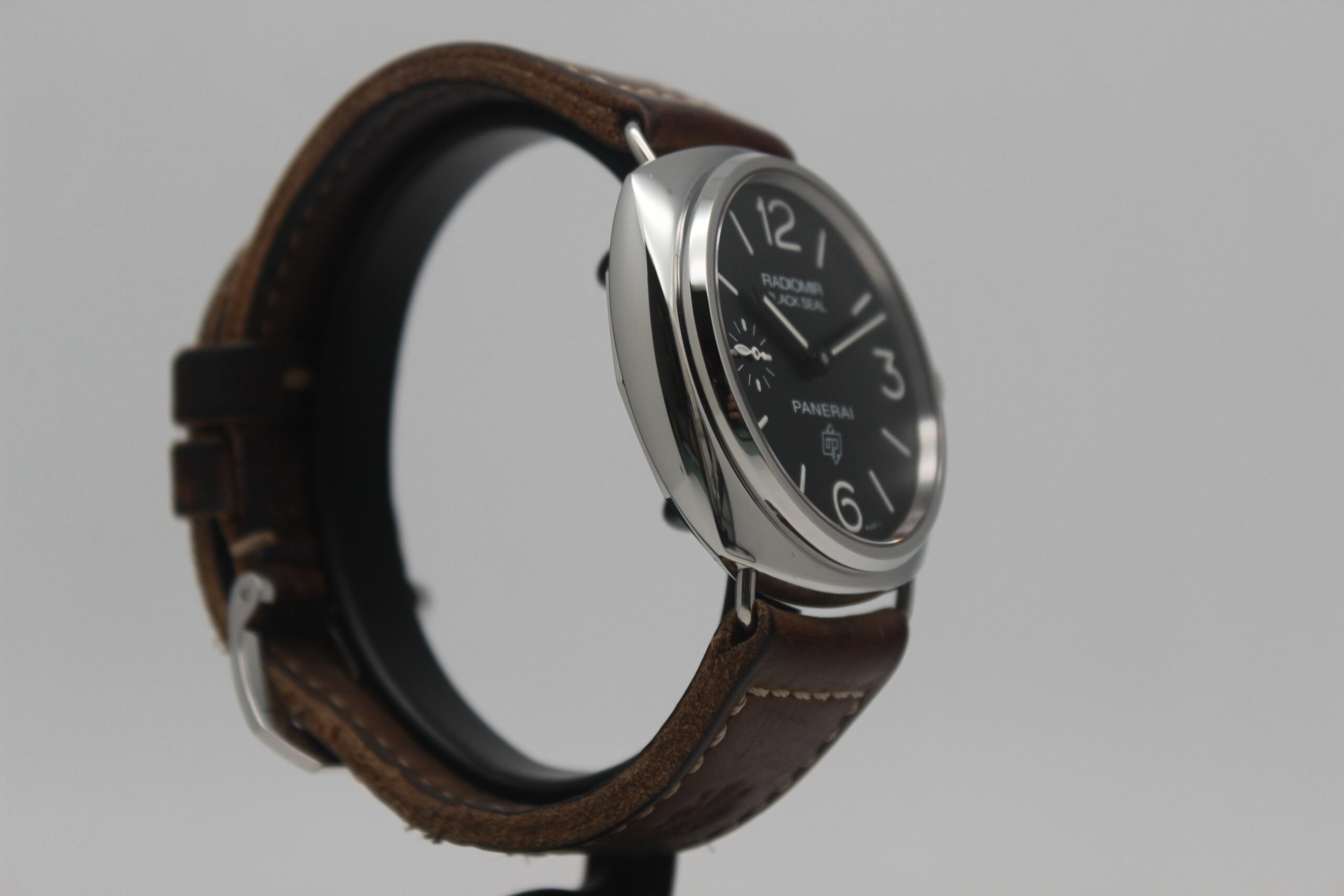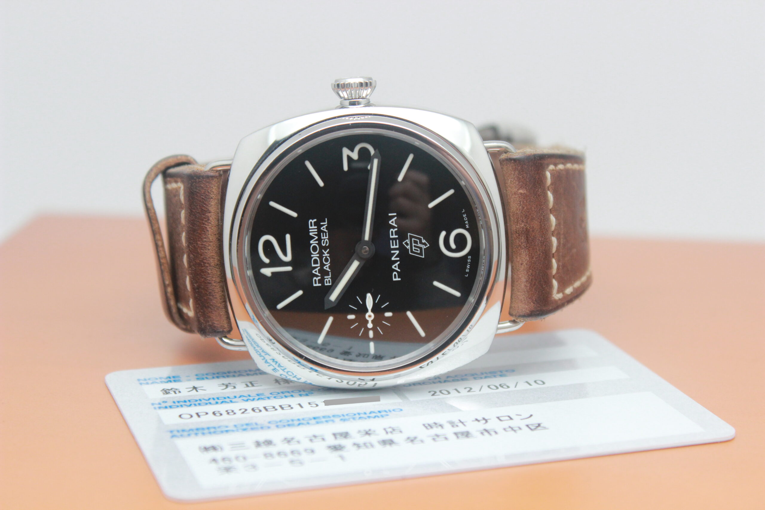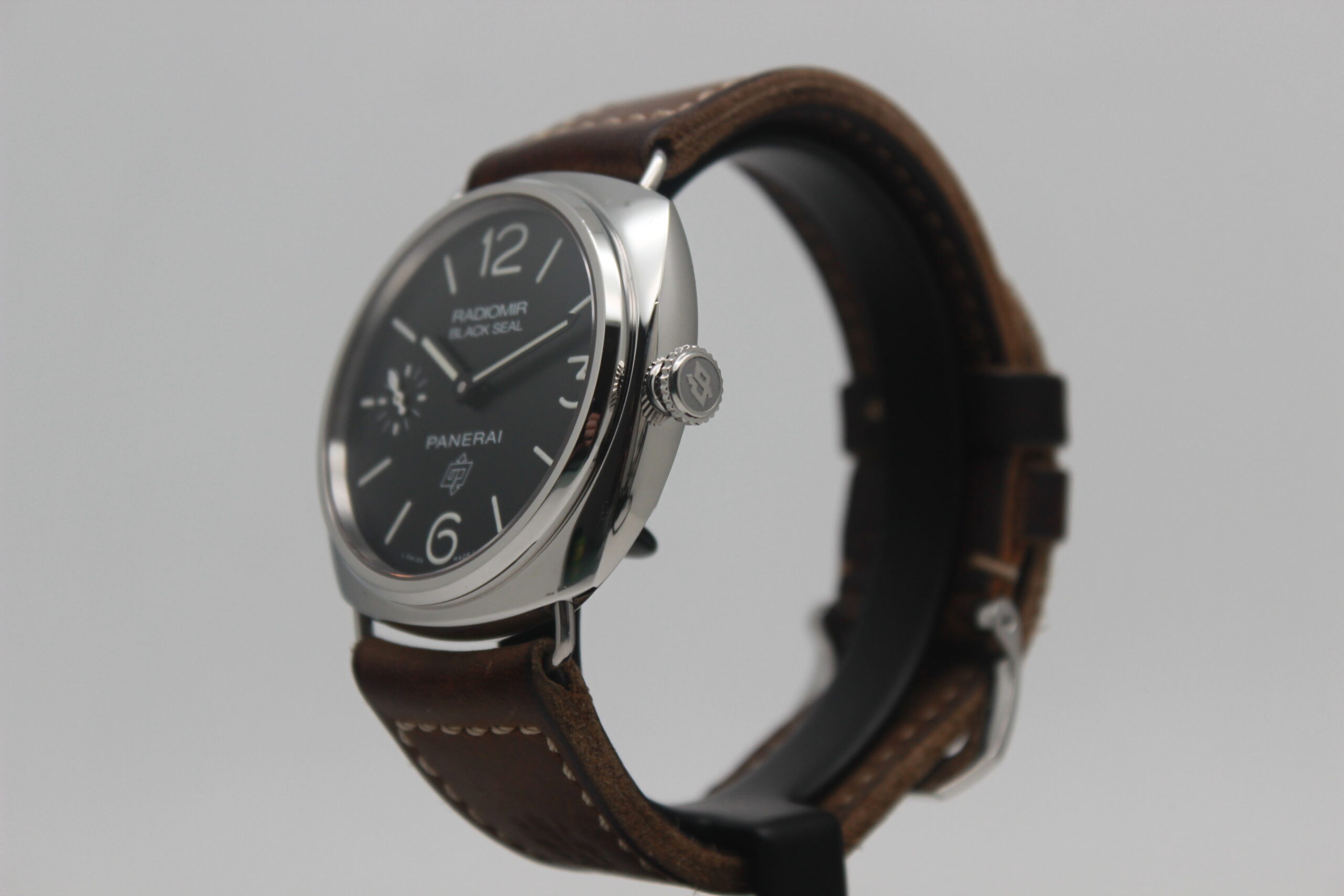 Panerai Radiomir Black Seal PAM00380 Full Set 2012, cassa in acciaio da 45 mm, quadrante nero, lunetta in acciaio, cinturino marrone in pelle con chiusura ad ardiglione in acciaio. Corredato di scatola e card di garanzia originali Panerai.