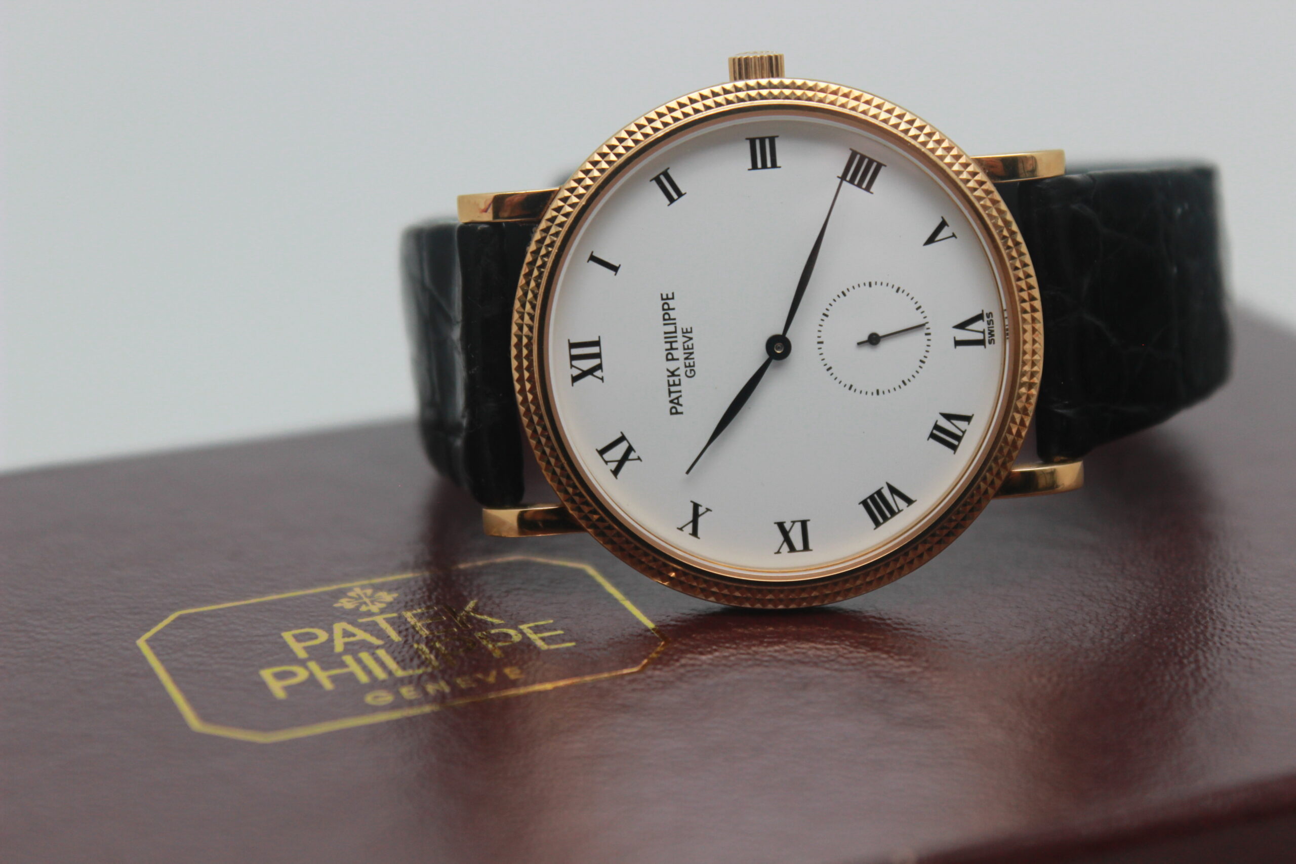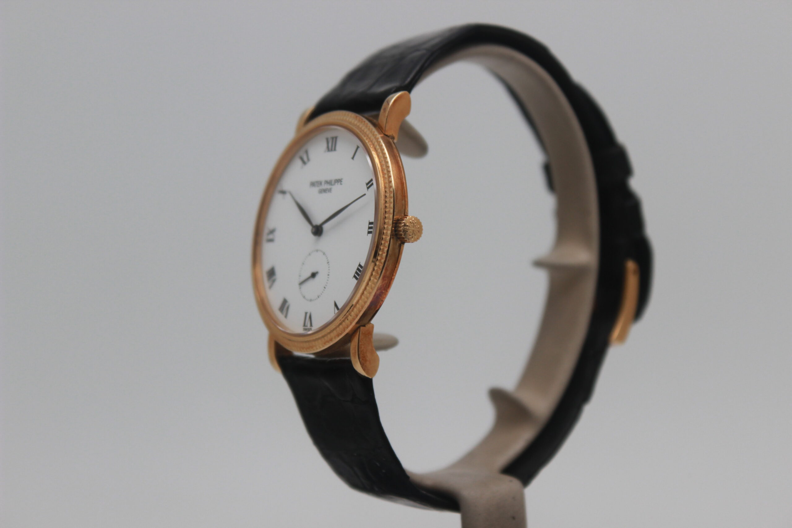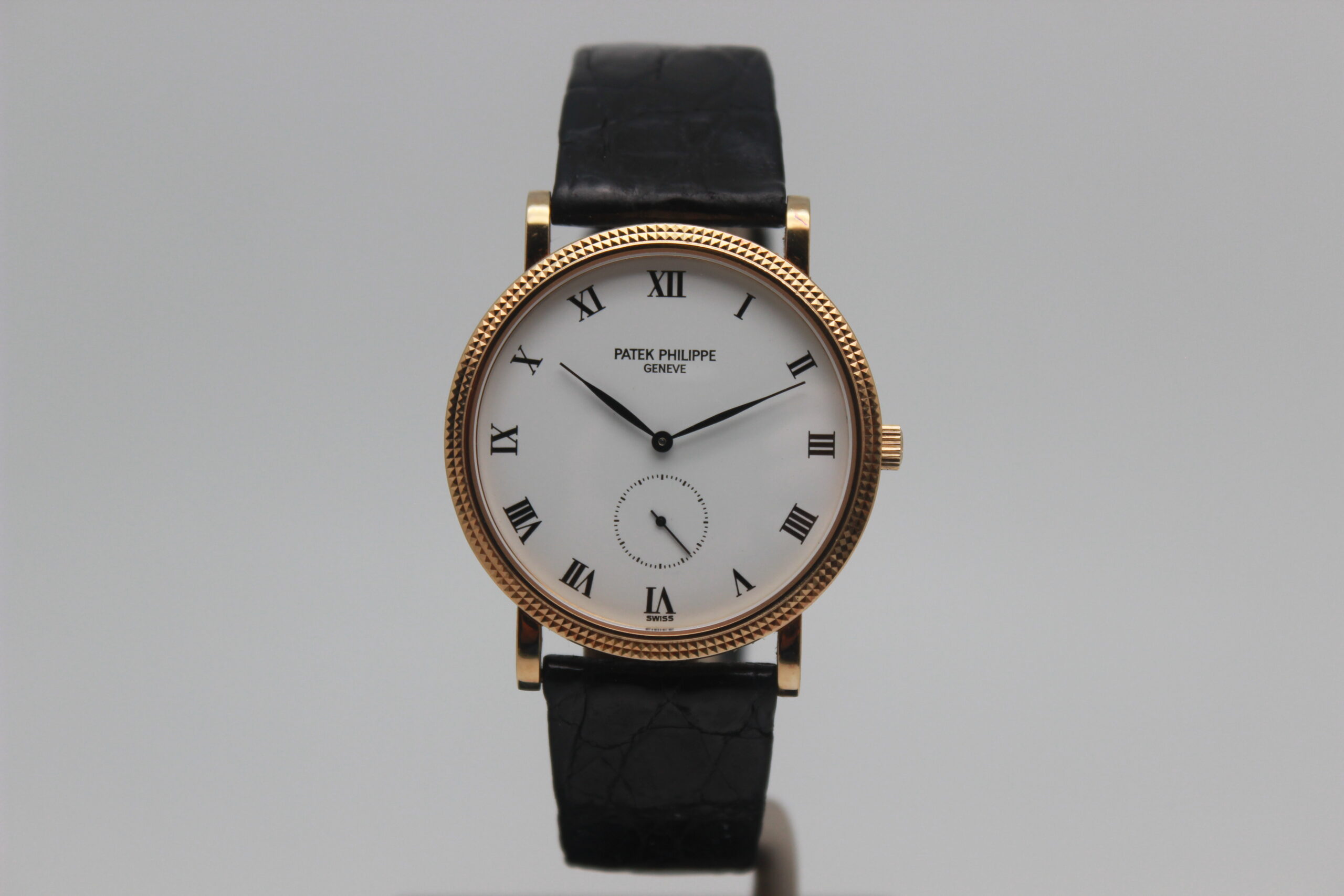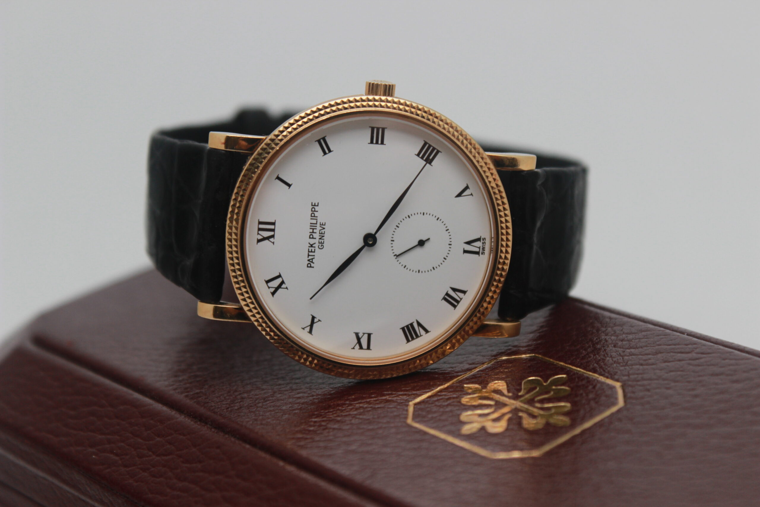 Patek Philippe Calatrava 3919 Full Set, cassa in oro giallo da 33 mm, quadrante bianco con numeri romani, cinturino nero in pelle con chiusura ad ardiglione in oro giallo. Corredato di scatola e garanzia originali Patek Philippe.