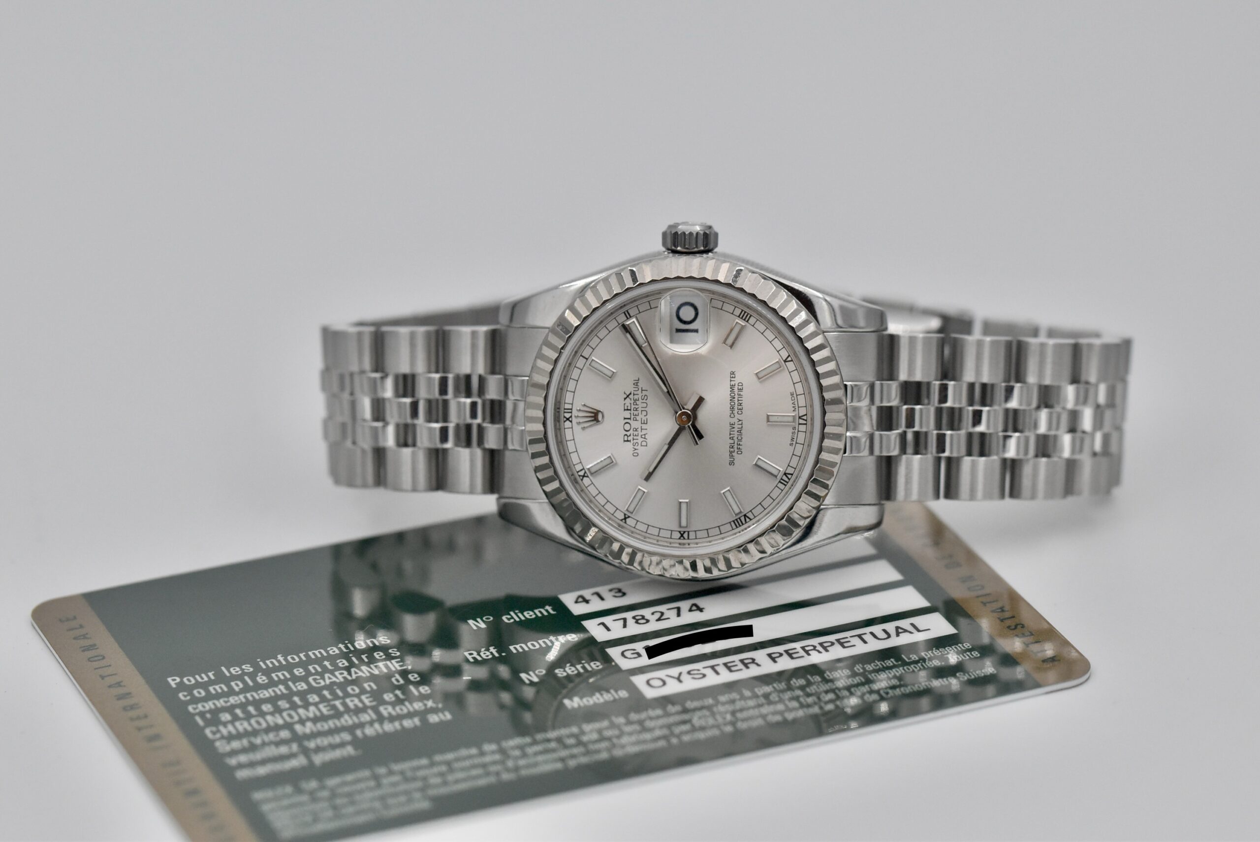 Rolex Datejust 31, referenza 178274, seriale Gxxxxxx, anno 2011, completo di scatola originale e card di garanzia Rolex.