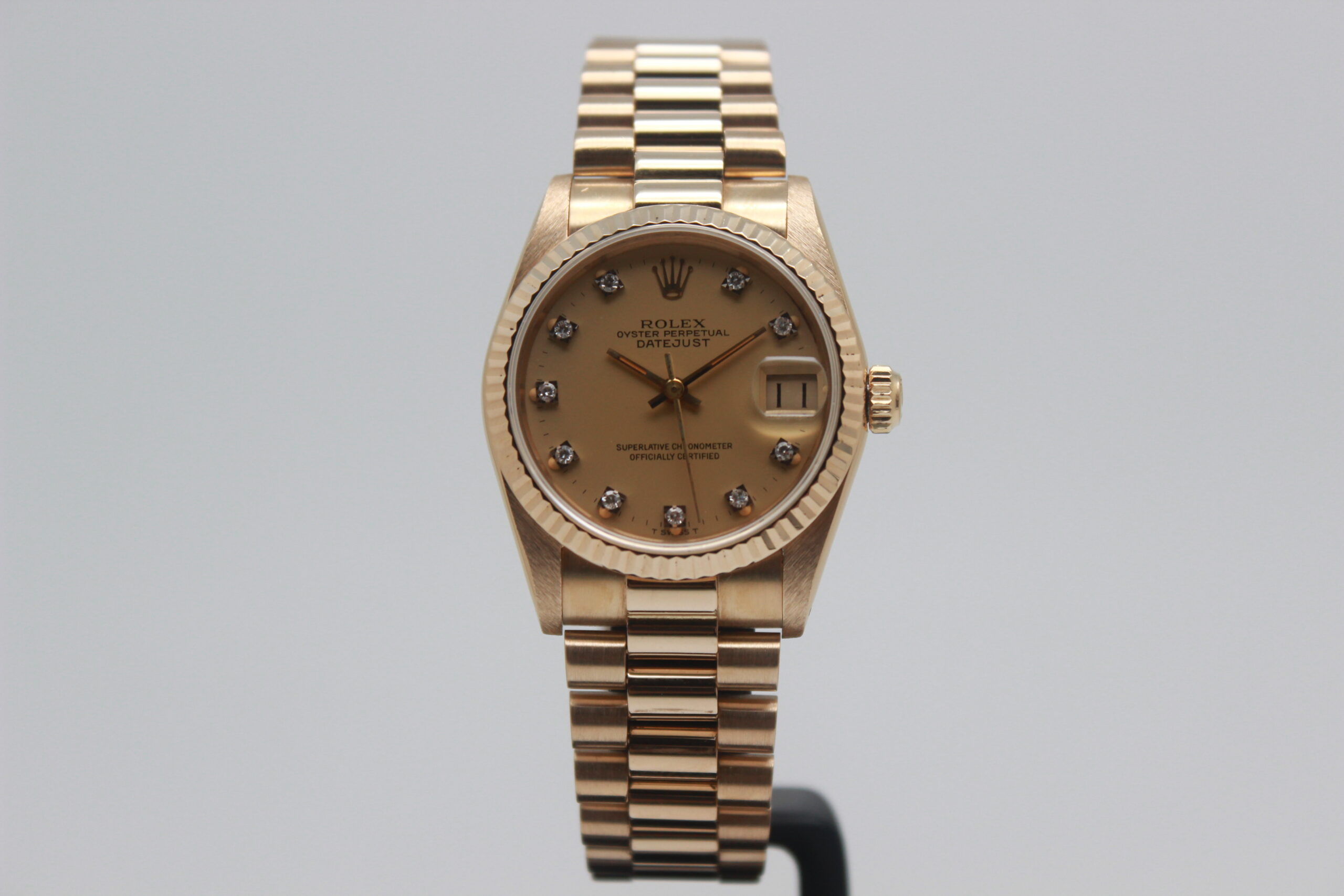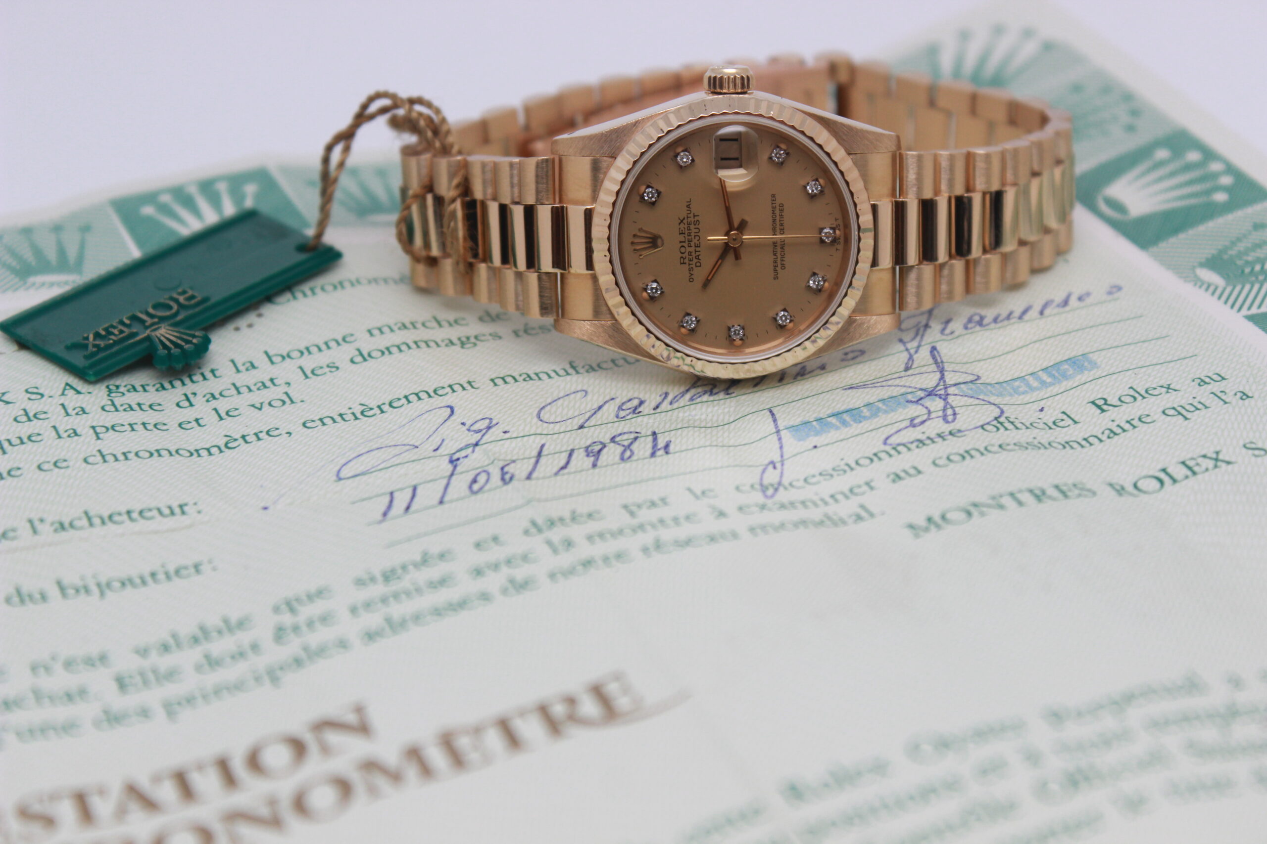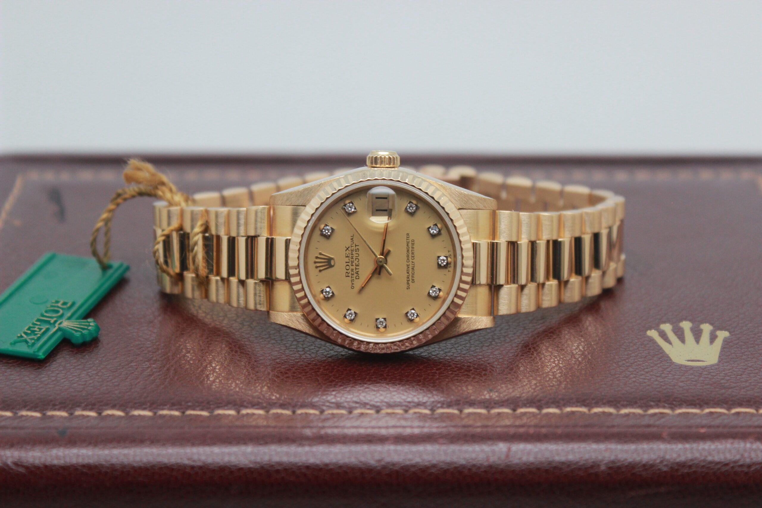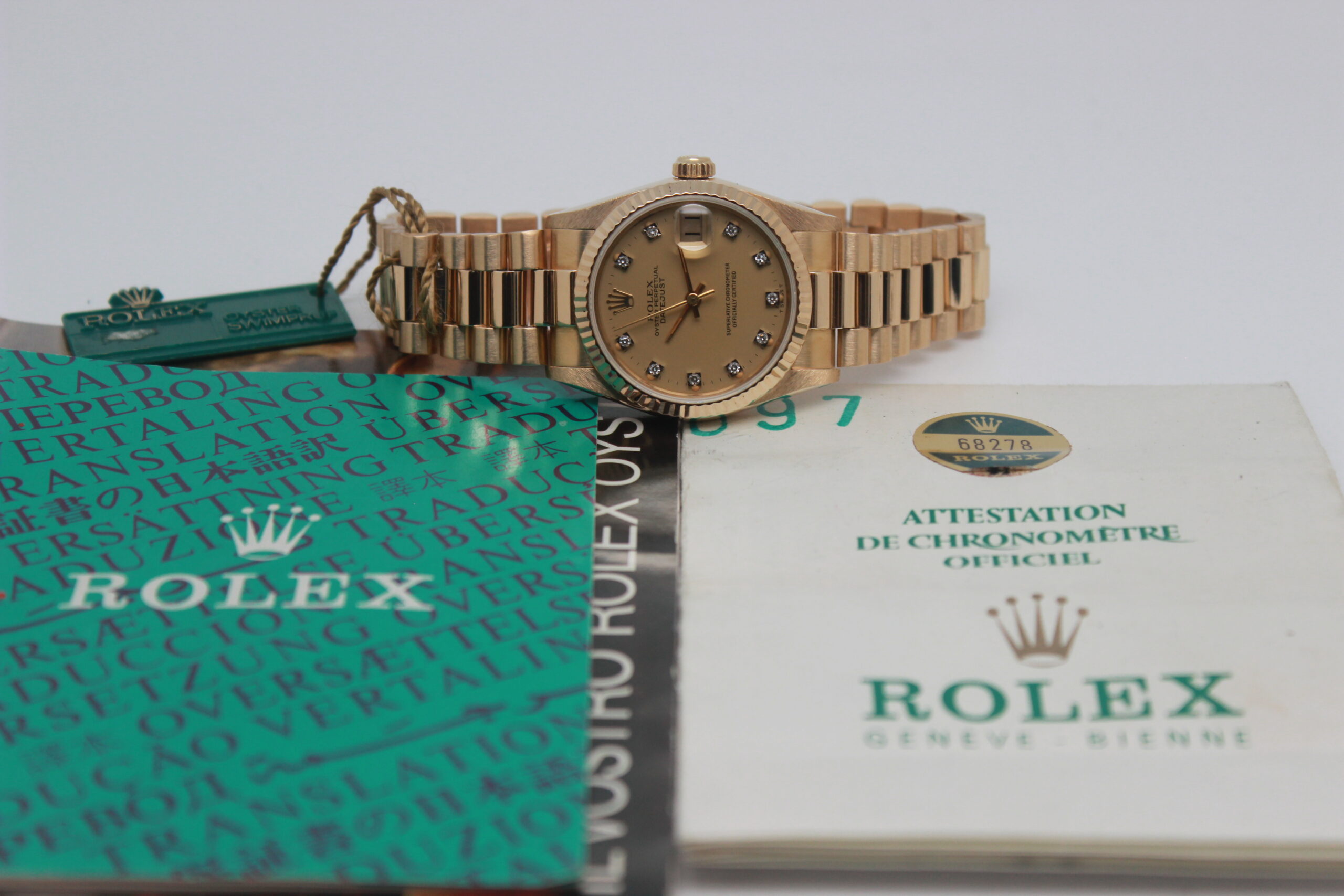 Rolex Datejust 31 68278 “Champagne Dial” Full Set 1984, cassa in oro giallo da 31 mm, quadrante champagne con diamanti e data, lunetta zigrinata in oro giallo, bracciale President in oro giallo lucido e satinato con chiusura a scomparsa. Corredato di scatola e garanzia originali Rolex.
