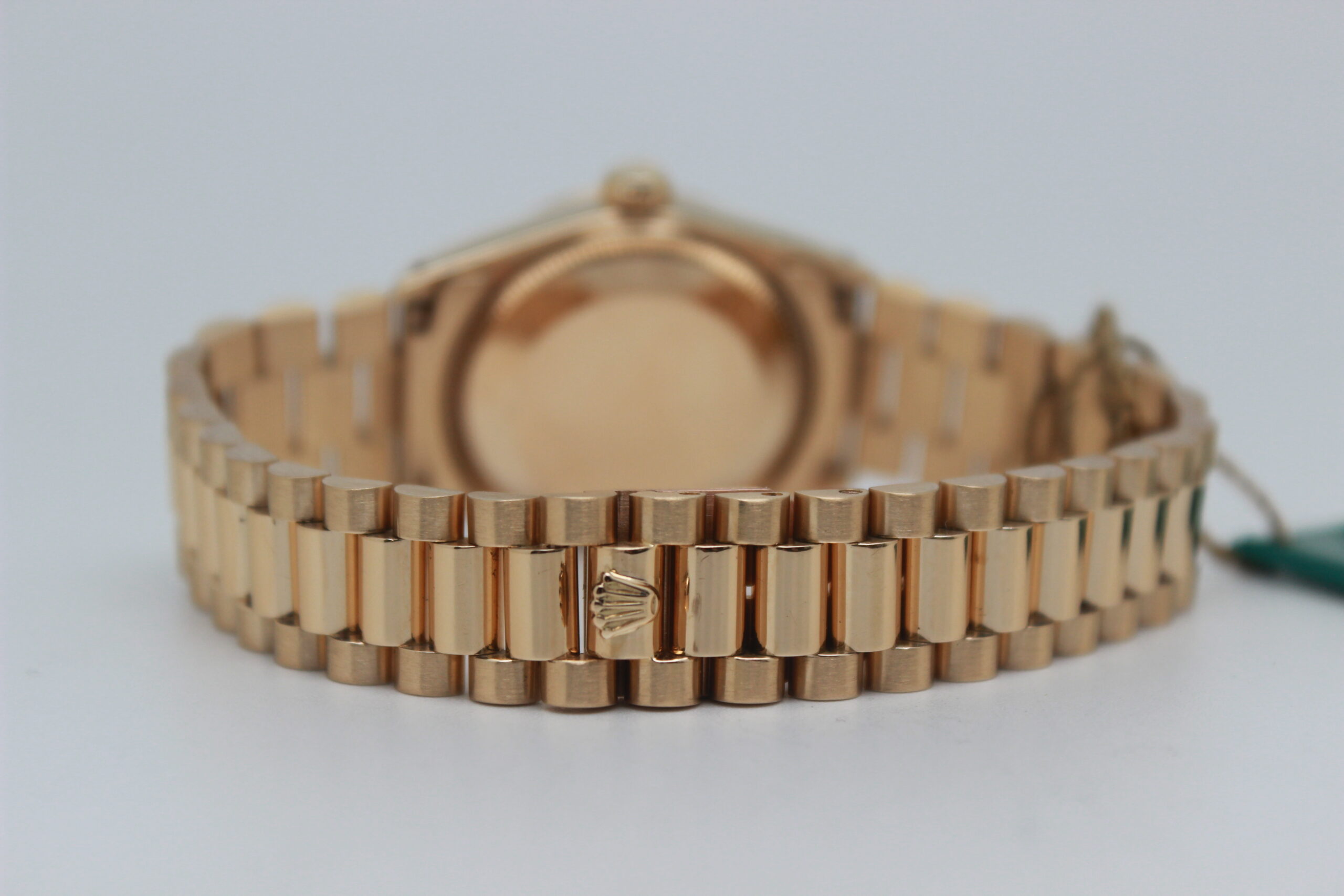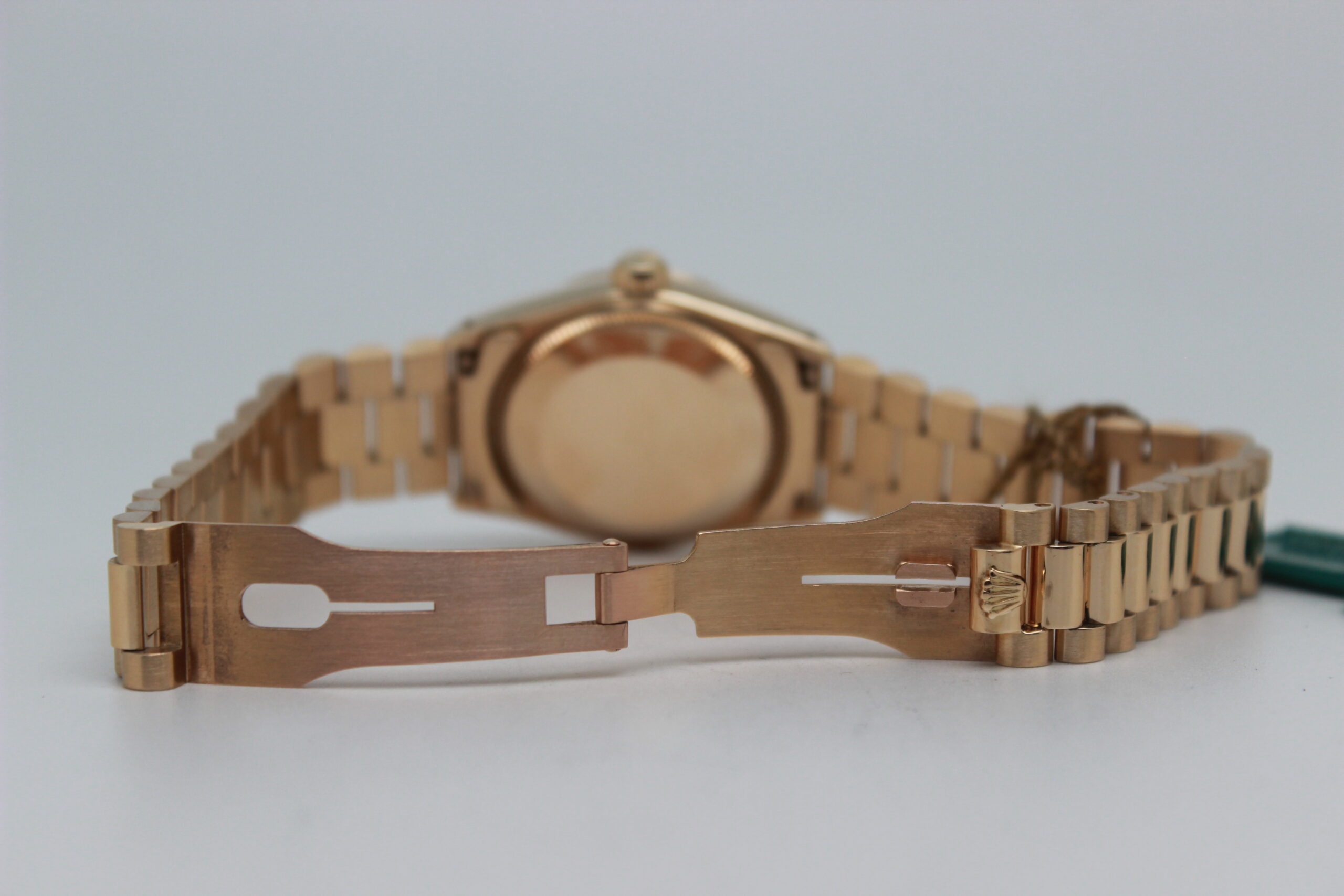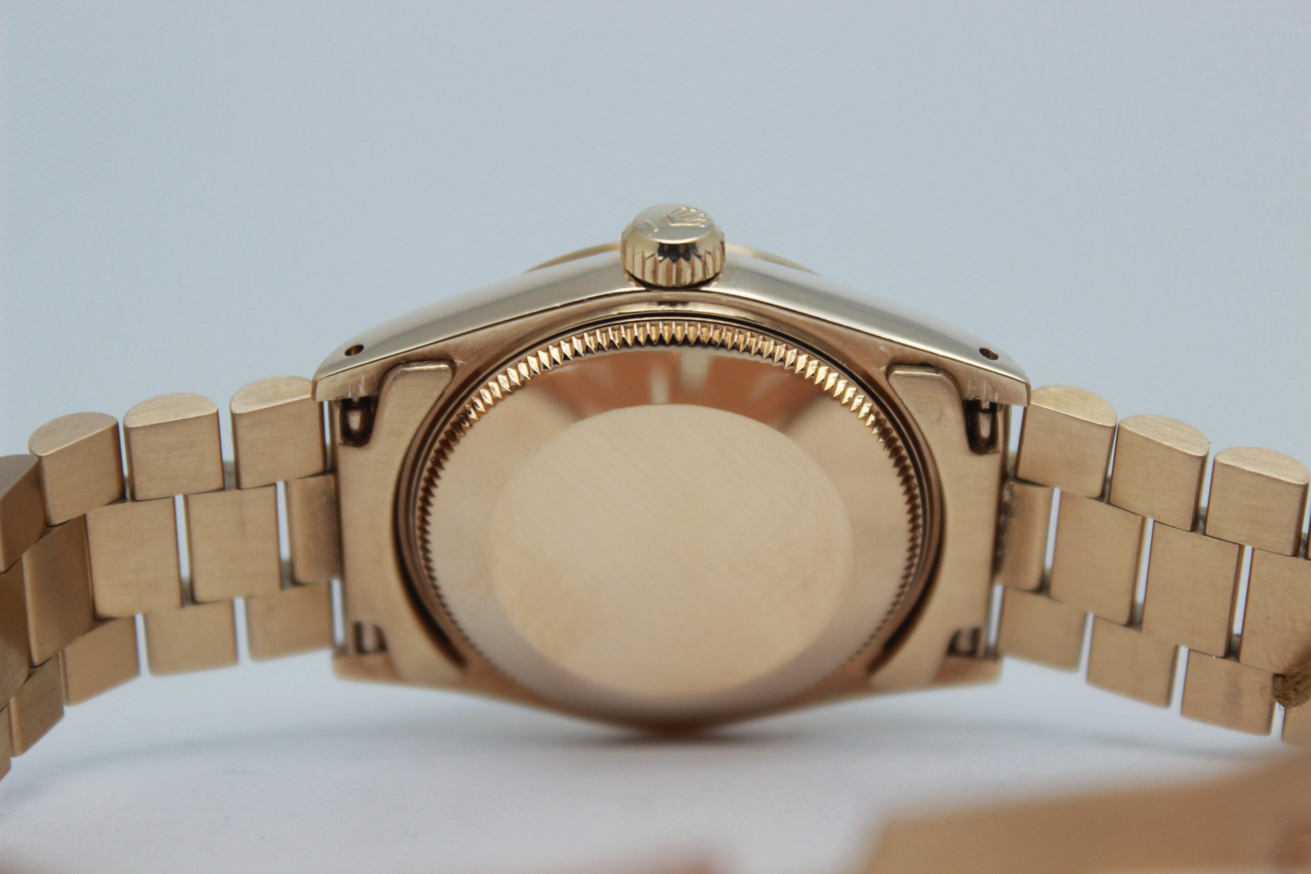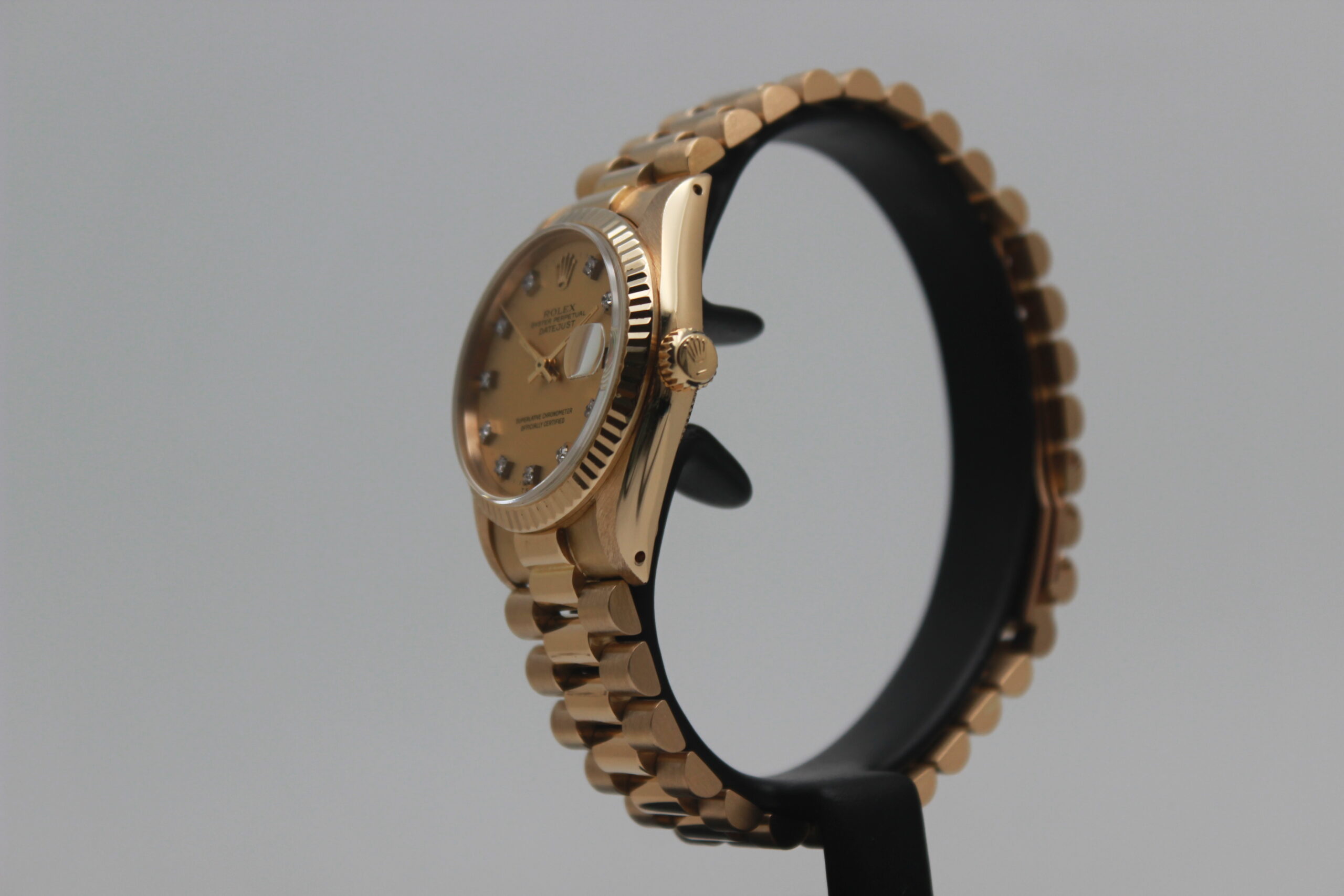 Rolex Datejust 31 68278 “Champagne Dial” Full Set 1984, cassa in oro giallo da 31 mm, quadrante champagne con diamanti e data, lunetta zigrinata in oro giallo, bracciale President in oro giallo lucido e satinato con chiusura a scomparsa. Corredato di scatola e garanzia originali Rolex.