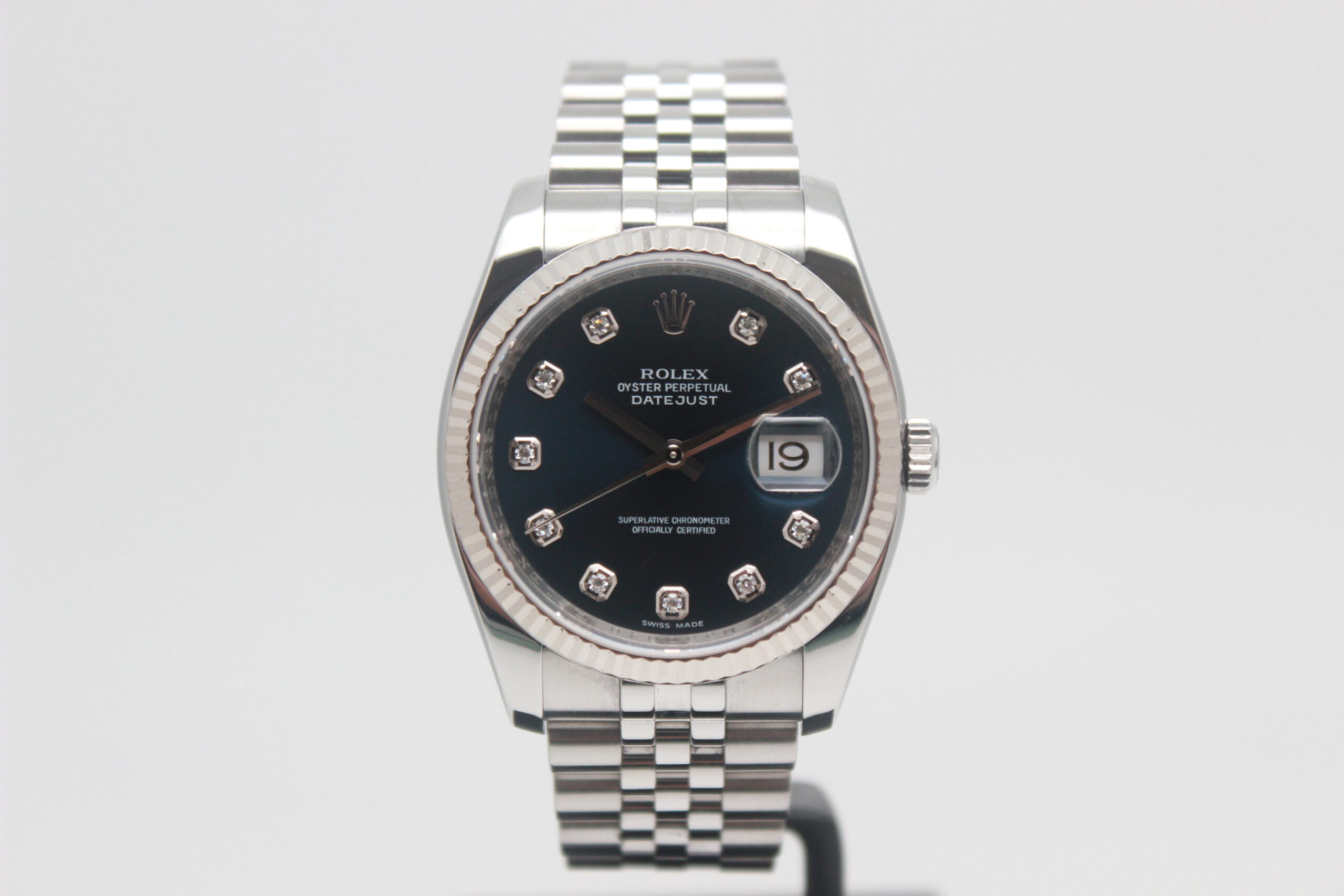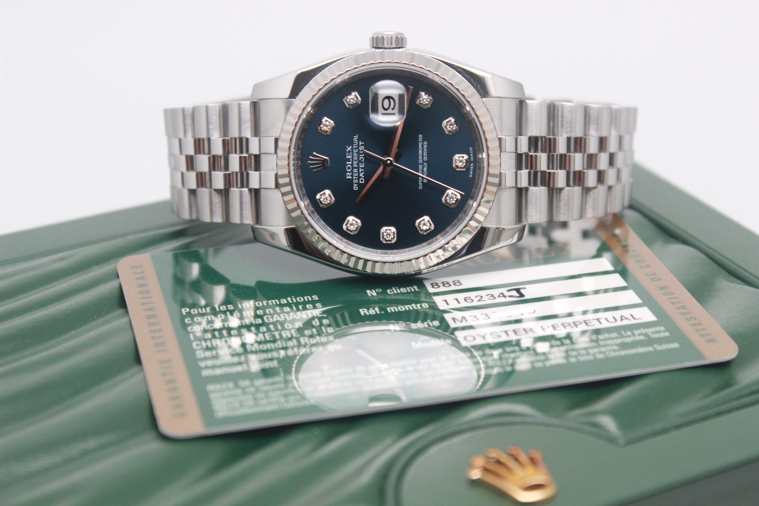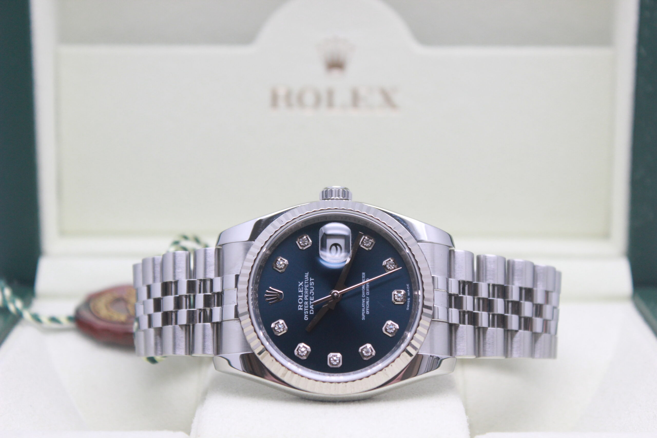 Rolex Datejust 36 “Blue Dial” 116234 Full Set 2010, cassa in acciaio da 36 mm, quadrante blu con diamanti e data, lunetta zigrinata in oro bianco, bracciale Jubilee in acciaio lucido e satinato con chiusura a scomparsa. Questo modello è dotato di un movimento meccanico a carica automatica di manifattura Rolex calibro 3135. Corredato di scatola e card di garanzia originali Rolex.