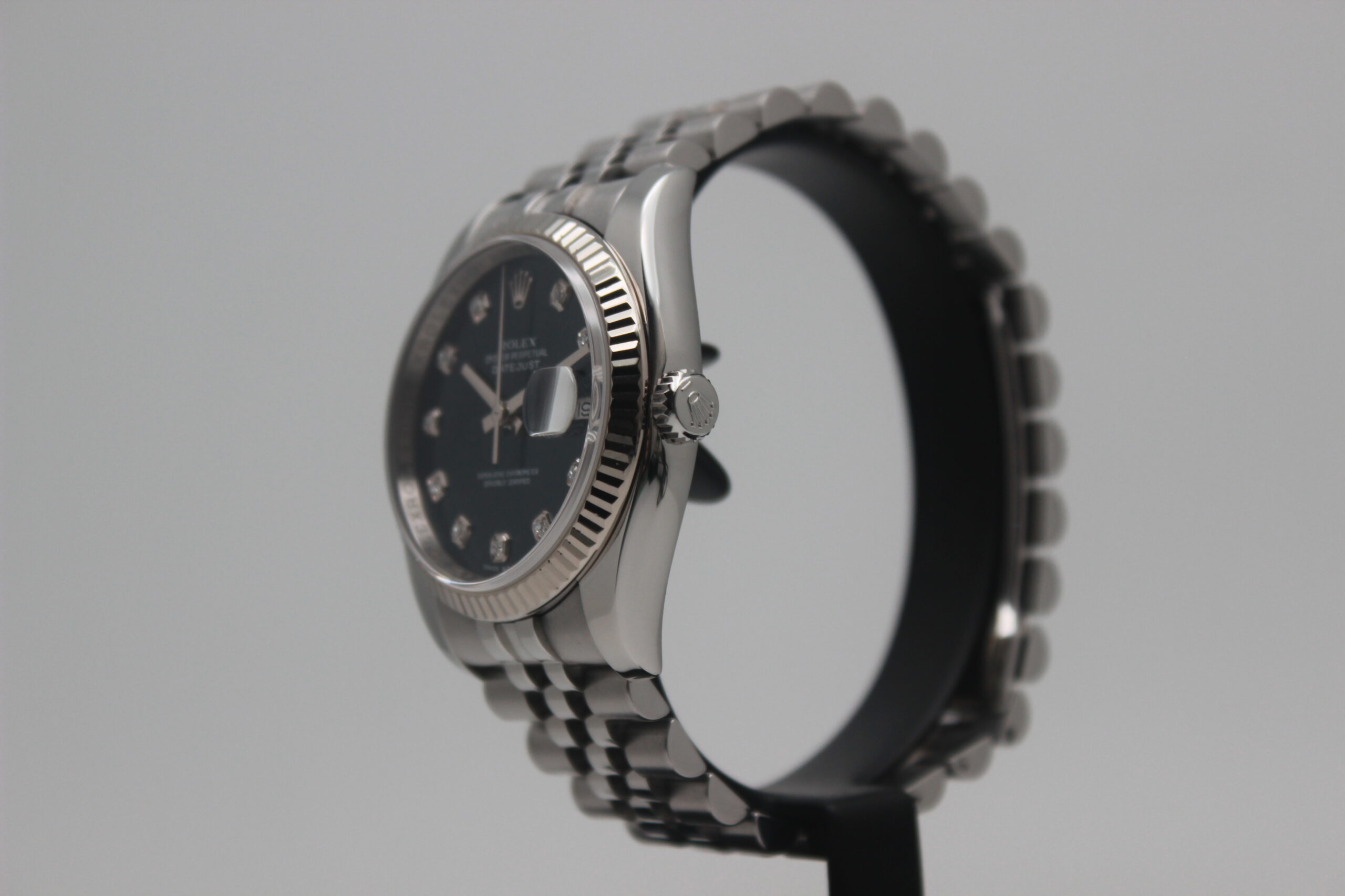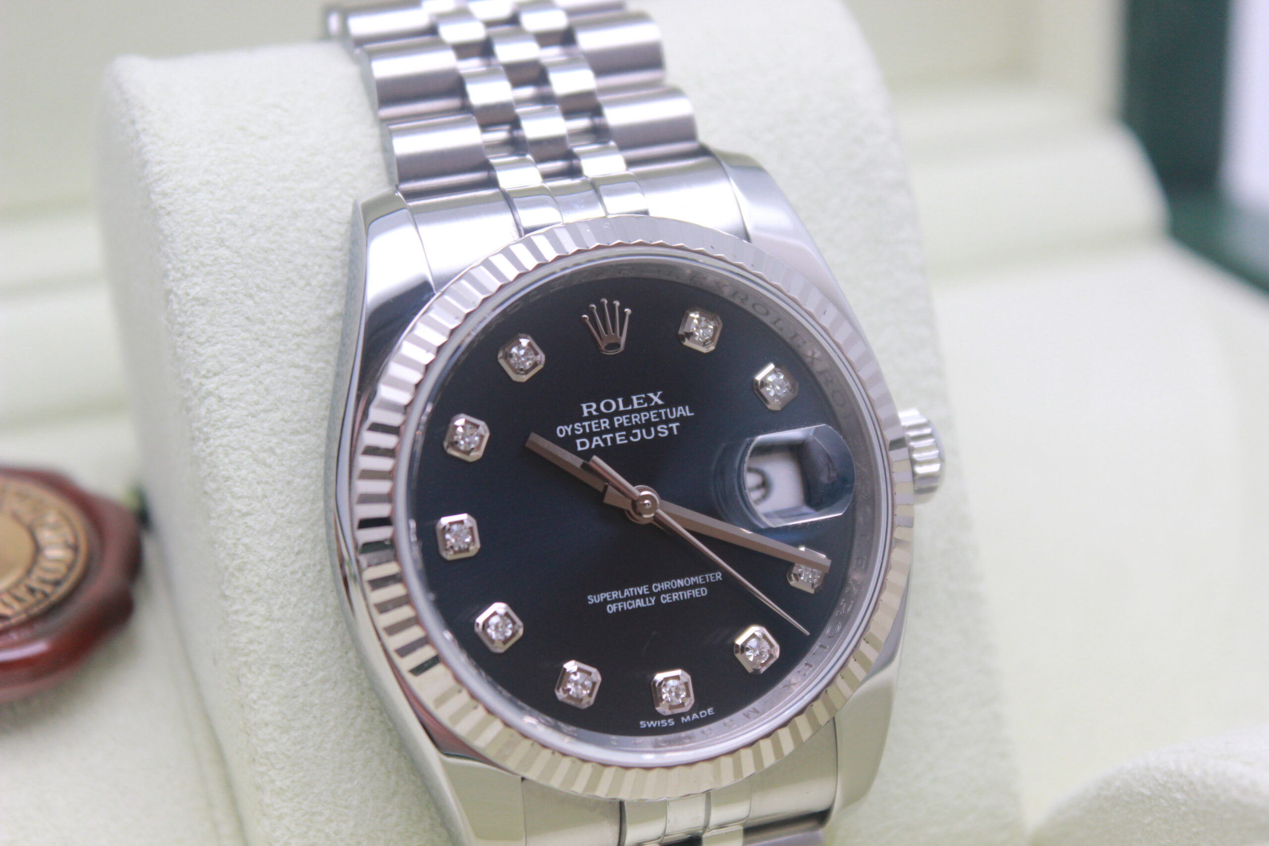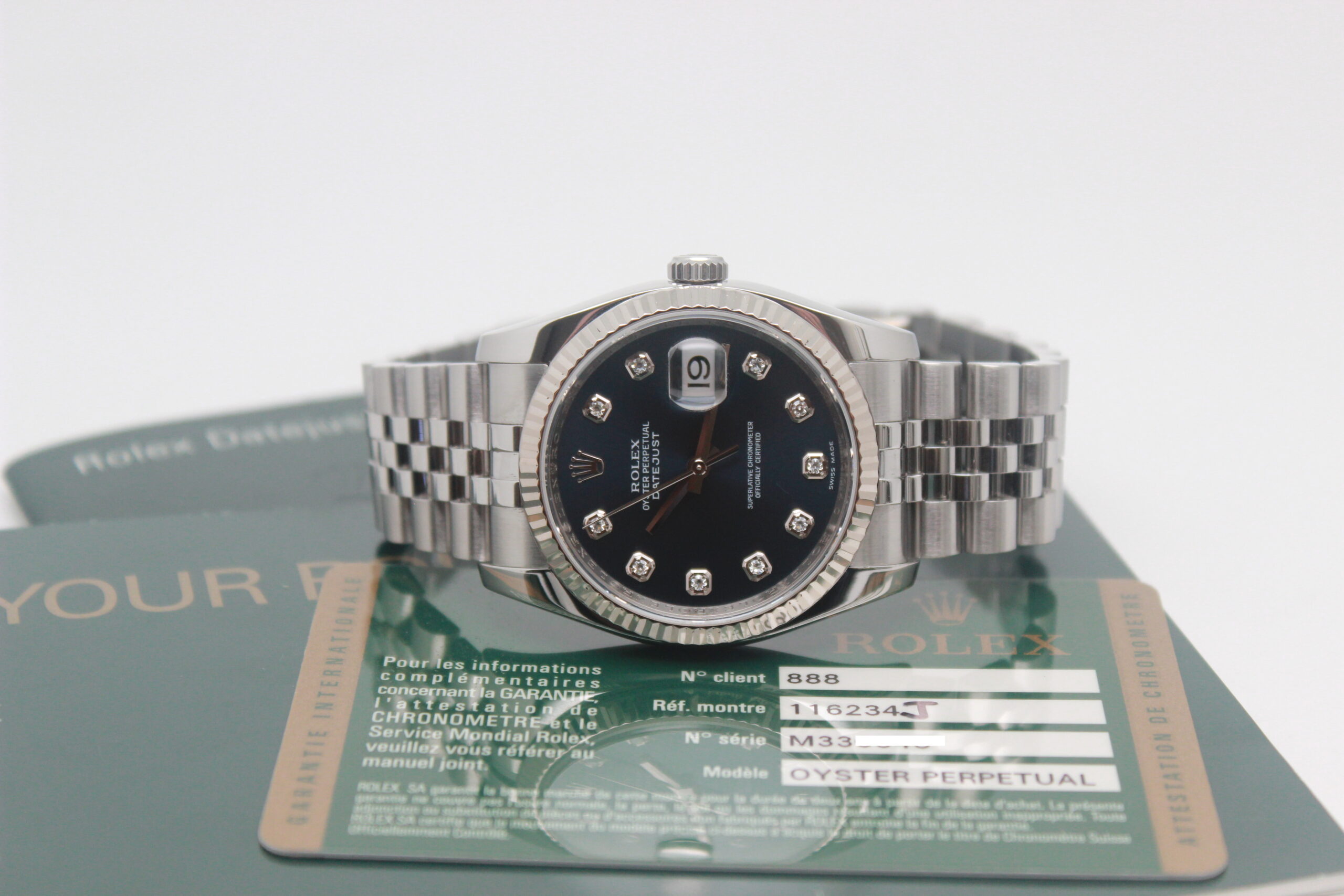Rolex Datejust 36 “Blue Dial” 116234 Full Set 2010, cassa in acciaio da 36 mm, quadrante blu con diamanti e data, lunetta zigrinata in oro bianco, bracciale Jubilee in acciaio lucido e satinato con chiusura a scomparsa. Questo modello è dotato di un movimento meccanico a carica automatica di manifattura Rolex calibro 3135. Corredato di scatola e card di garanzia originali Rolex.