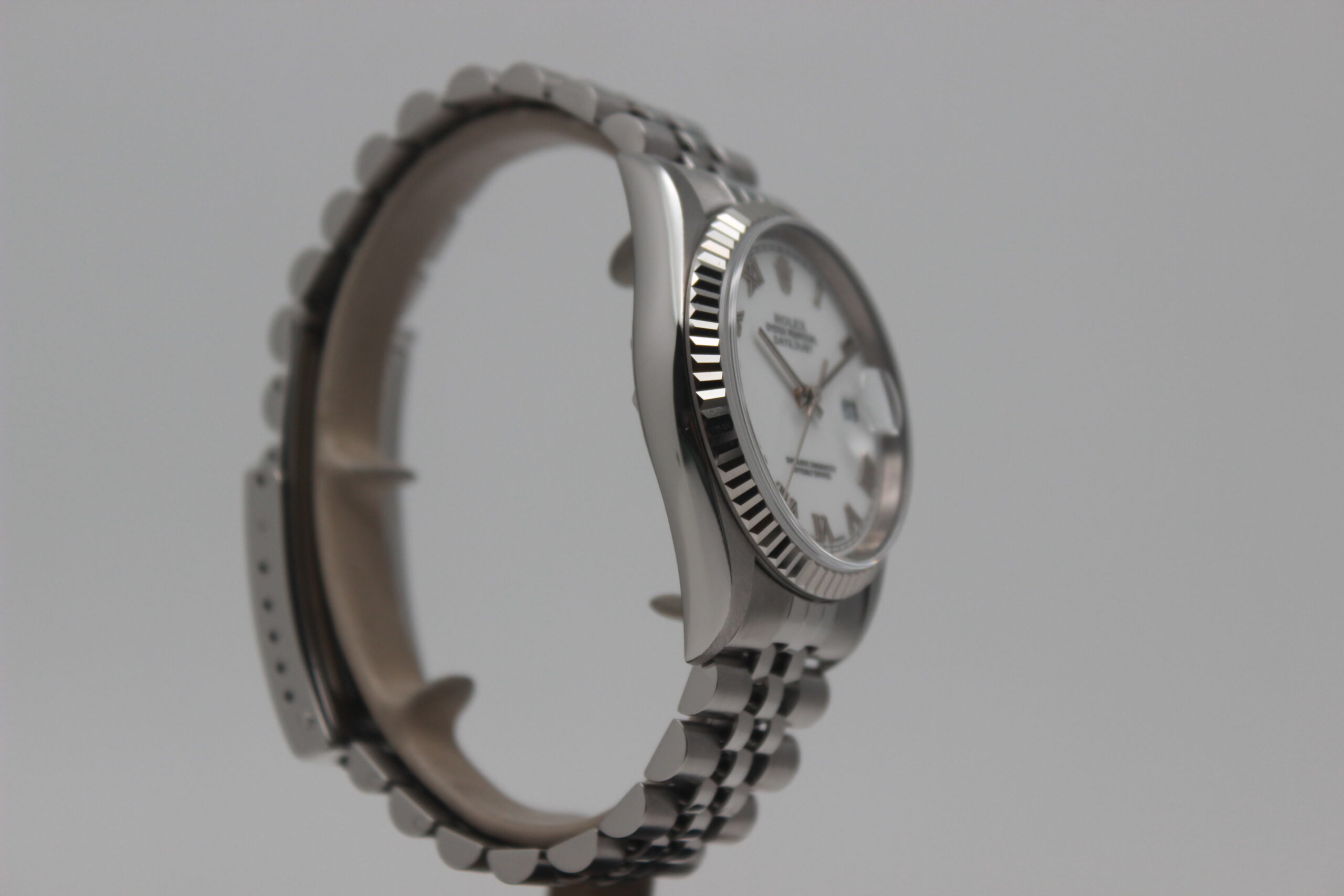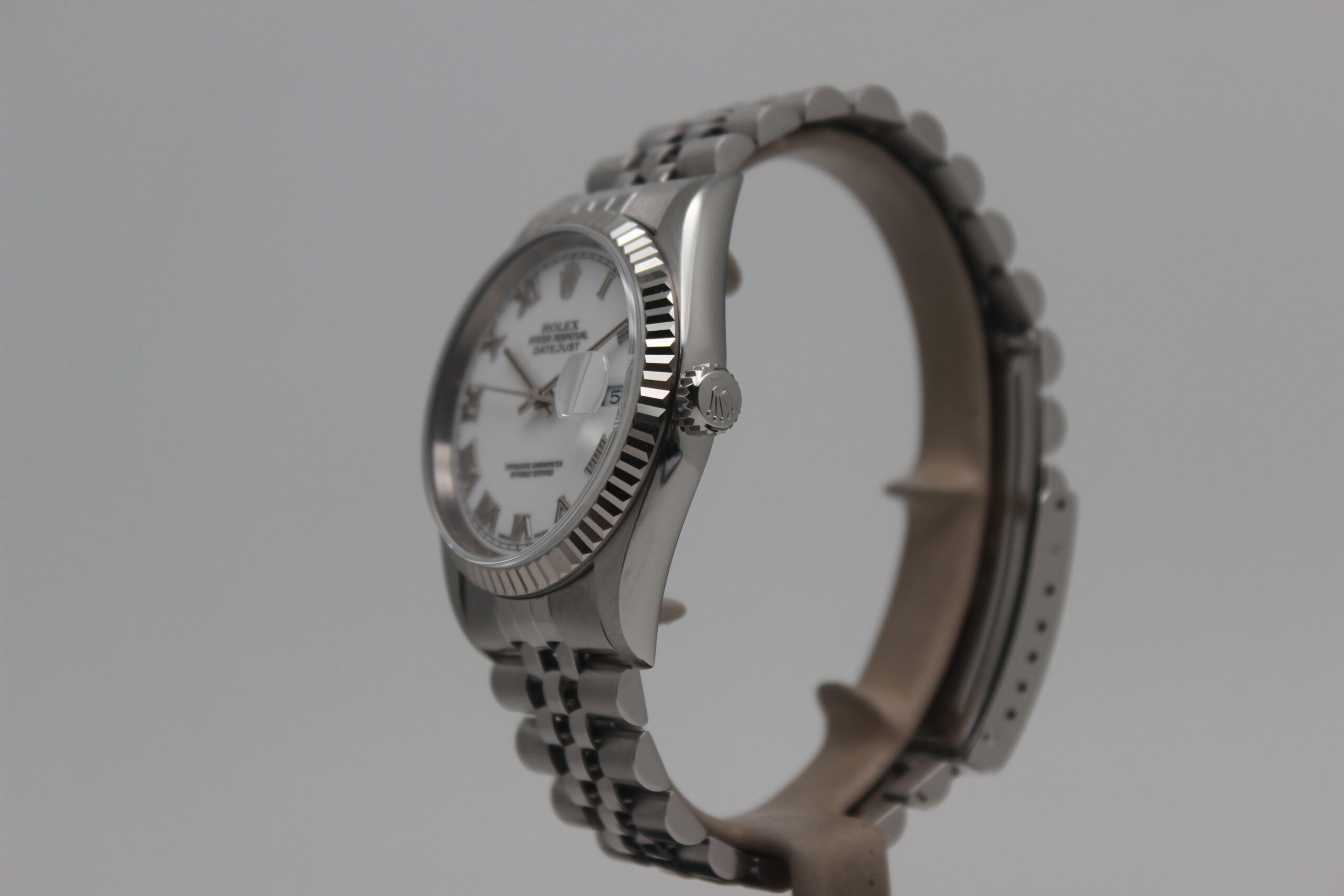 Rolex Datejust 36 “White Roman Dial” 16234 Full Set 1999, cassa in acciaio da 36 mm, quadrante bianco con numeri romani e con data, lunetta zigrinata in oro bianco, bracciale Jubilee in acciaio lucido e satinato con chiusura a cassetta in acciaio. Questo modello è dotato di un movimento meccanico a carica automatica calibro 3135. Corredato di scatola e garanzia originali Rolex.