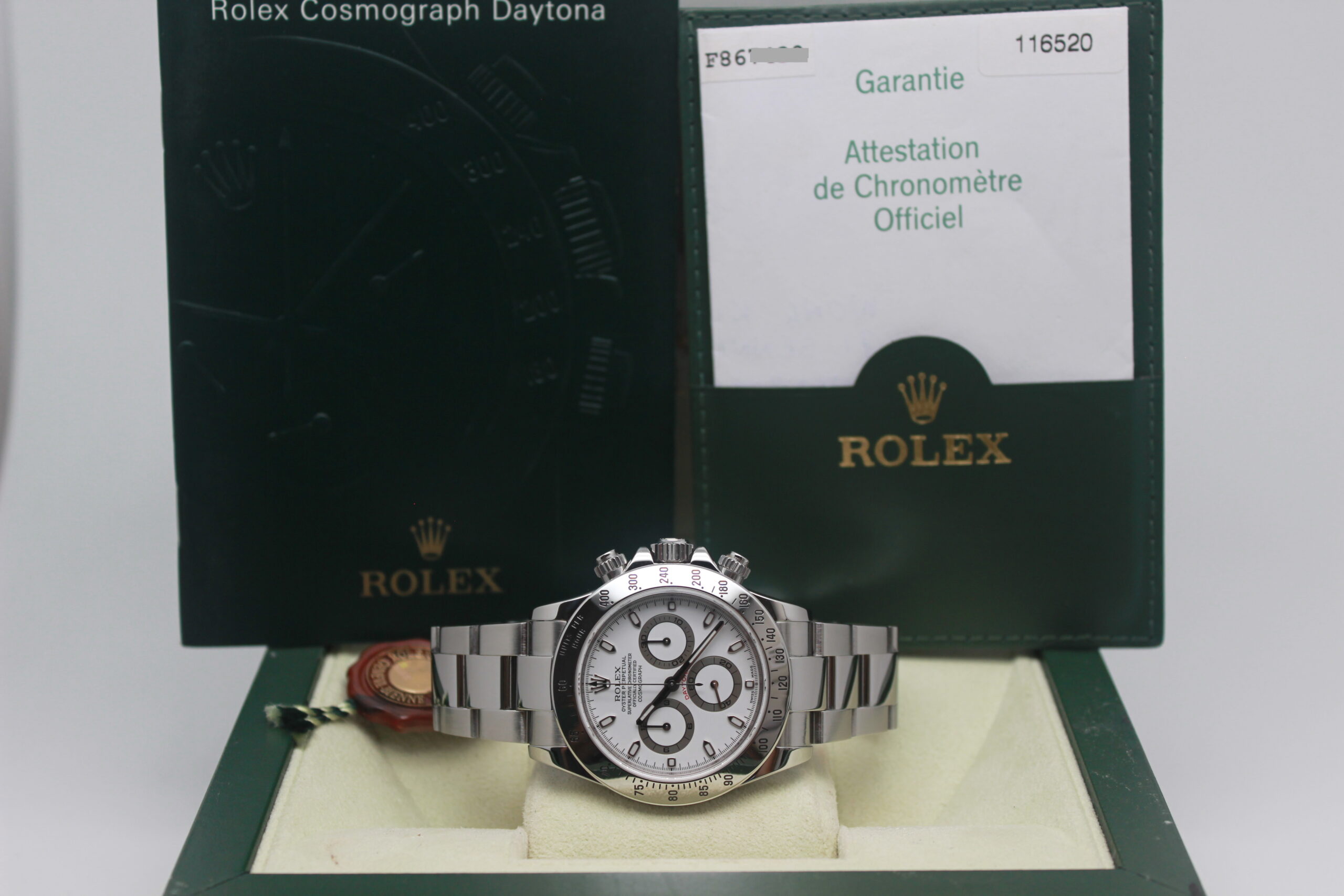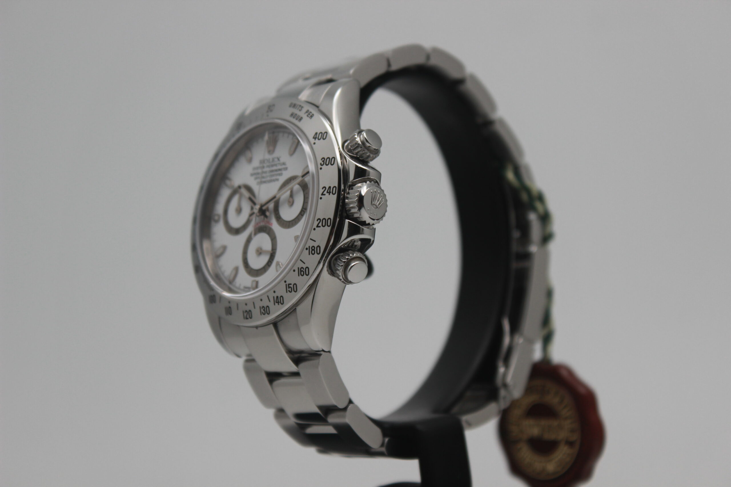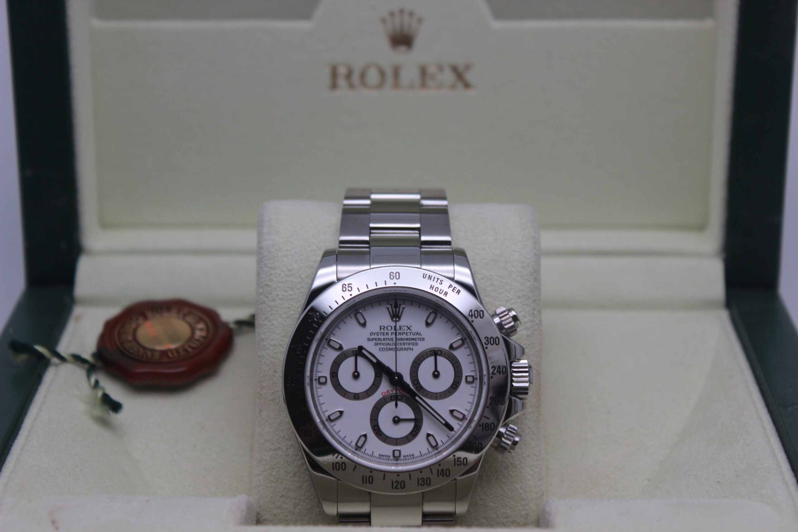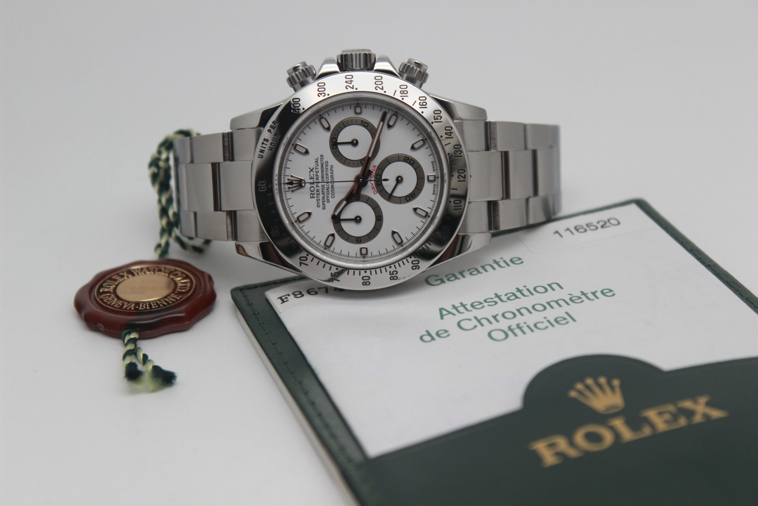 Rolex Daytona 116520 Full Set 2005, cassa in acciaio da 40mm, quadrante bianco, lunetta in acciaio, bracciale Oyster in acciaio lucido e satinato con chiusura Oysterlock in acciaio lucido e satinato. Questo modello è dotato di un movimento meccanico a carica automatica di manifattura Rolex calibro 4130. Corredato di scatola e di garanzia originali Rolex.