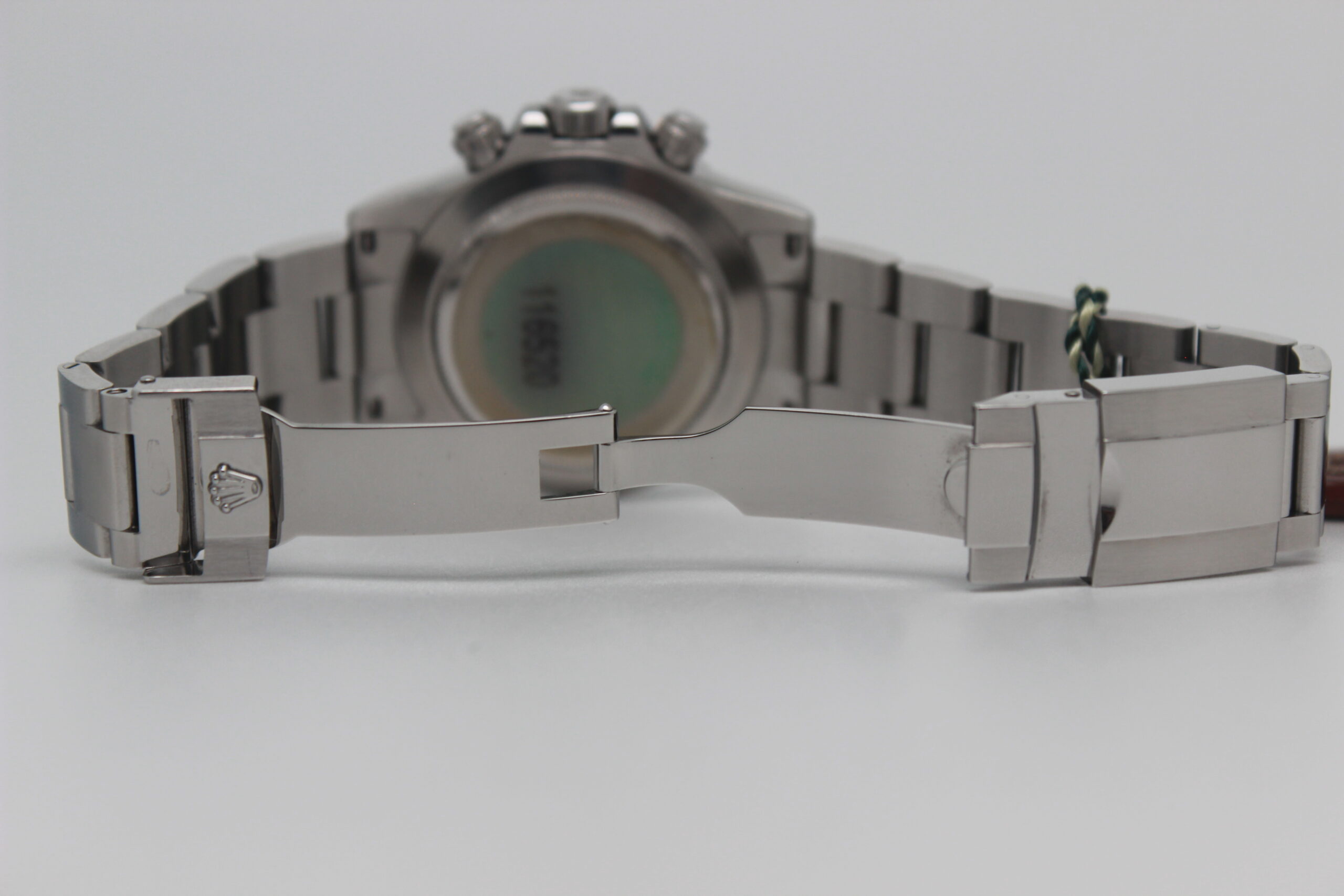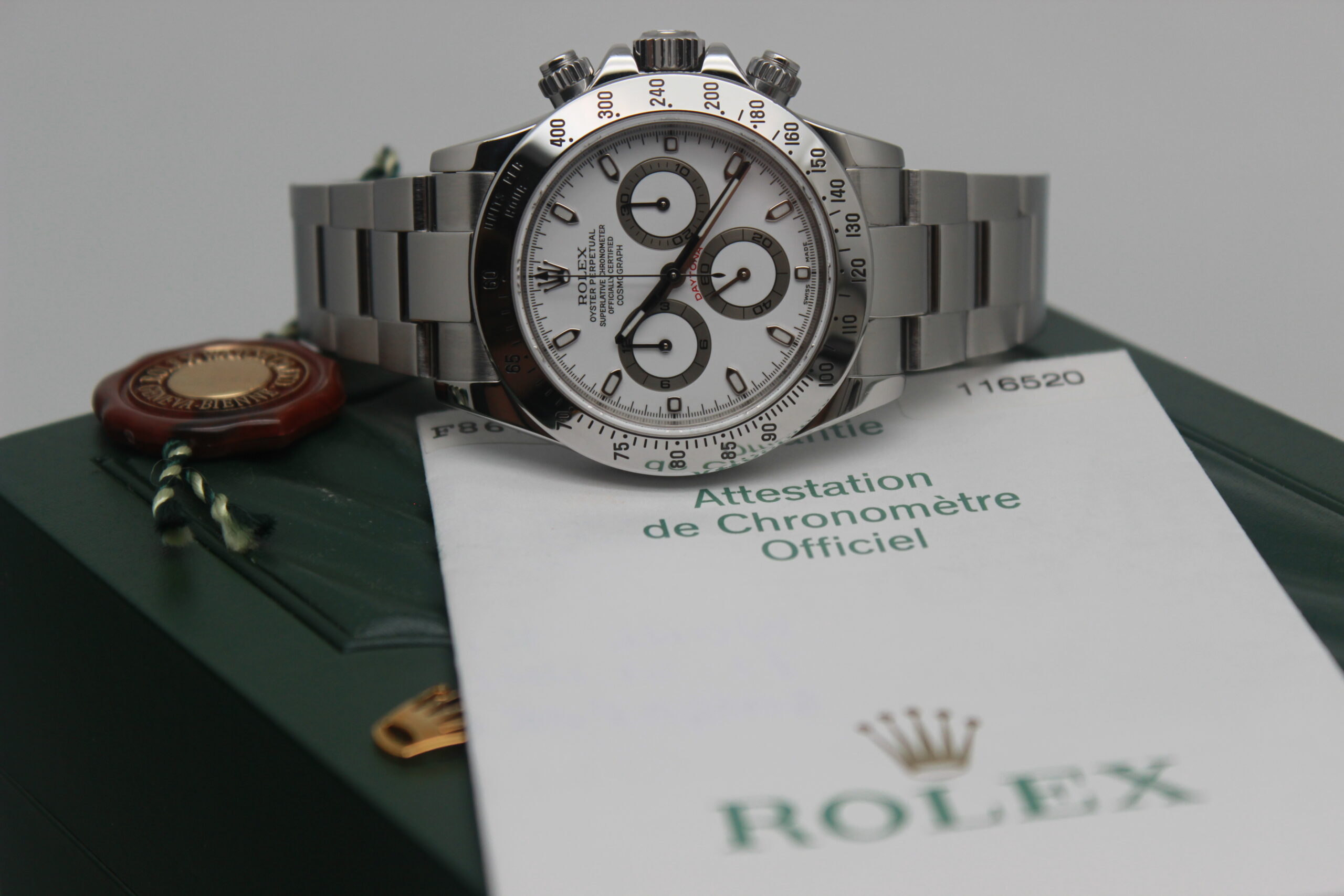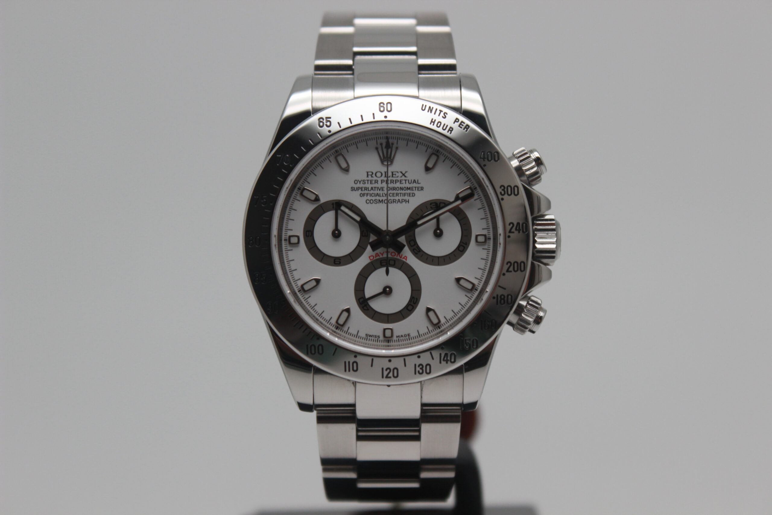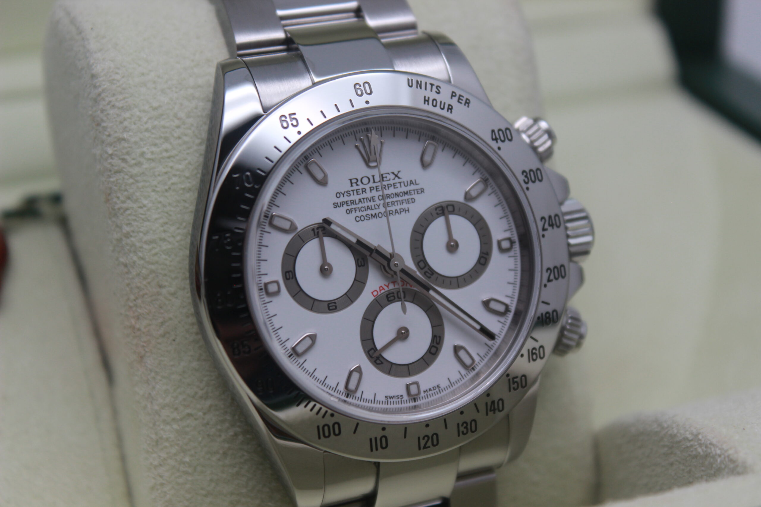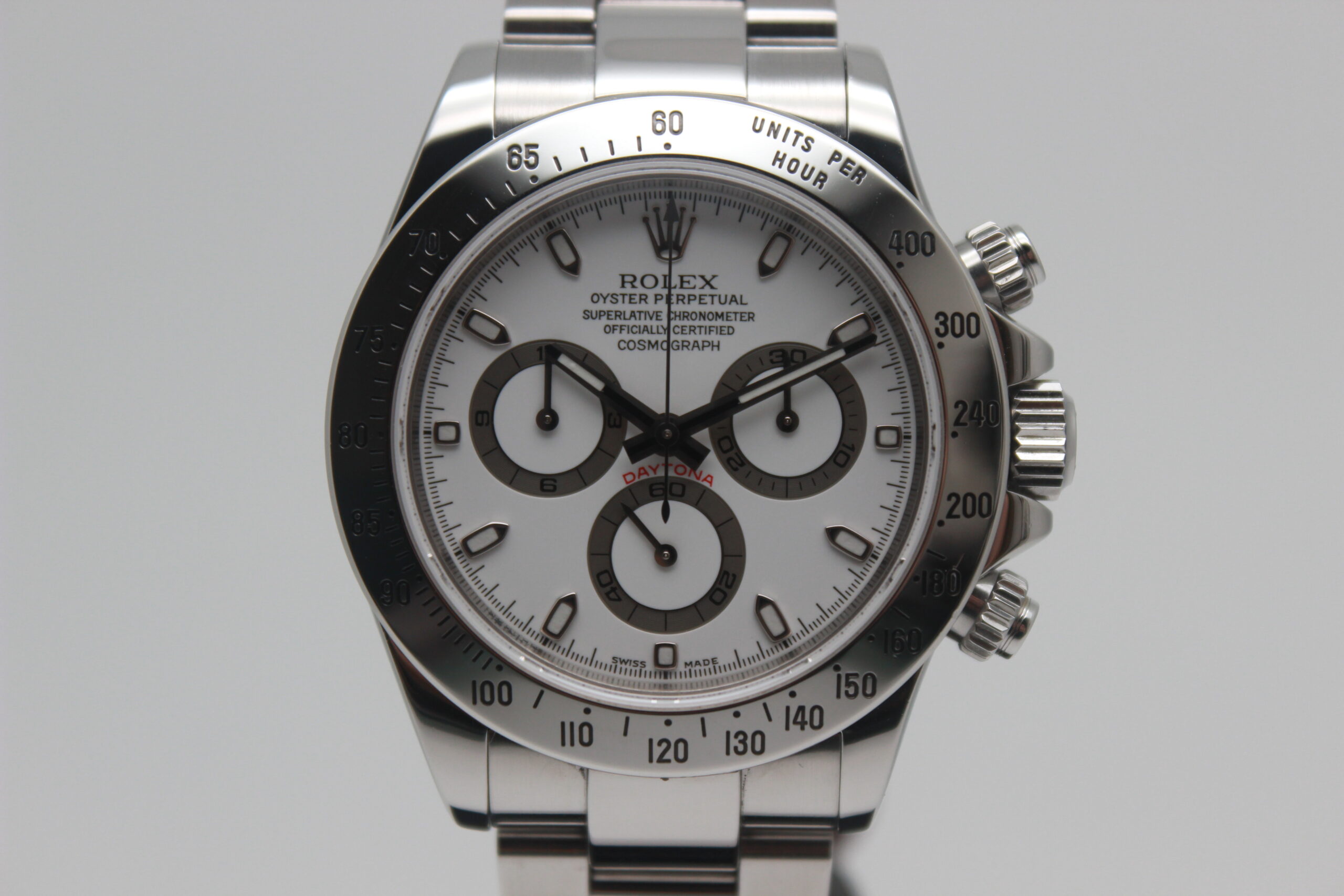 Rolex Daytona 116520 Full Set 2005, cassa in acciaio da 40mm, quadrante bianco, lunetta in acciaio, bracciale Oyster in acciaio lucido e satinato con chiusura Oysterlock in acciaio lucido e satinato. Questo modello è dotato di un movimento meccanico a carica automatica di manifattura Rolex calibro 4130. Corredato di scatola e di garanzia originali Rolex.