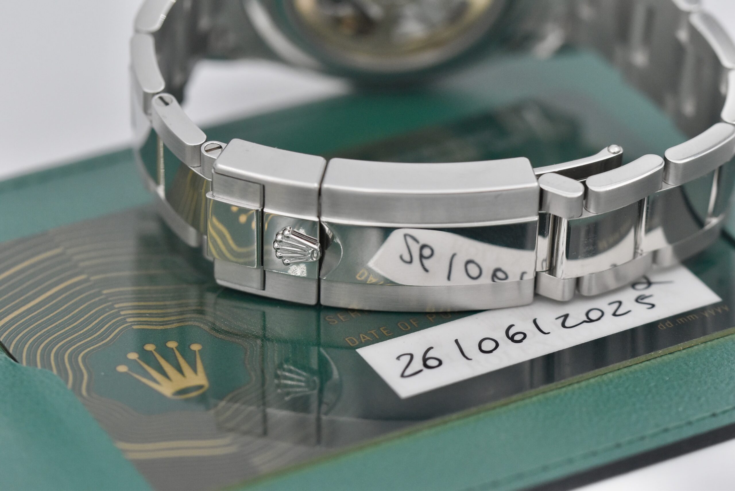 Rolex Daytona Cosmograph, referenza 126506, seriale alfanumerico, anno 2025, corredato di scatola originale, libretto e card di garanzia Rolex valida fino al 2030.