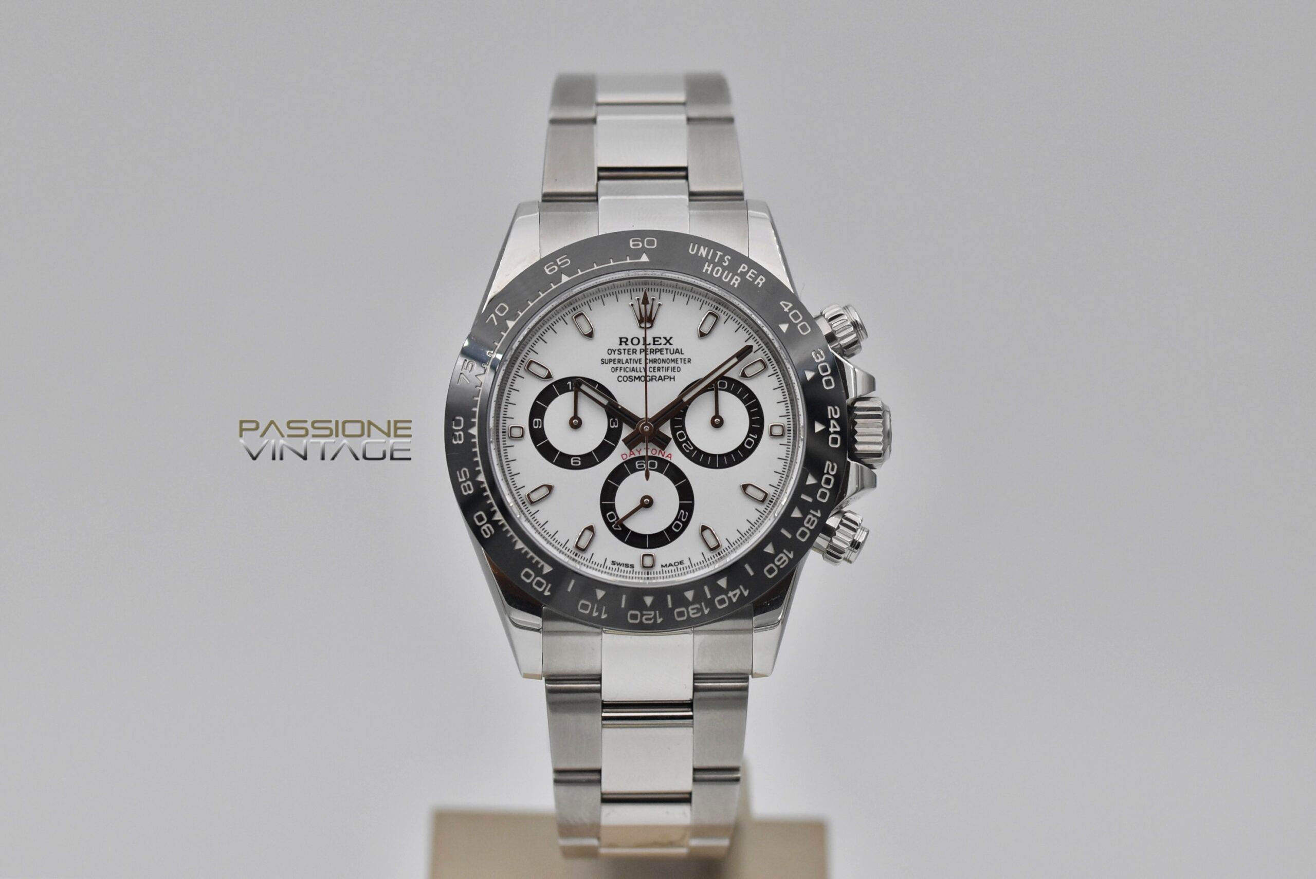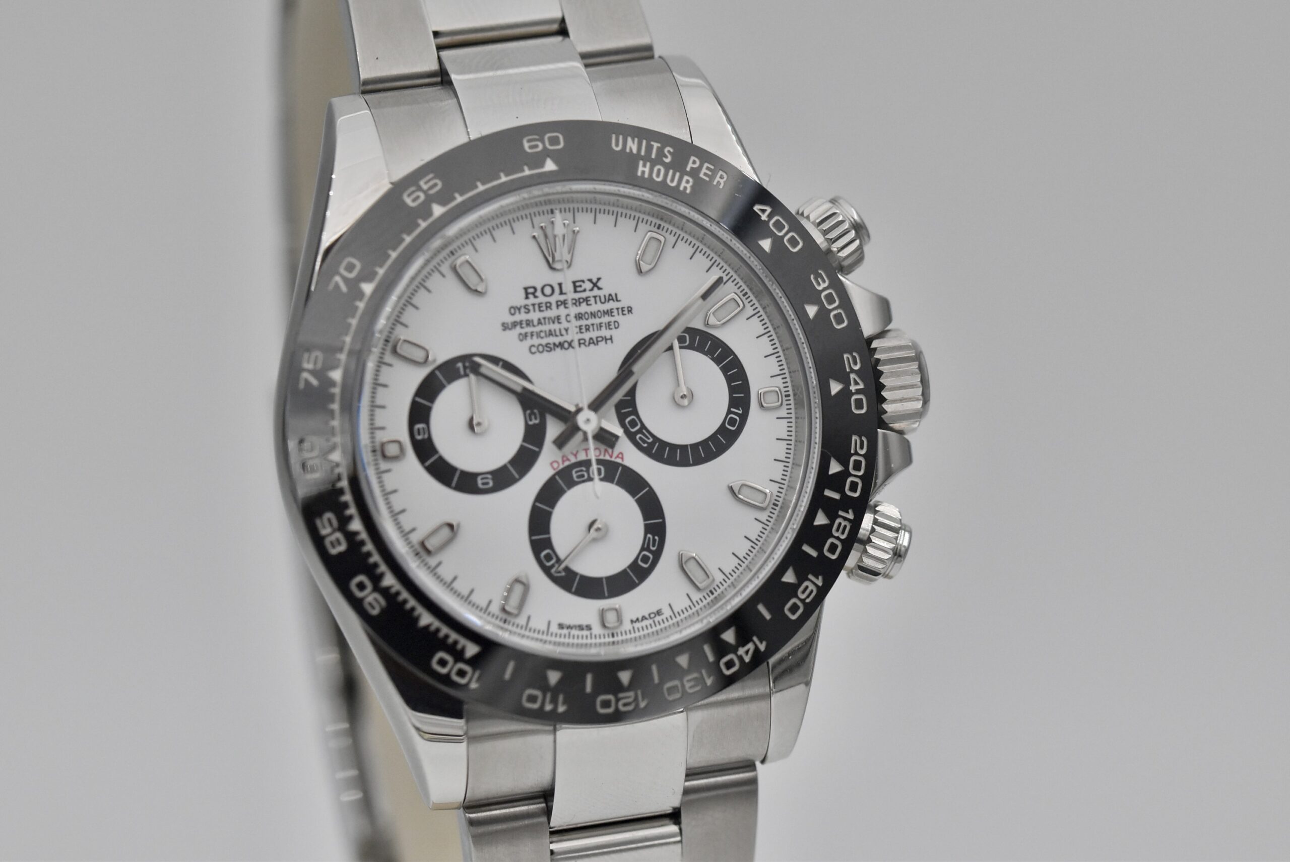 Questo modello è dotato di un movimento meccanico a carica automatica calibro 4130 di manifattura Rolex, e di un quadrante di colore bianco “panda” con indici a bacchetta.