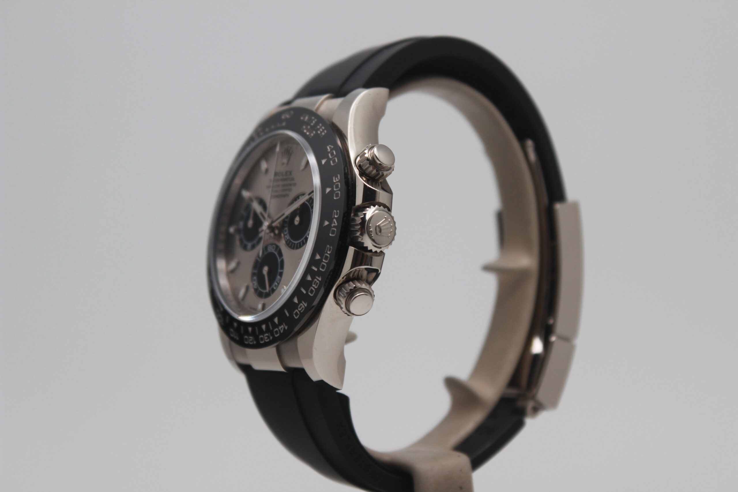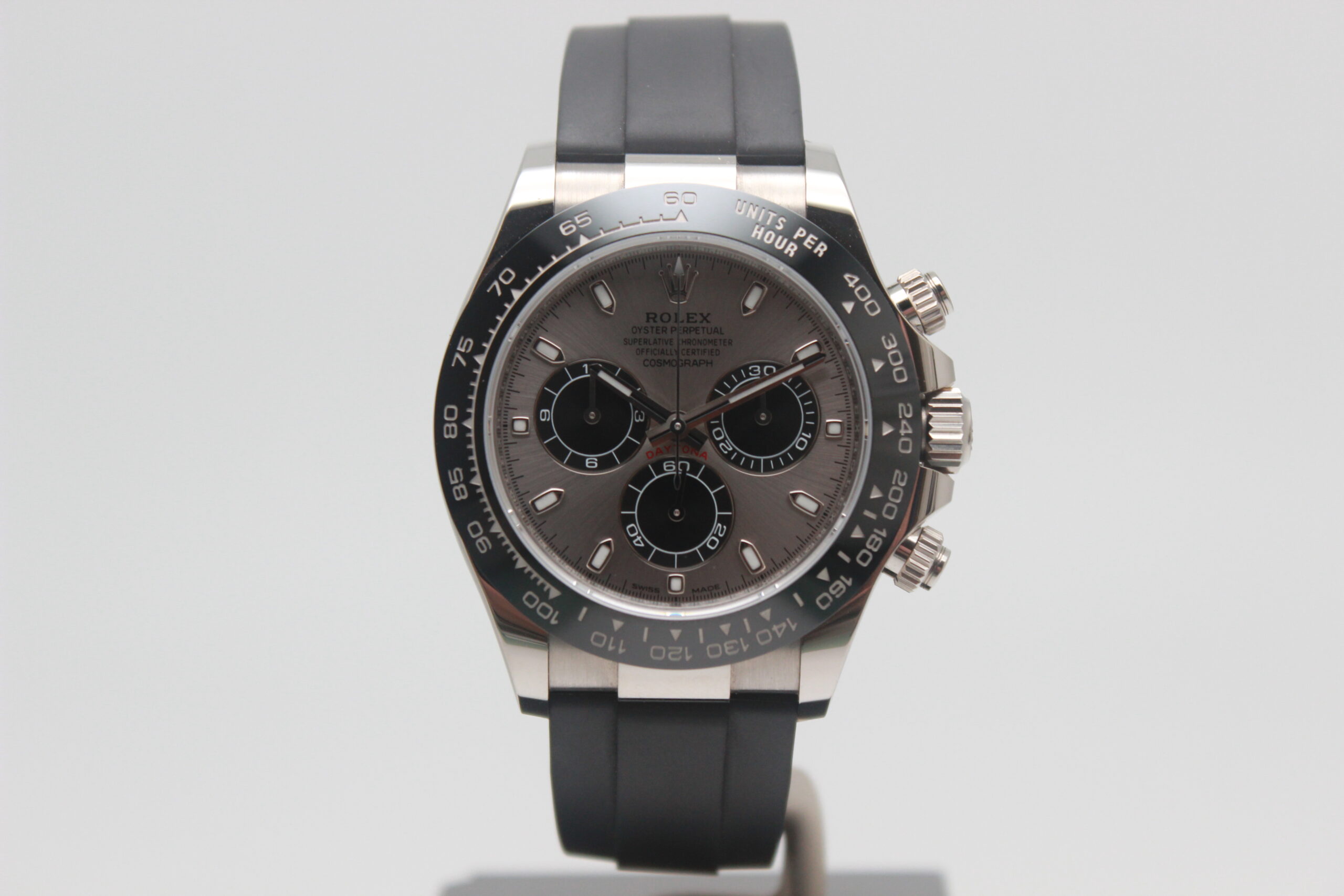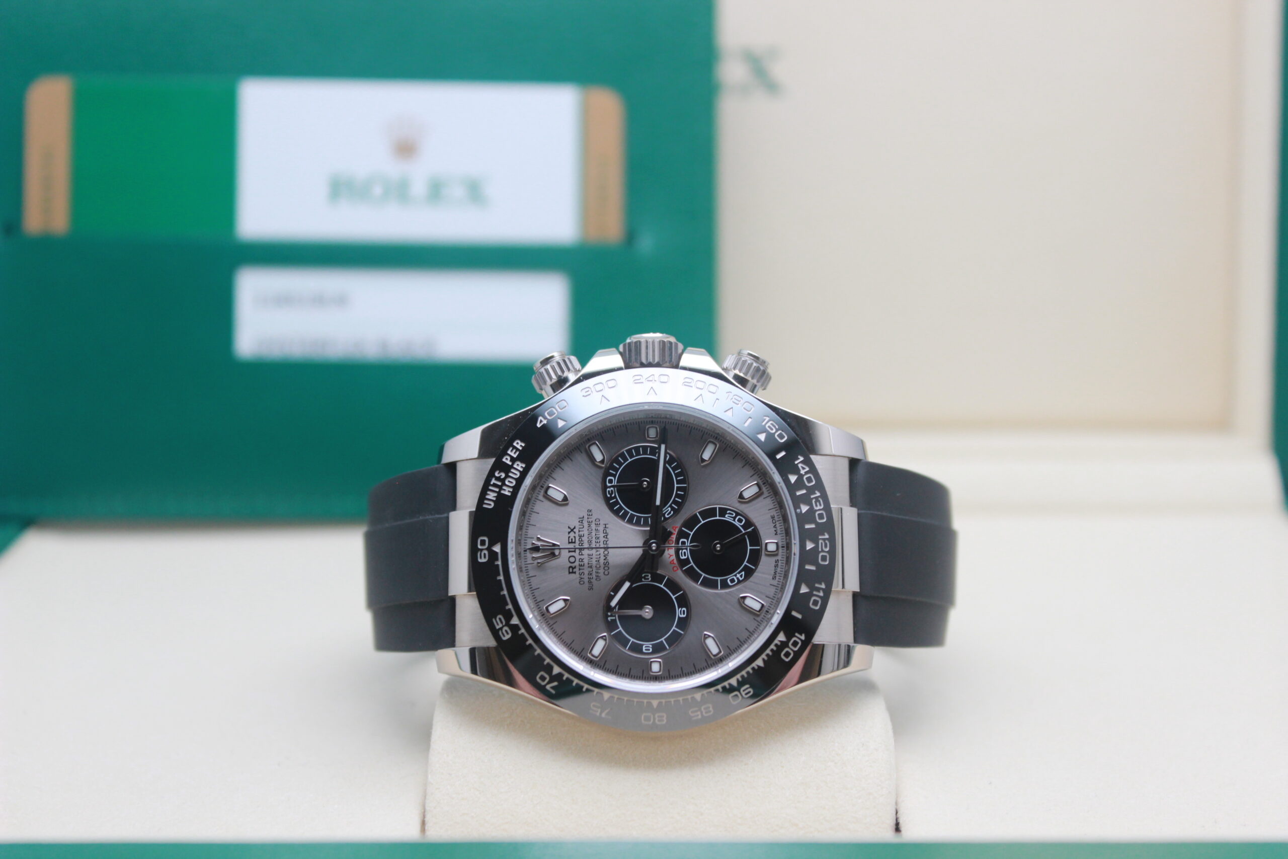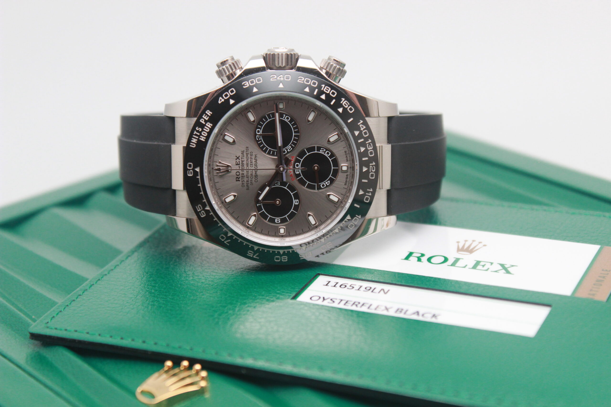 Rolex Daytona Cosmograph 116519LN Full Set 2018, cassa in oro bianco da 40 mm, quadrante grigio, lunetta in ceramica nera, cinturino nero in gomma con chiusura Oysterlock in oro bianco. Questo modello è dotato di un movimento meccanico a carica automatica calibro 4130. Corredato di scatola e card di garanzia originali Rolex