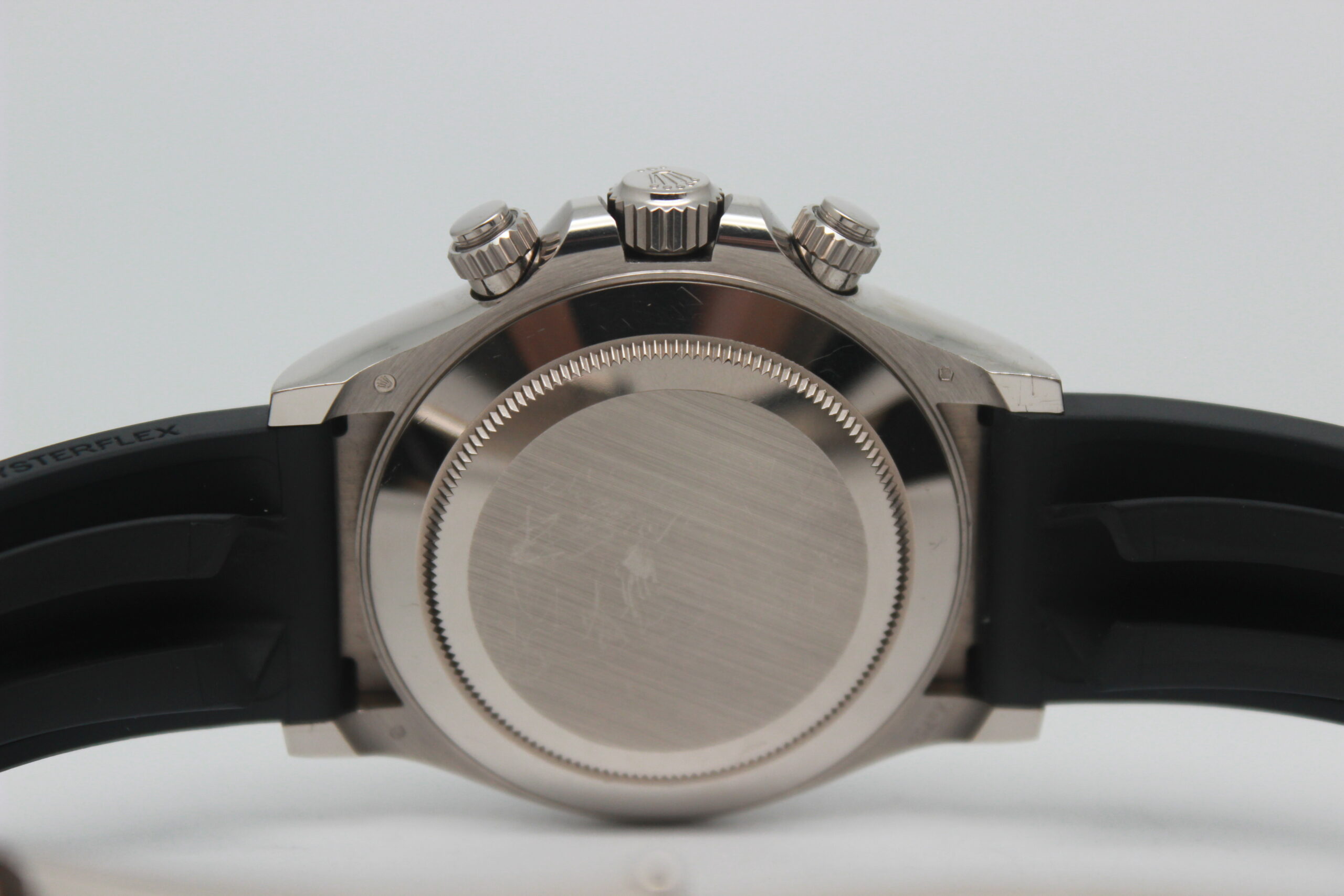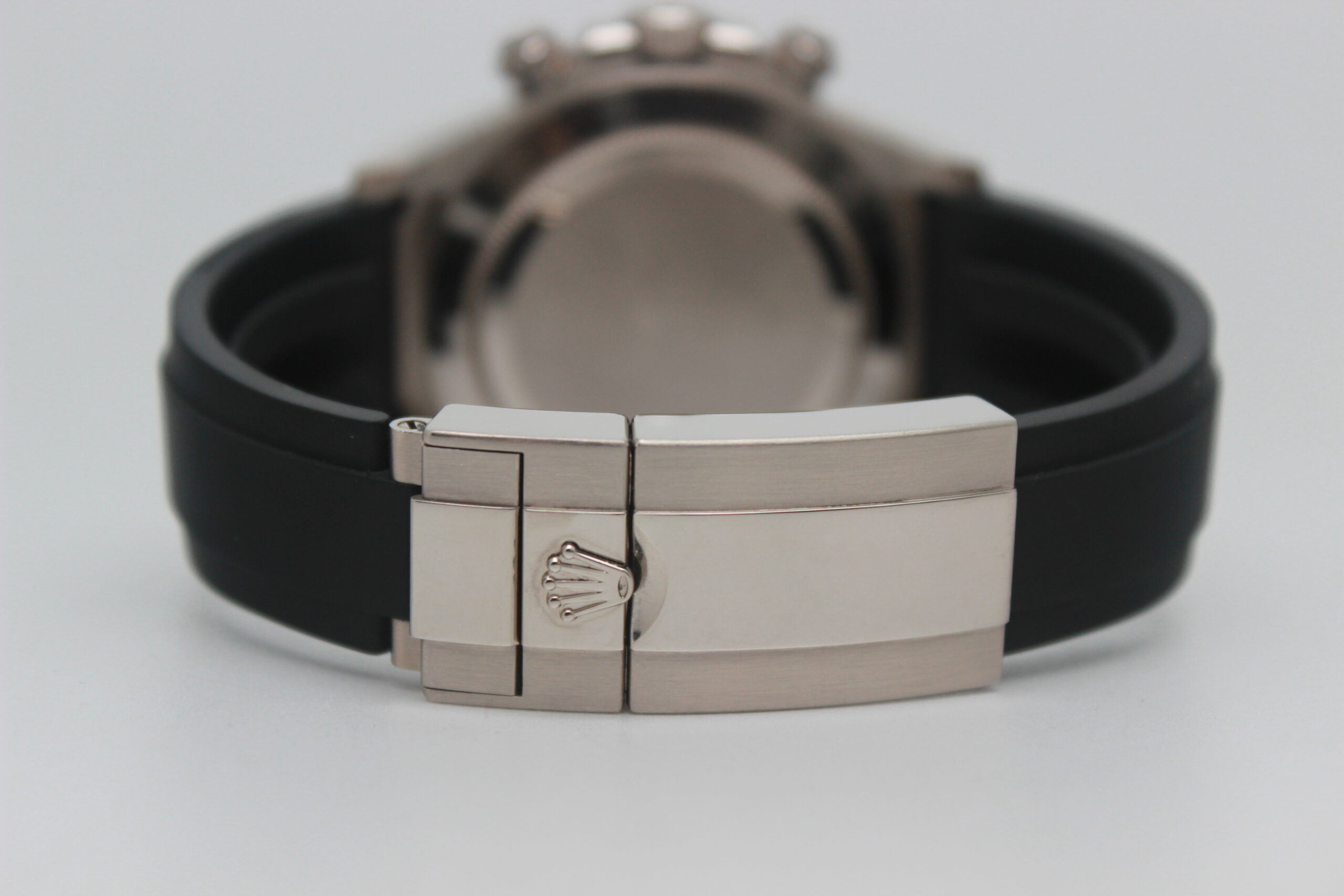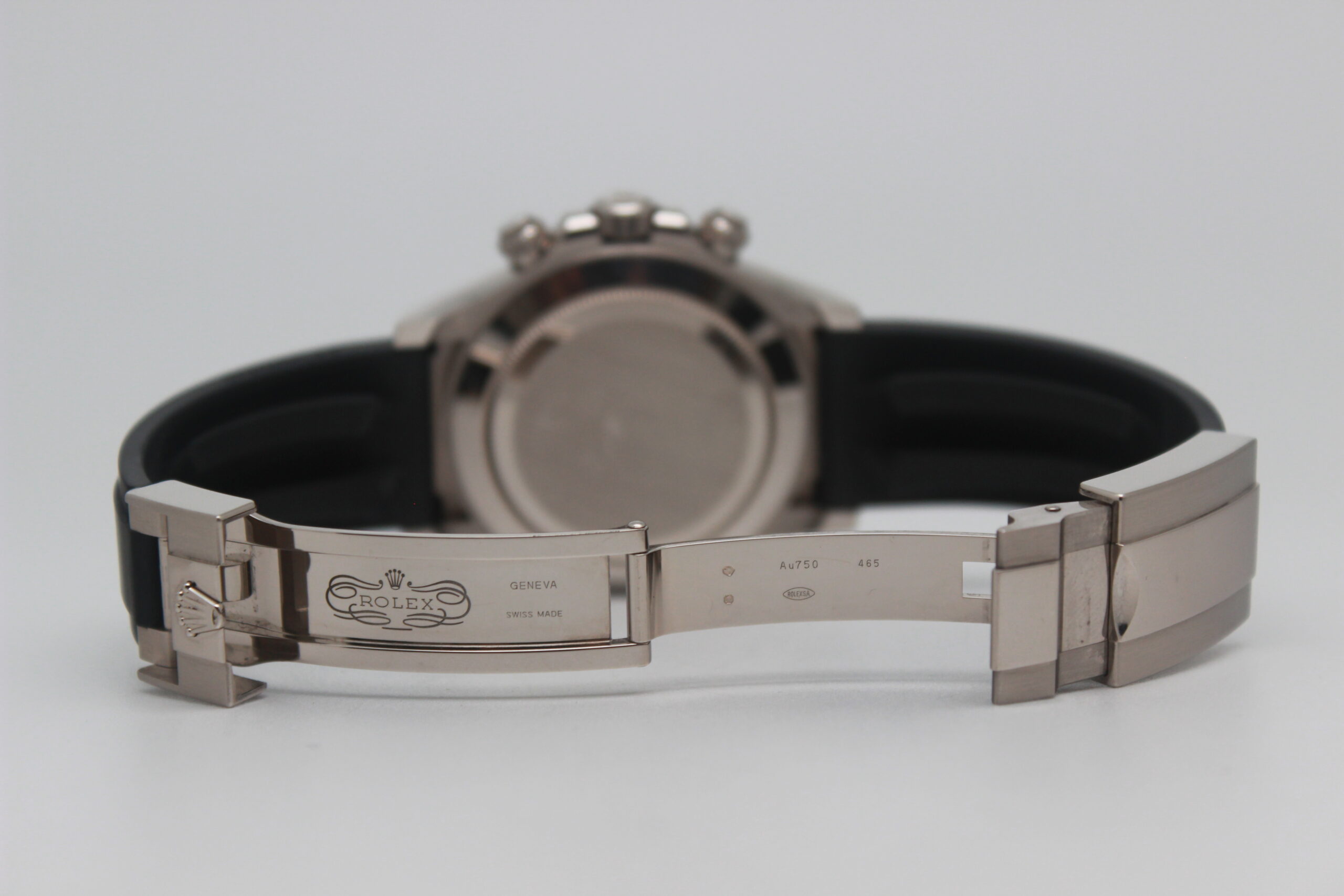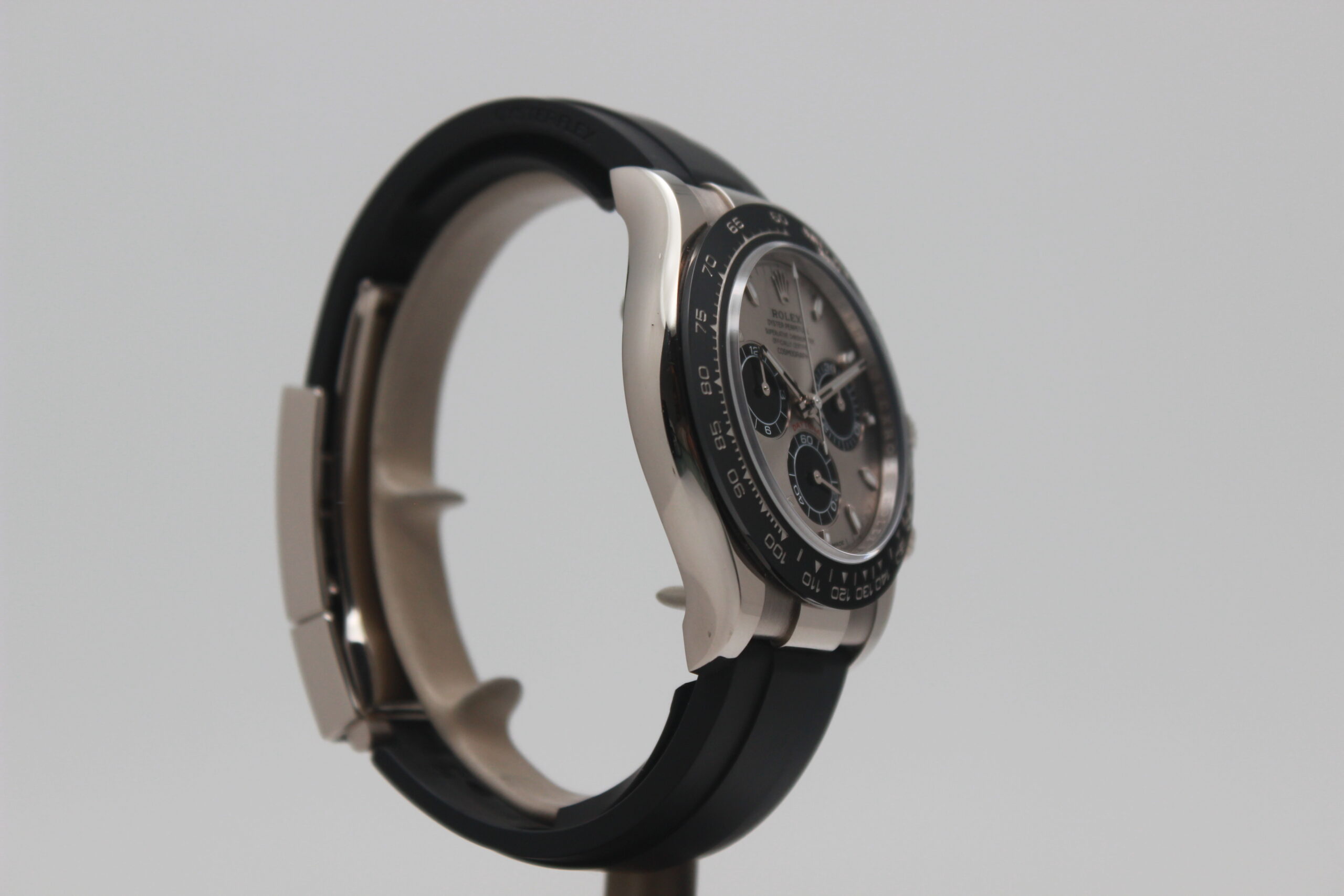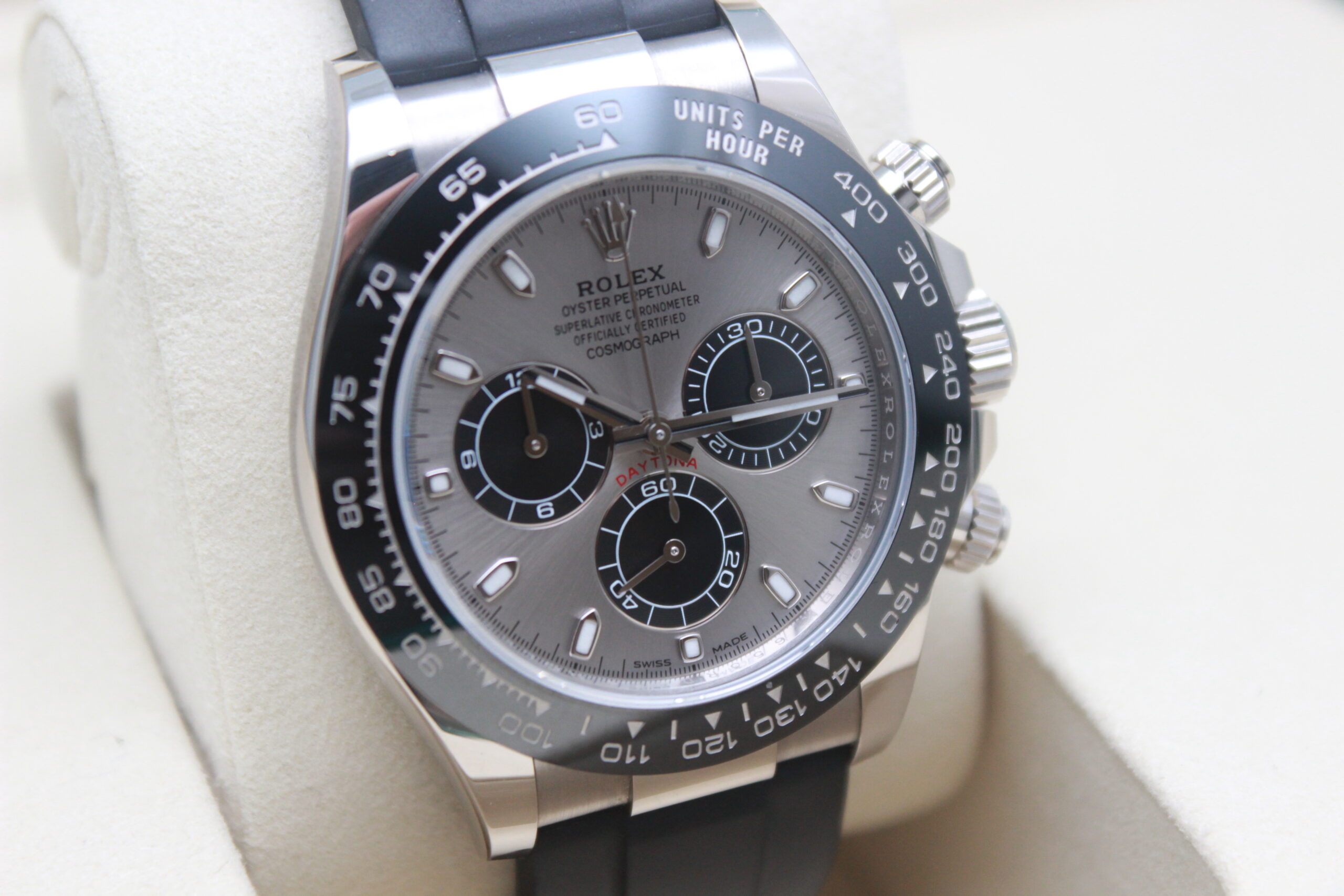 Rolex Daytona Cosmograph 116519LN Full Set 2018, cassa in oro bianco da 40 mm, quadrante grigio, lunetta in ceramica nera, cinturino nero in gomma con chiusura Oysterlock in oro bianco. Questo modello è dotato di un movimento meccanico a carica automatica calibro 4130. Corredato di scatola e card di garanzia originali Rolex