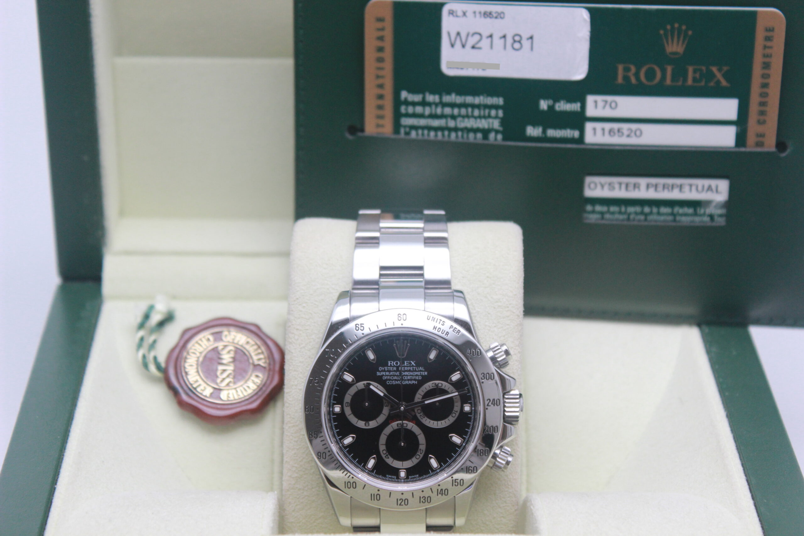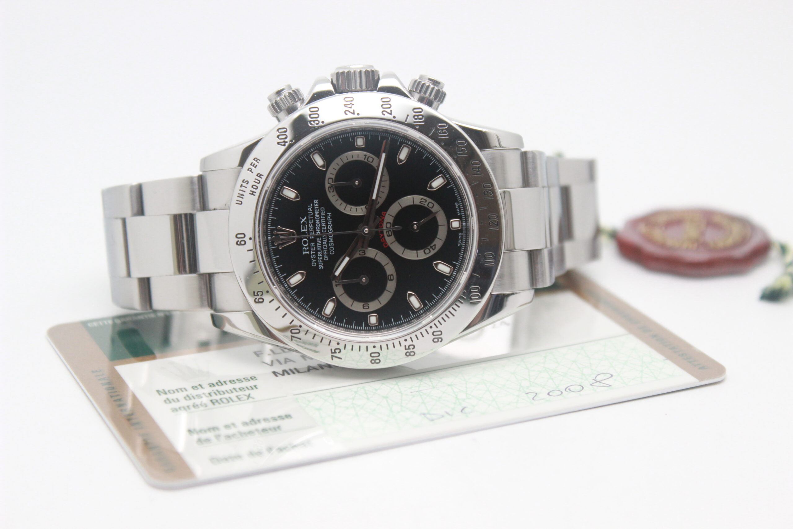 Rolex Daytona Cosmograph 116520 Full Set 2008, cassa in acciaio da 40 mm, quadrante nero, lunetta in acciaio, bracciale Oyster in acciaio lucido e satinato con chiusura Oysterlock in acciaio. Questo modello è dotato di un movimento meccanico a carica automatica di manifattura Rolex calibro 4130. Corredato di scatola e card di garanzia originali Rolex.