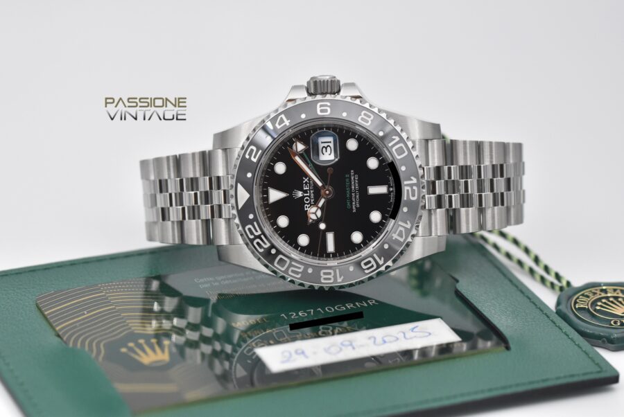 Rolex GMT Master II, referenza 126710GRNR, anno 2025, completo di scatola originale e card di garanzia Rolex originale valida fino al 2030.