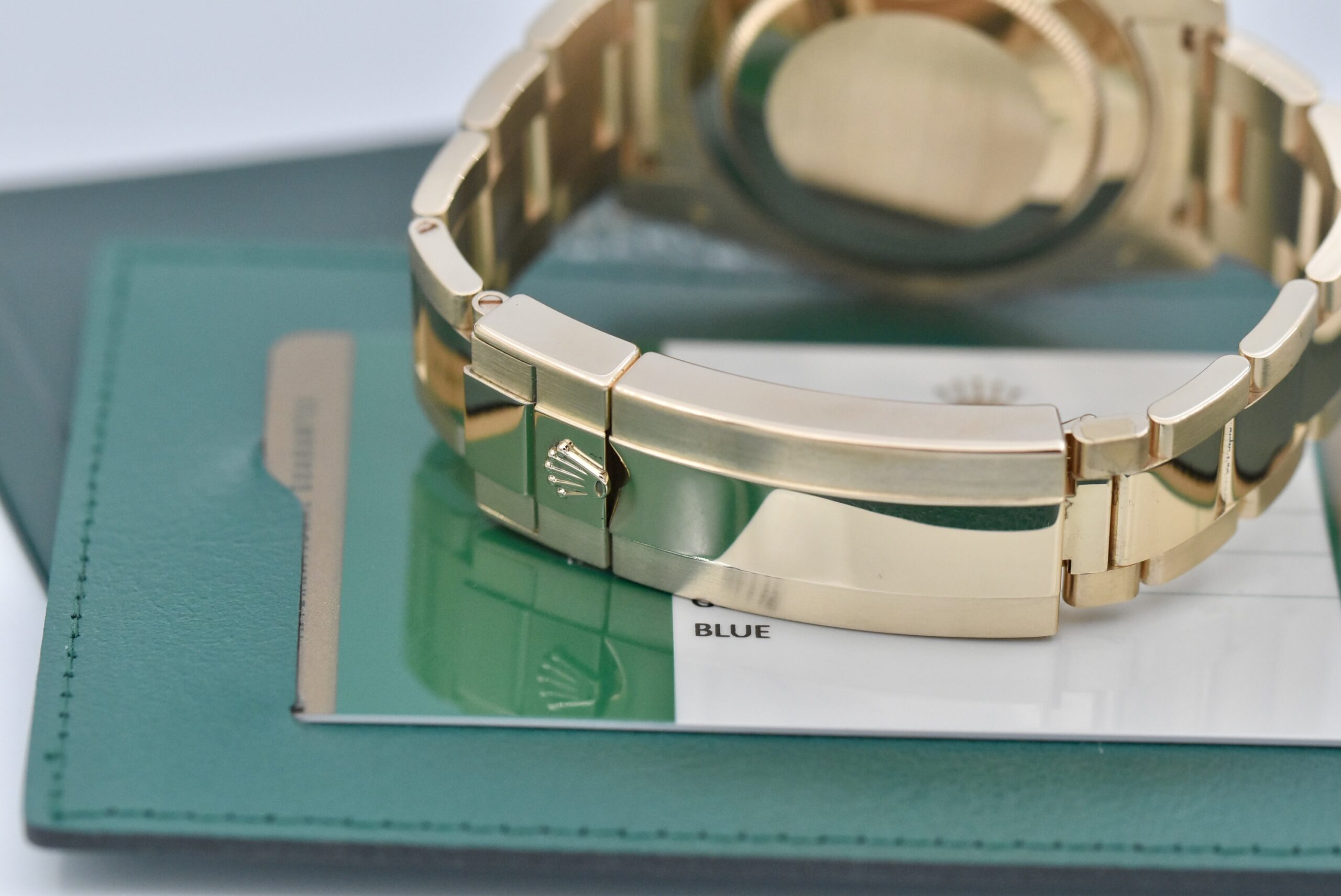 presenta una cassa in oro giallo da 40 mm, una lunetta girevole unidirezionale in oro giallo con inserto in ceramica blu ed un bracciale in oro lucido e satinato con chiusura Oysterlock.
