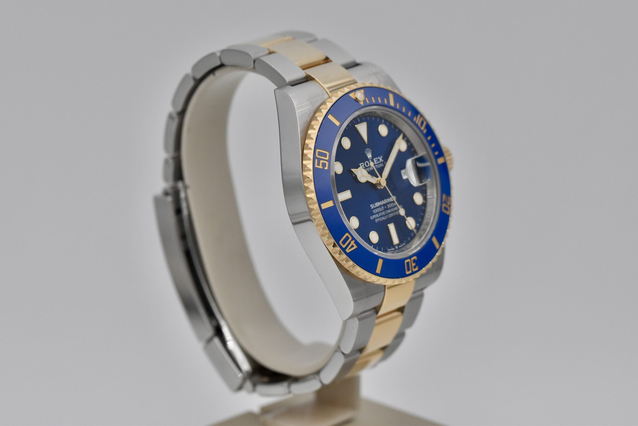 presenta una cassa in acciaio da 41 mm, una lunetta in oro giallo girevole con inserto in ceramica blu ed un bracciale Oyster in acciaio e oro giallo lucido e satinato con chiusura Oysterlock.