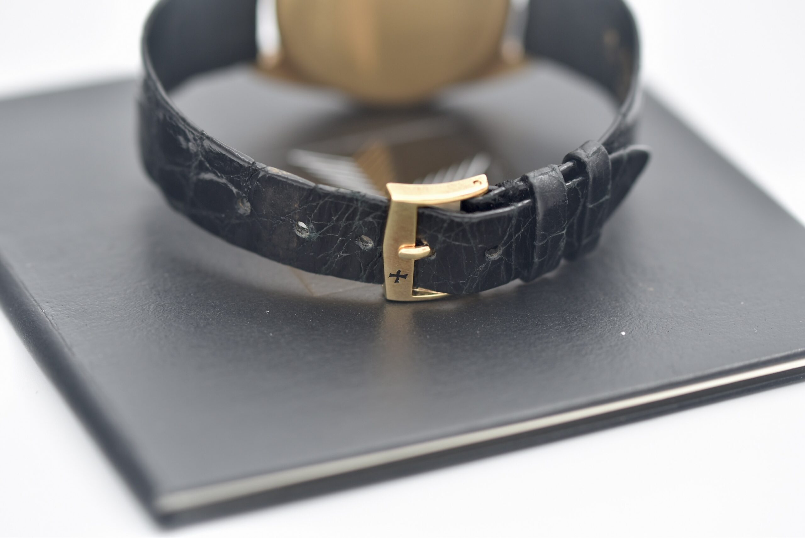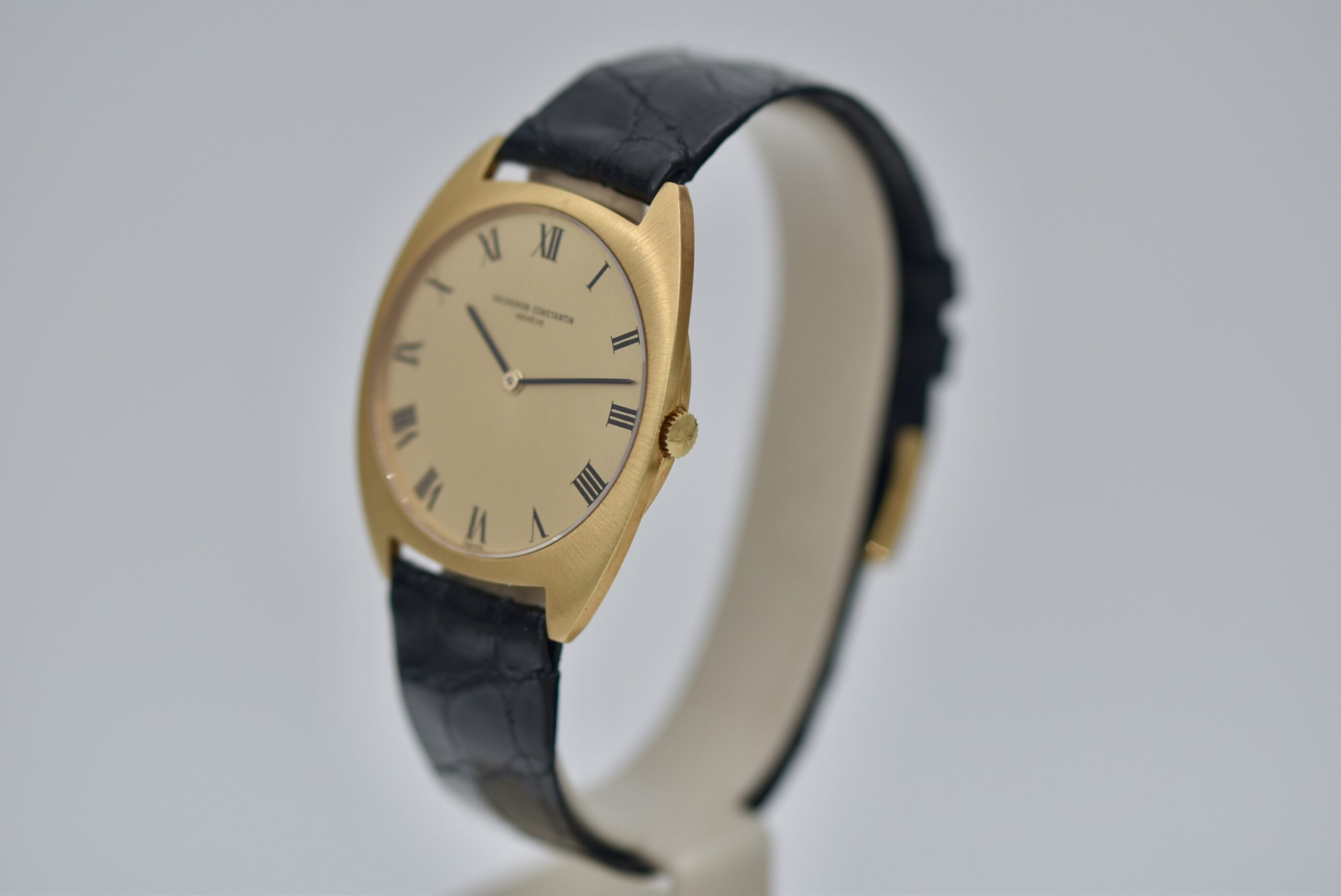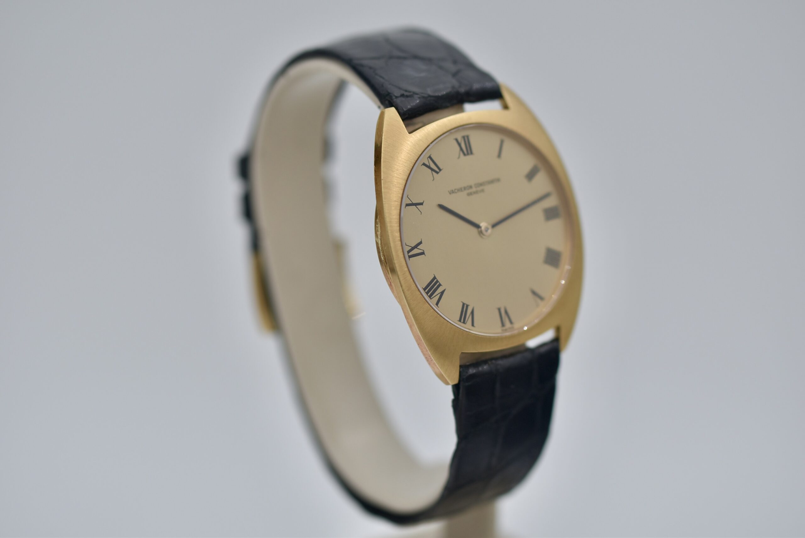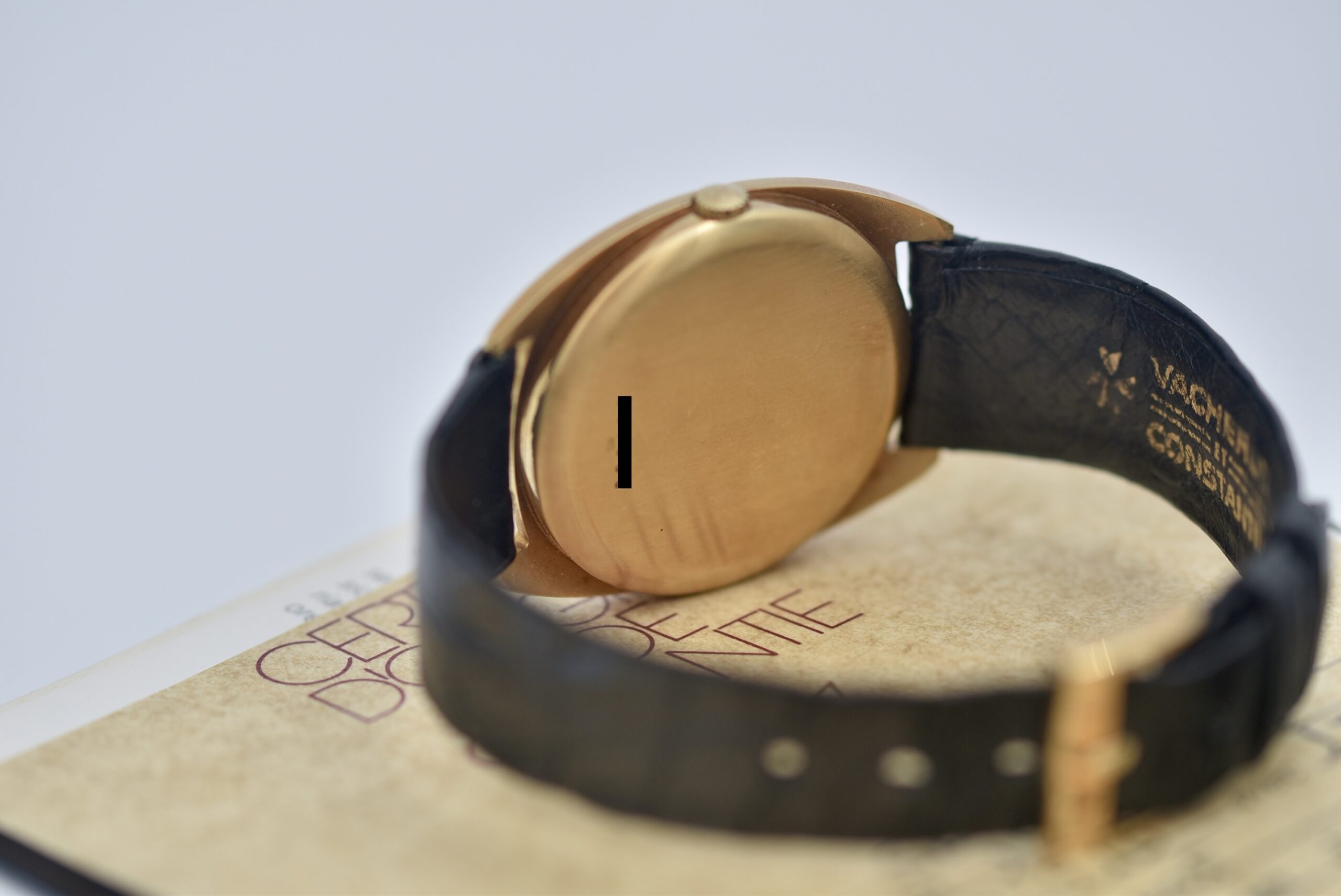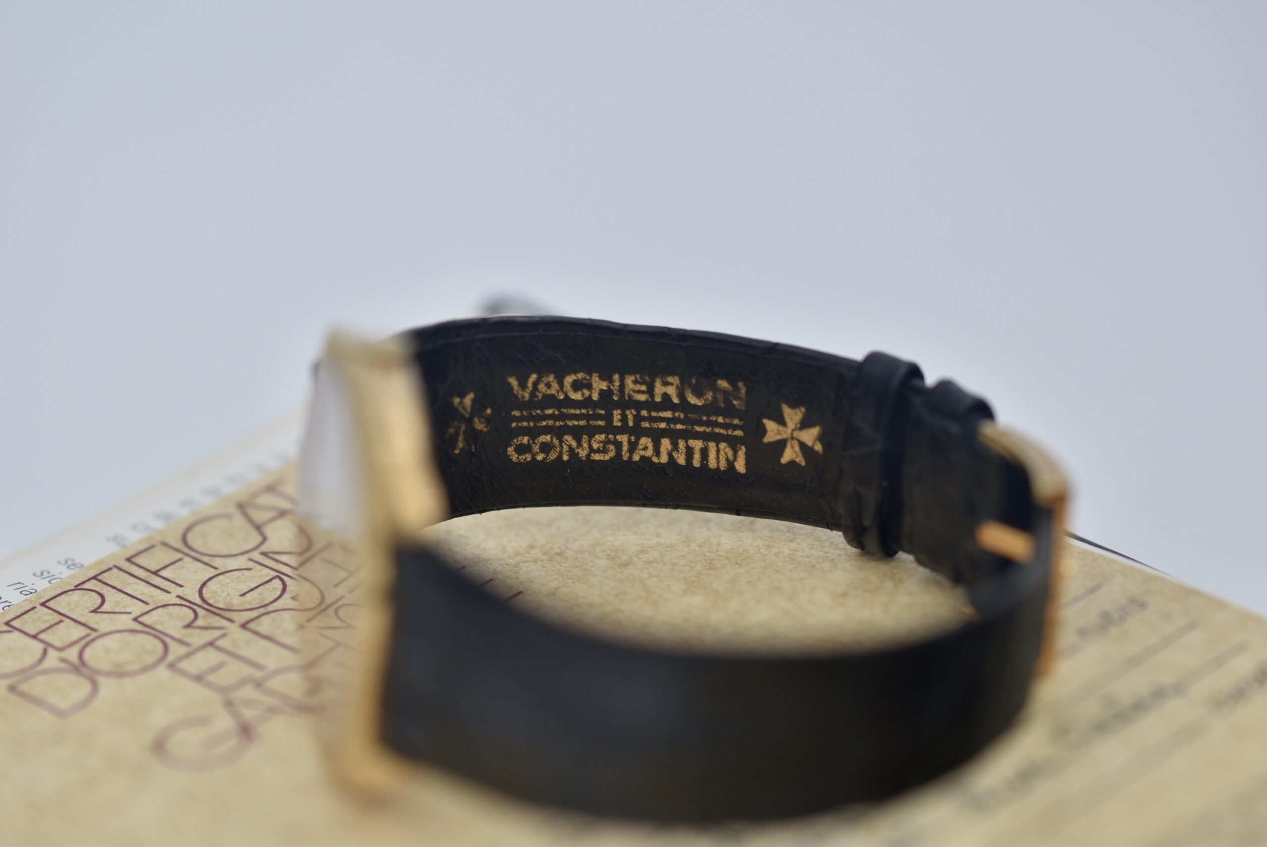 presenta una cassa in oro giallo da 33 x 45 mm ed un cinturino in pelle di coccodrillo originale nera con chiusura ad ardiglione e fibbia in oro giallo originale Vacheron Constantin.